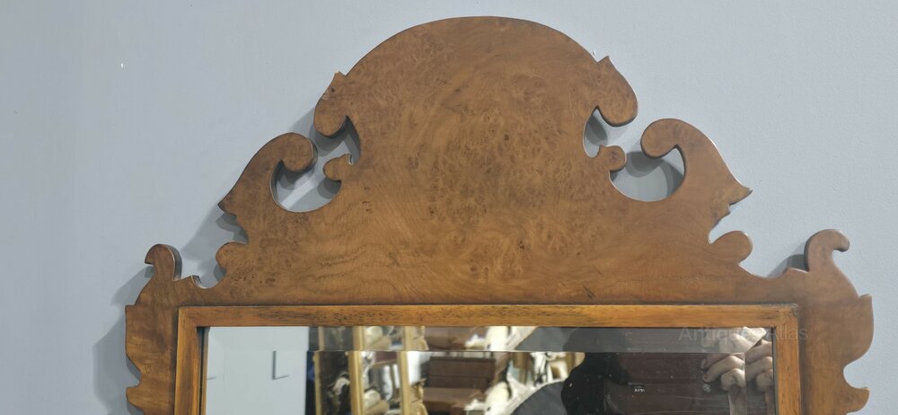 Very good Queen Anne style burr walnut wall mirror, with bevelled mirror plate, in overall very good condition.