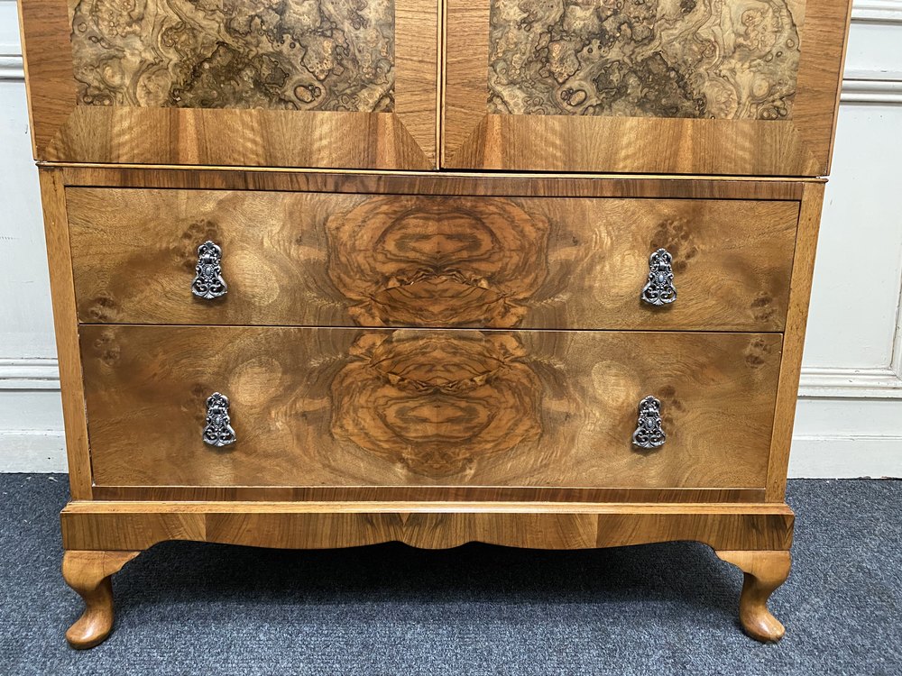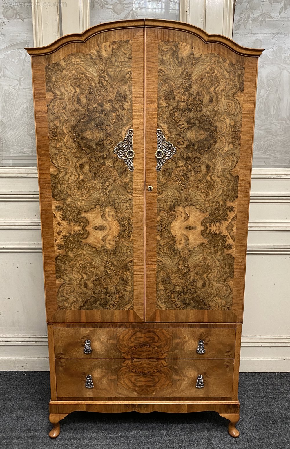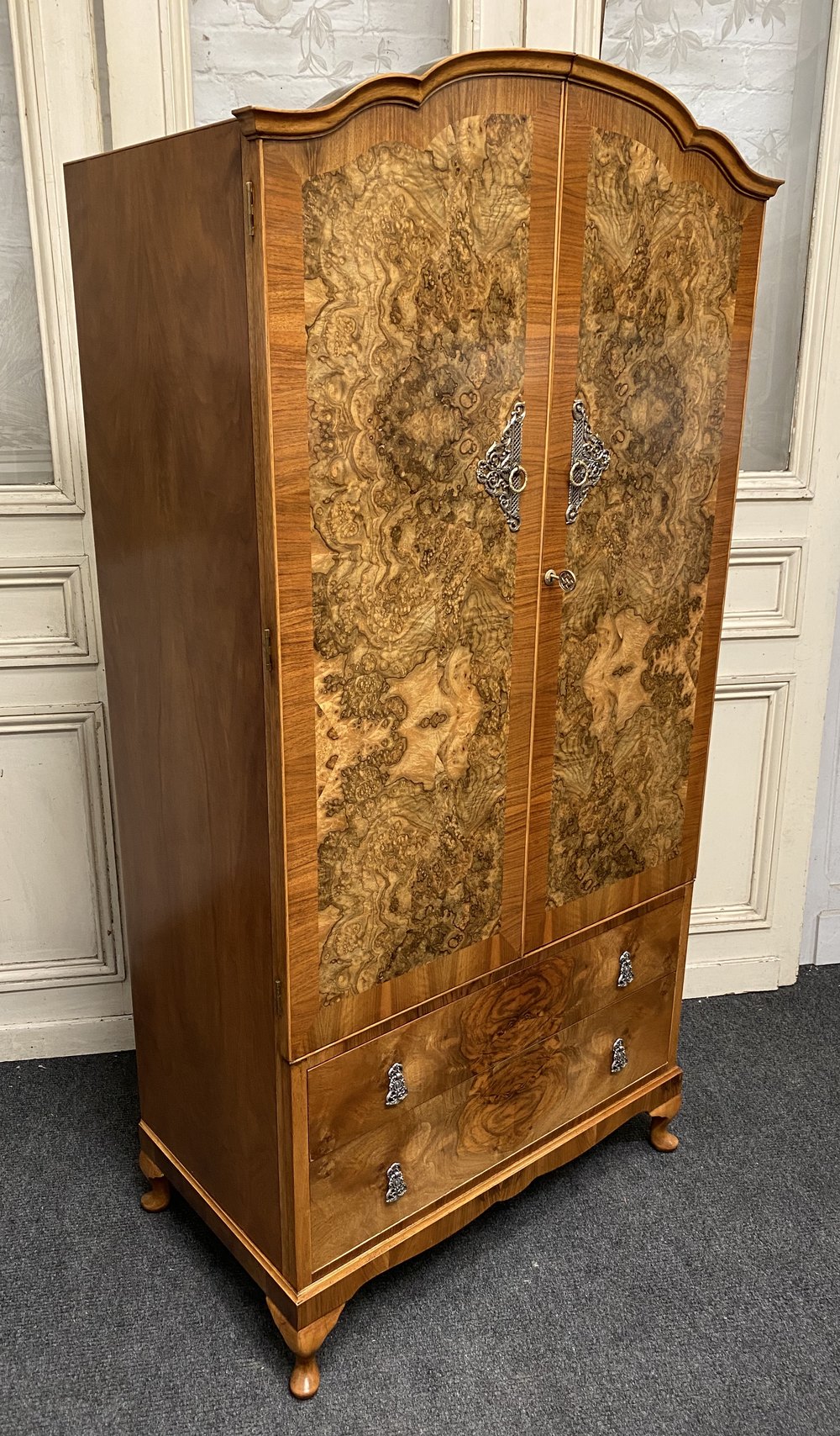 A lovely 2 door Burr Walnut Wardrobe. Having a hanging rail to the top inside and 2 drawers under.
