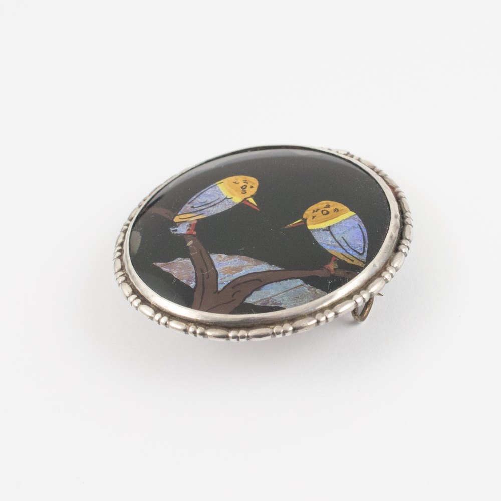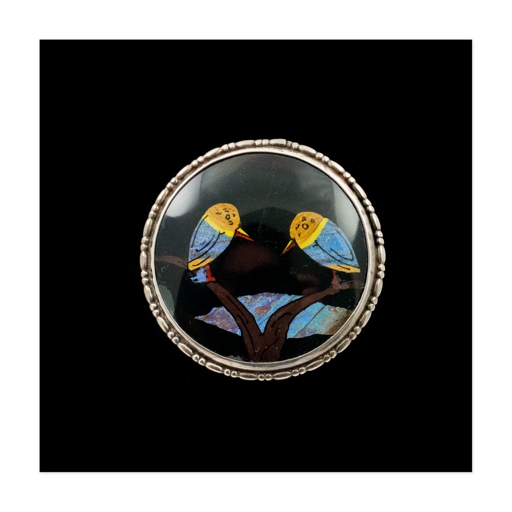 The circular brooch displays blue and yellow birds perched on a branch with river. The iridescent butterfly wing is a superb contracts with the black ground. The scene is set inside a protective crystal cabochon frame and sterling silver mount with ornate edge. The silver is stamped on the reverse. Pin slots into a C type clasp.