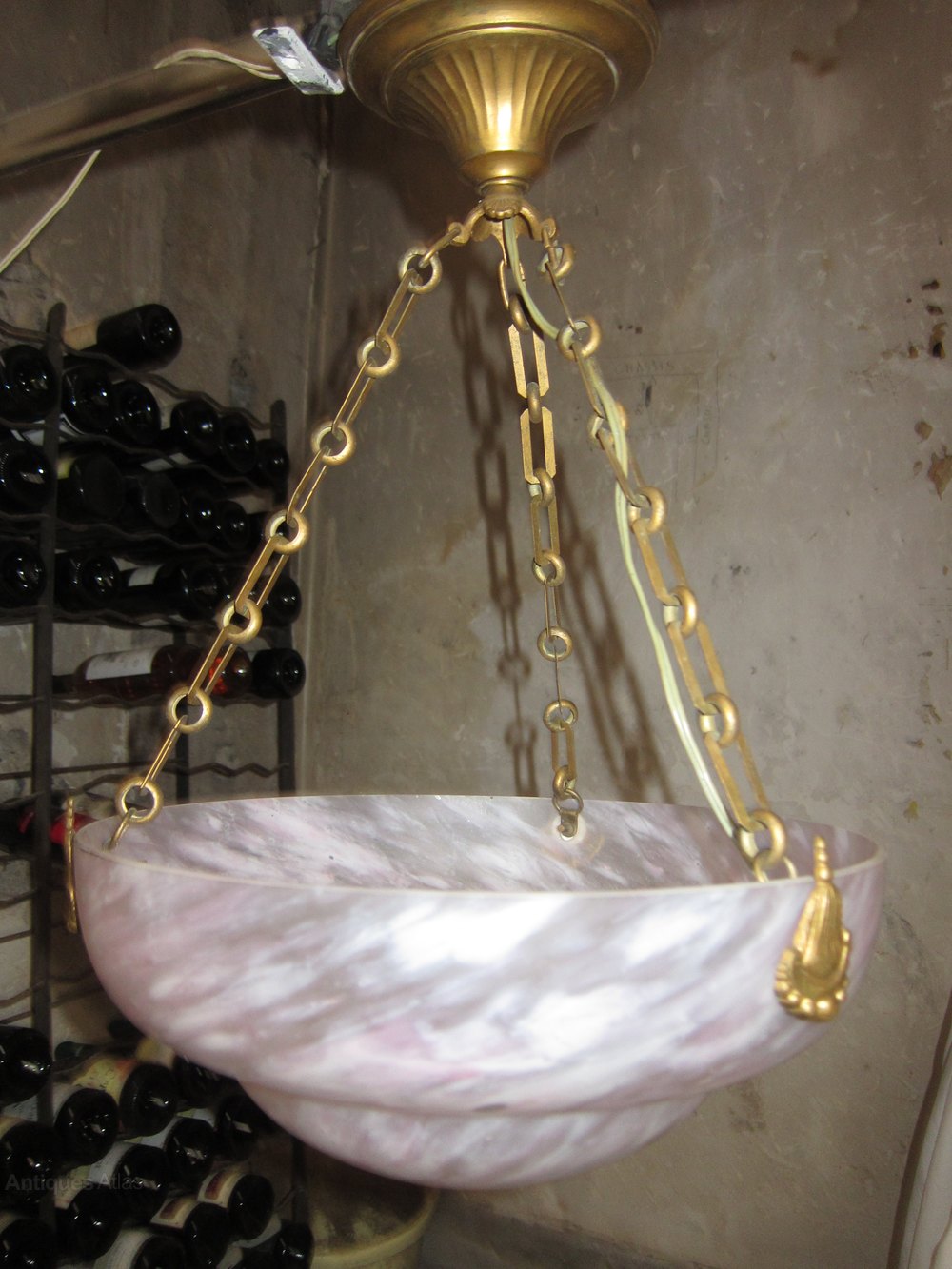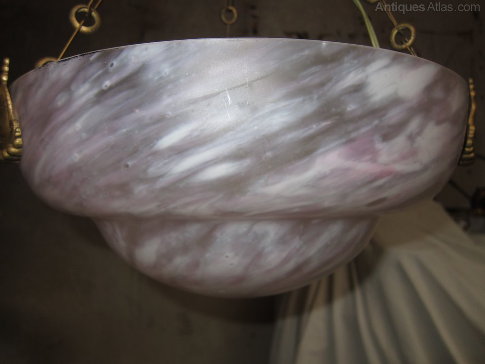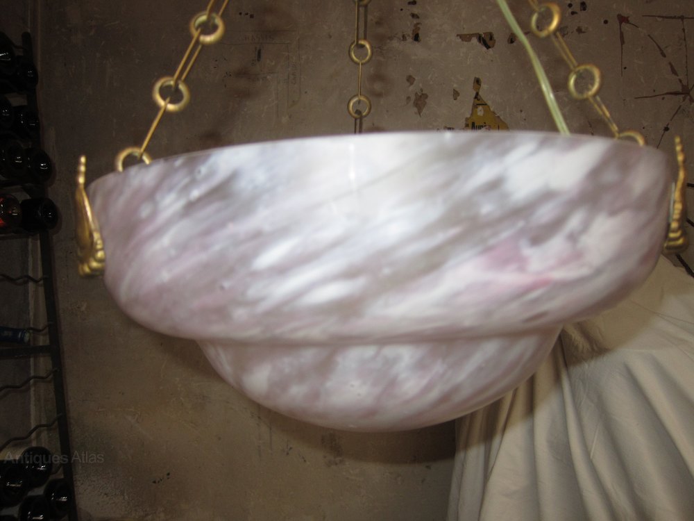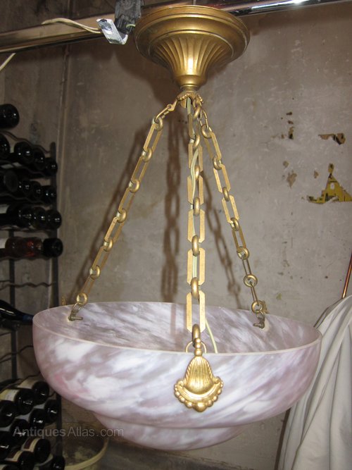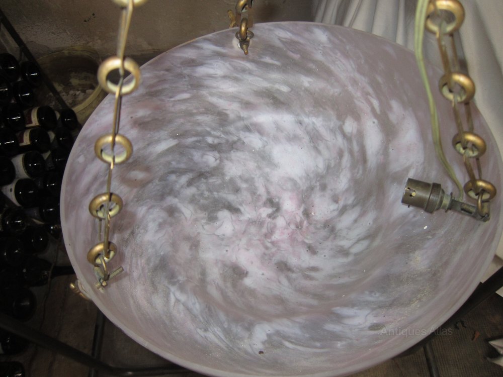 1920's French Pàte de Verre,marbled pink & purple glass, deep ceiling light. Three ormolu shields on the exterior support the chains, which in turn are attached to the ceiling rose.