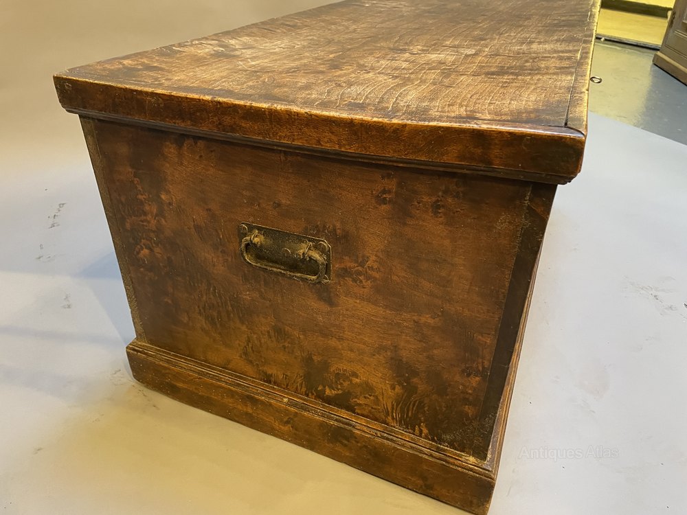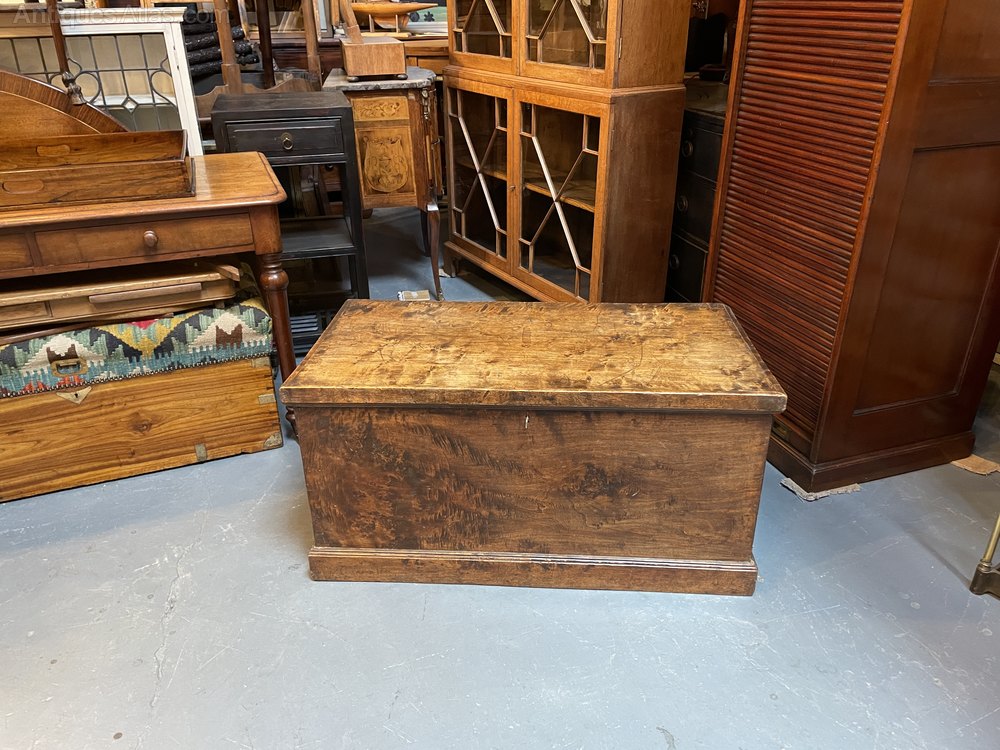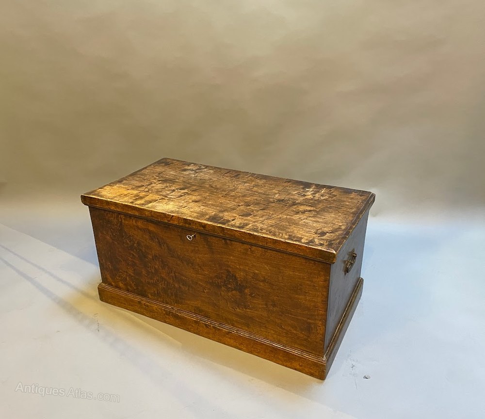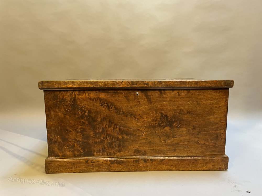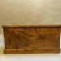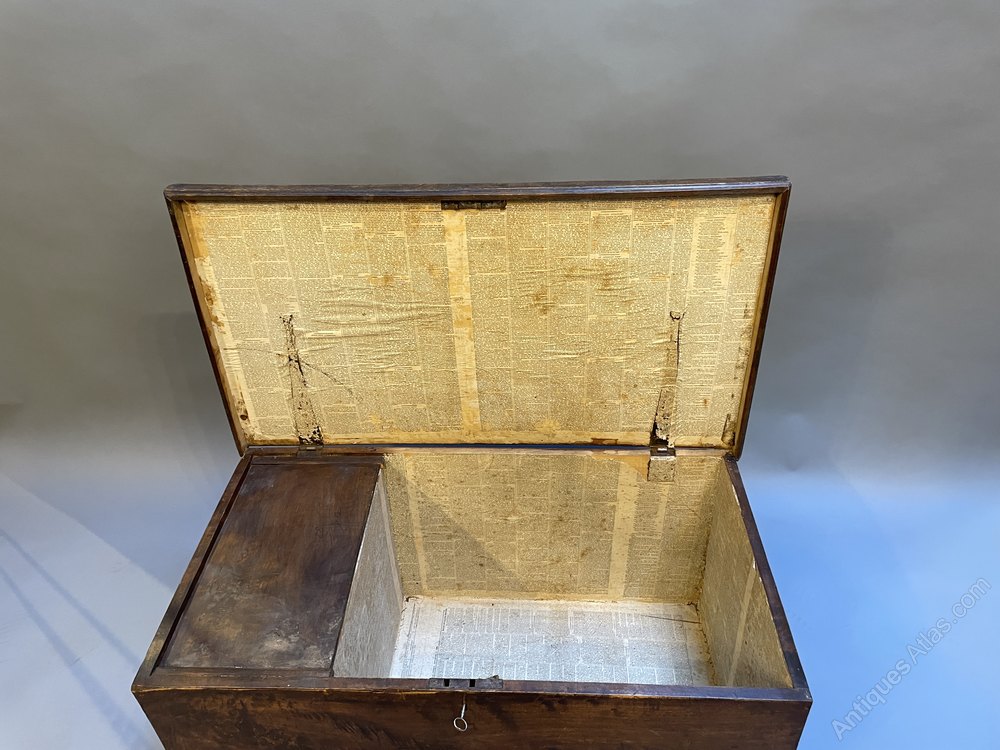 Of good colour and well figured timbers, the rising lid with section and the whole lined in contemporary (1869) newspaper, with carrying handles and raised on plinth base.