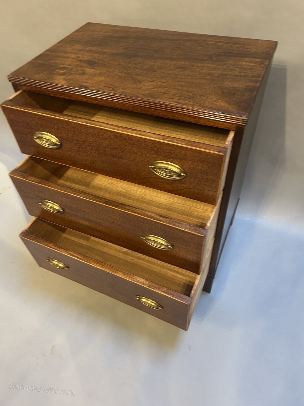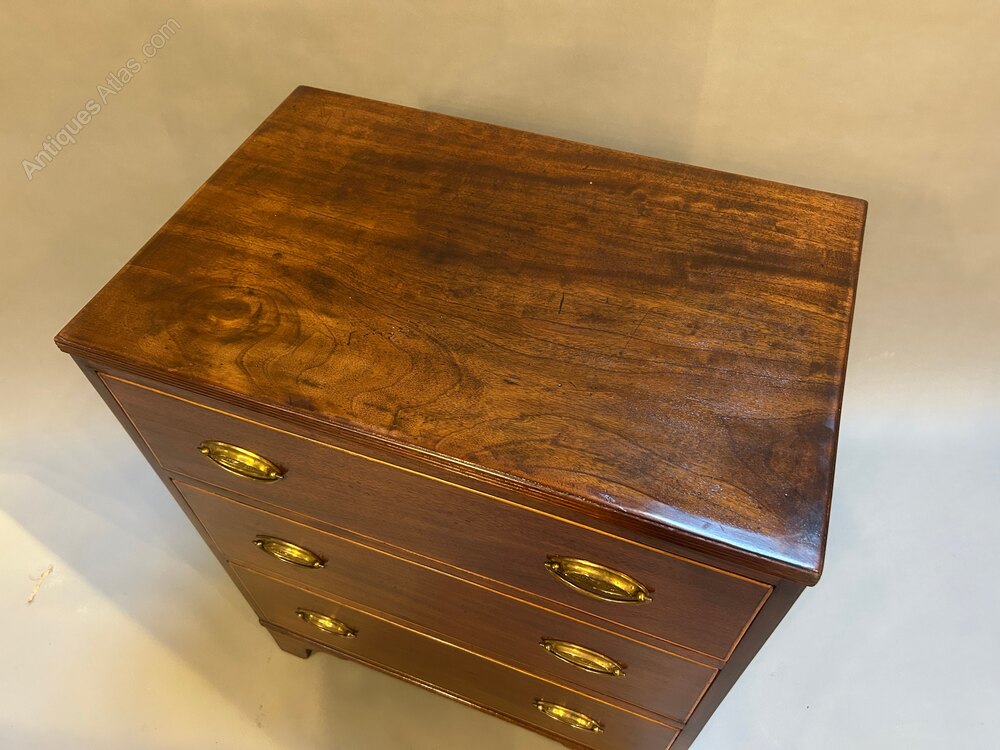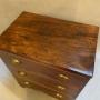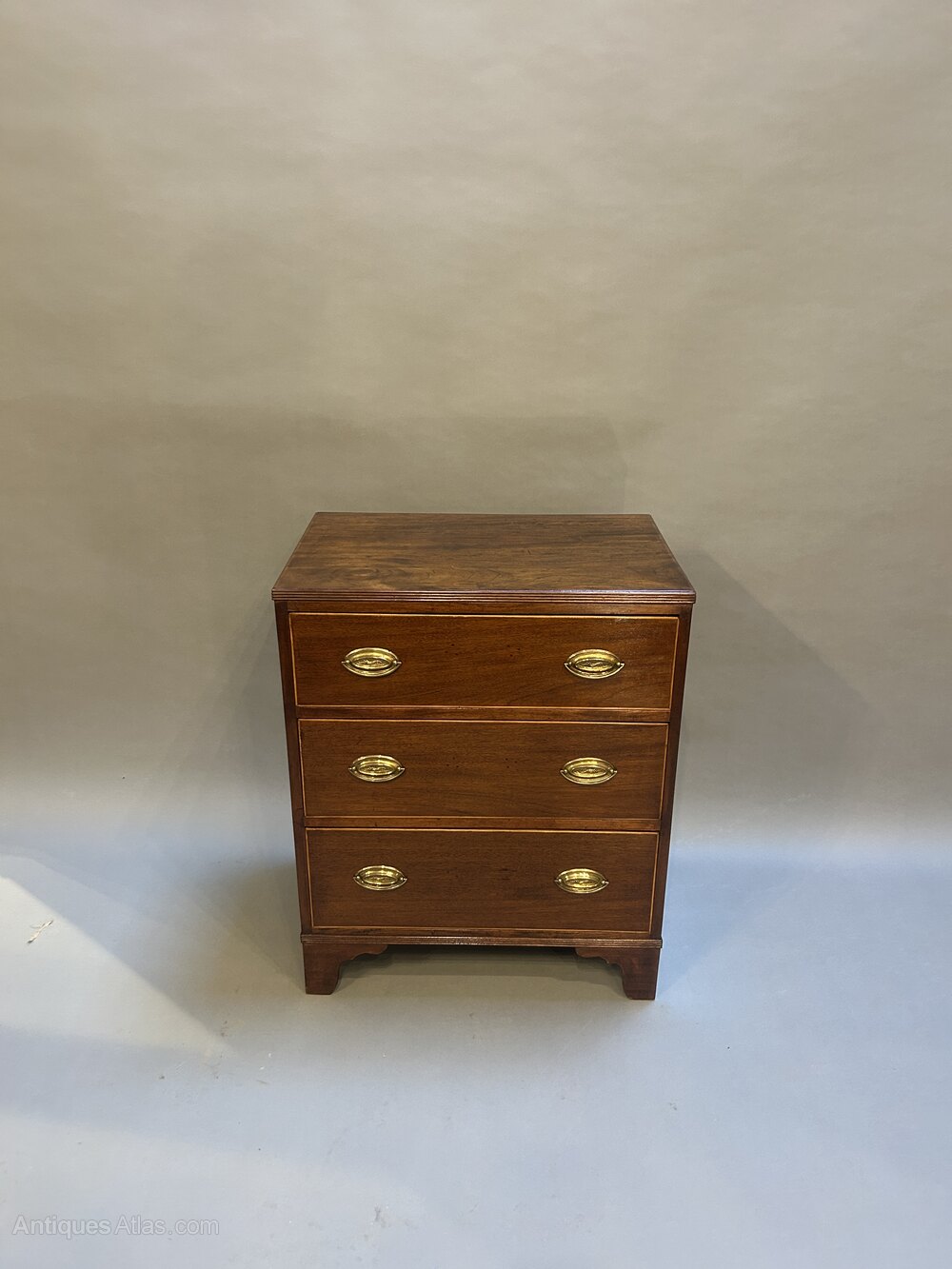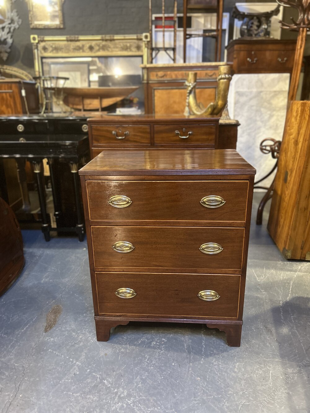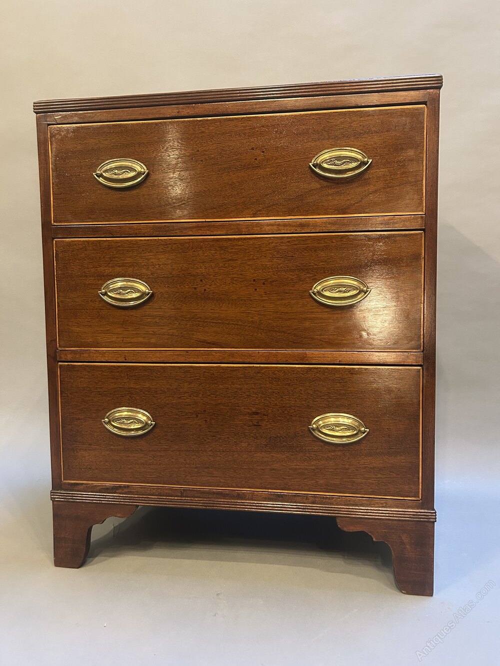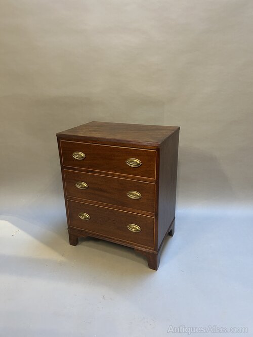 C19th mahogany of small proportions fitted 3 graduated drawers with boxwood stringing and oval plate handles, raised on bracket feet.