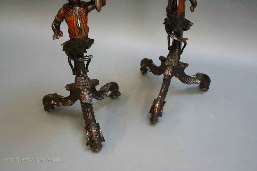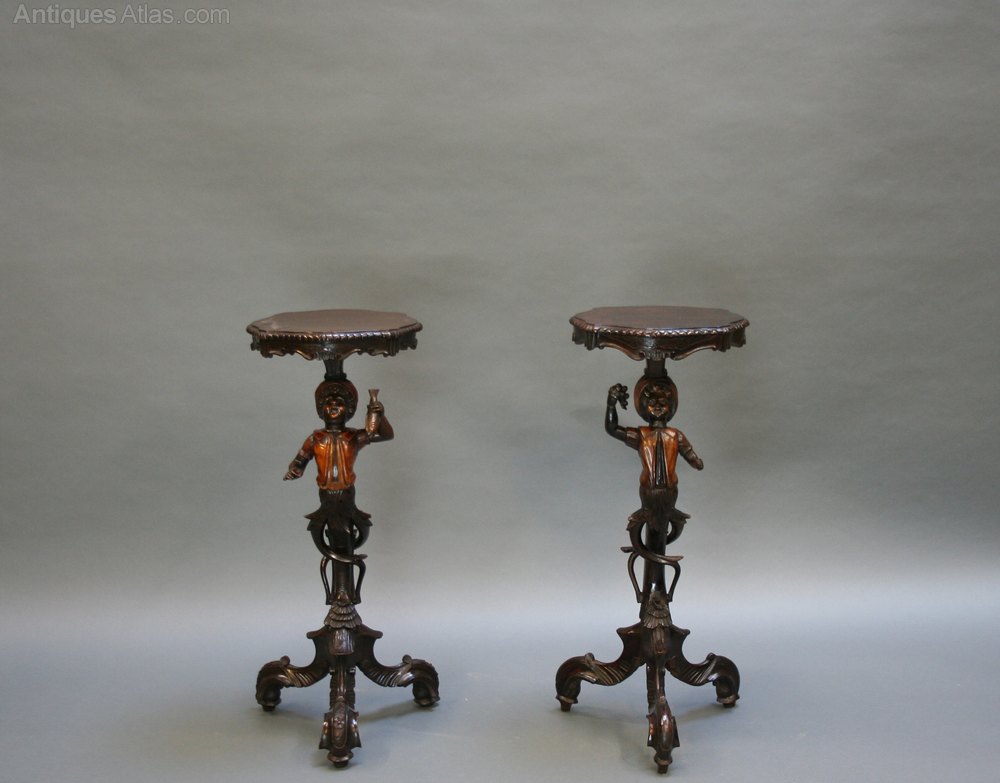 A close pair of carved torcheres, or lamp antique tables, in the form of Blackamoor figures to scrolling Rococo triple supports.