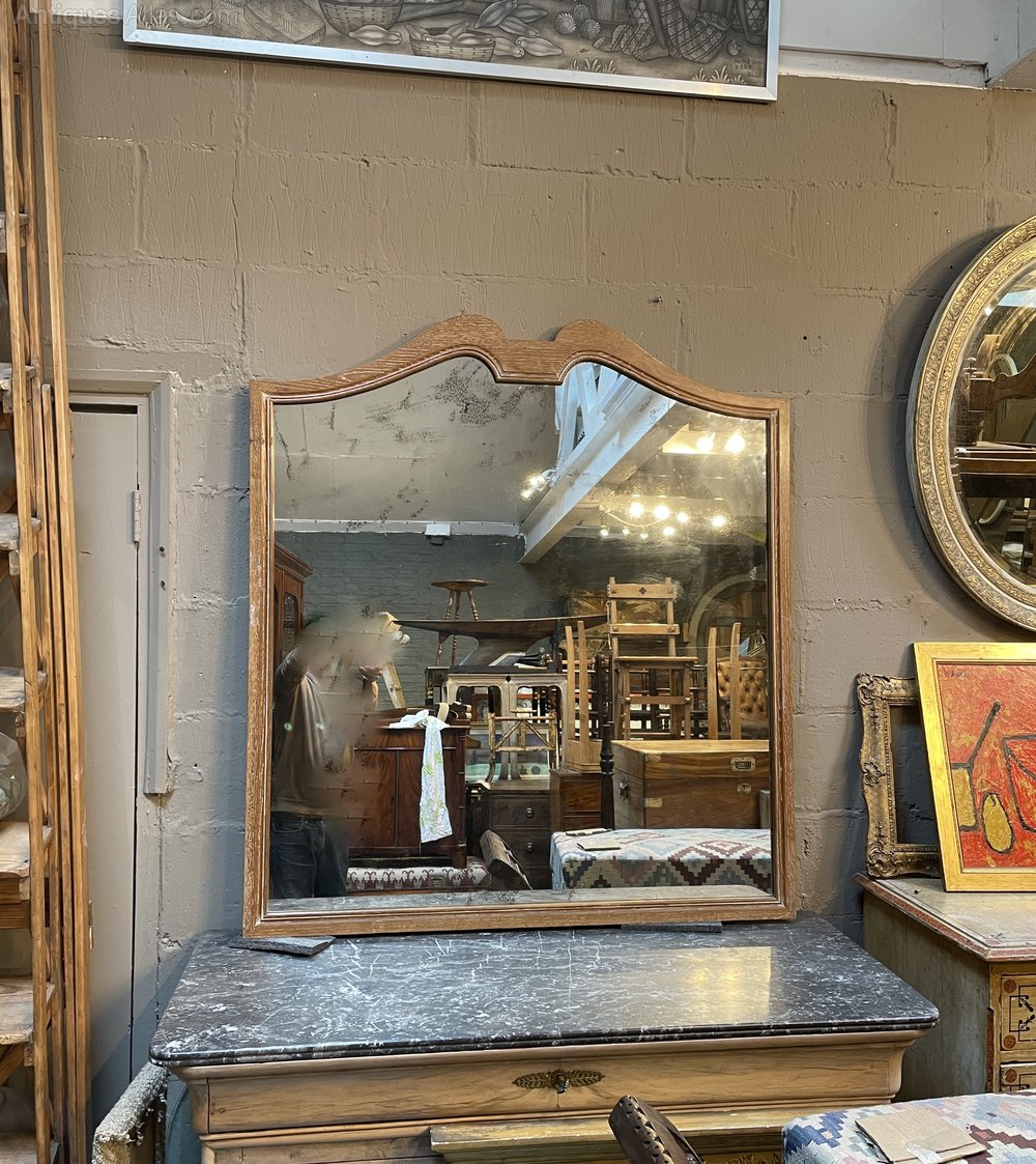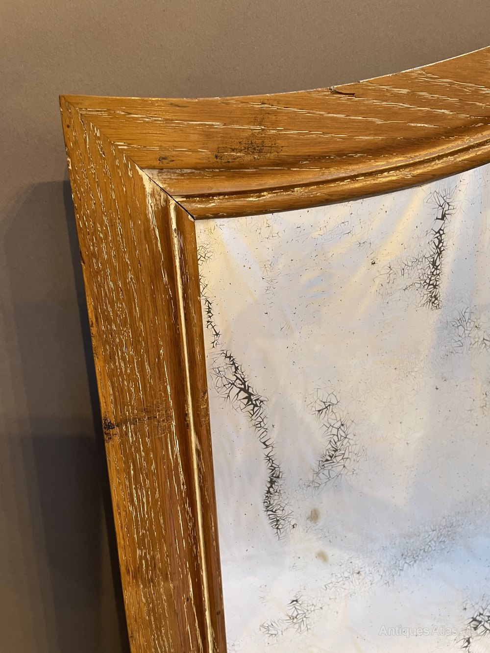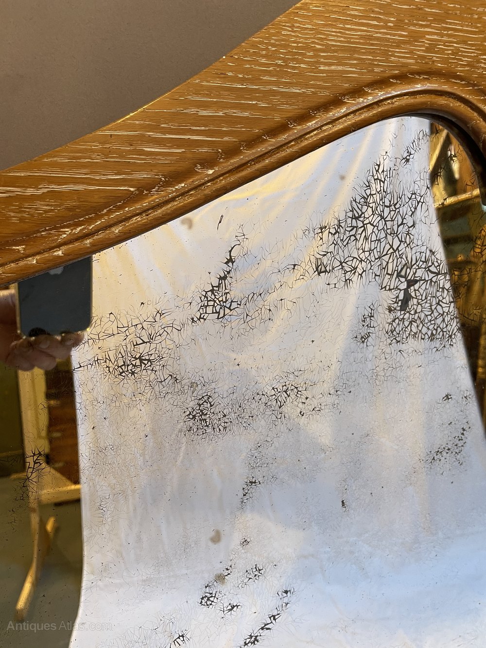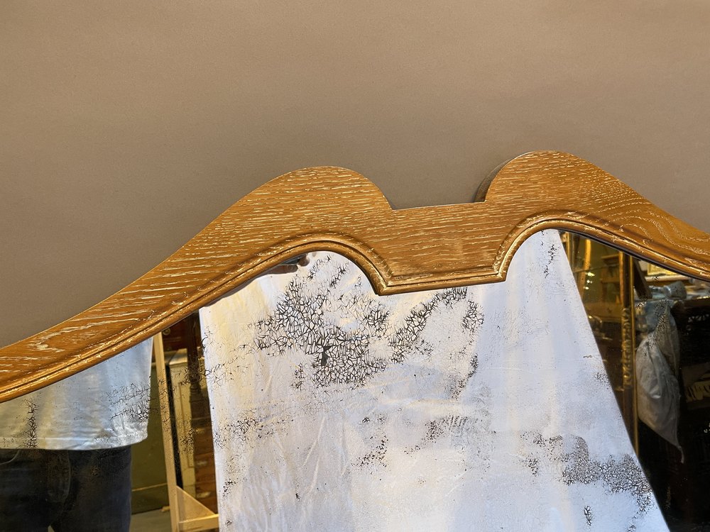 Circa 1920 overmantel limed oak with double crested top enclosing (lightly foxed) original plate.