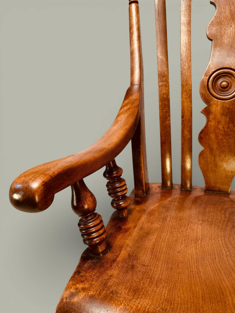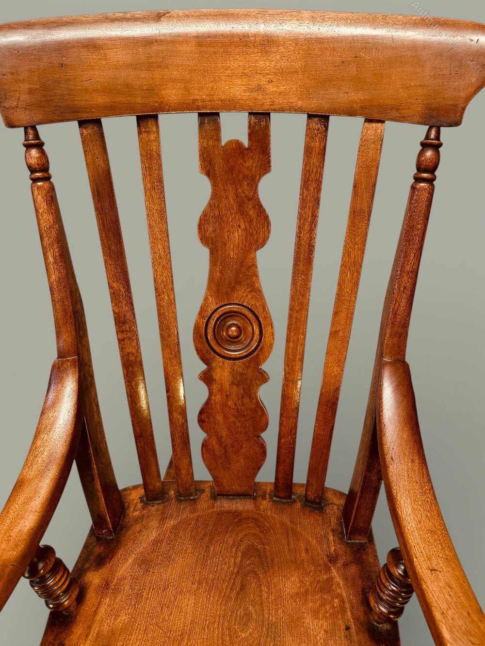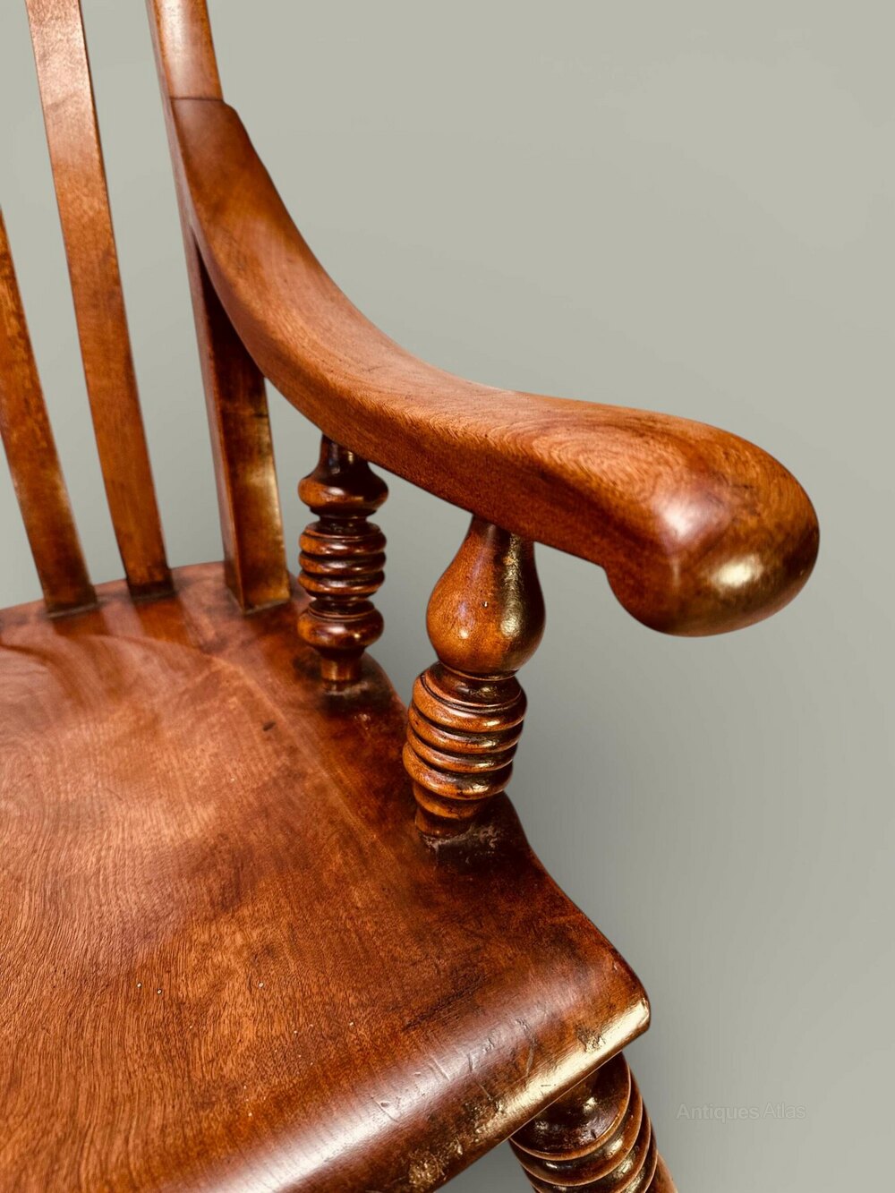 An unusual, interesting and totally original nursing rocking chair, from the Caistor (Lincolnshire) tradition, as evidenced by the multiple turning on the centre ‘H’ stretcher, unique to this tradition. (See Dr Bernard Cotton: ‘The English Regional Chair’ - Antique Collectors’ Club). William Shirley ran a chair making workshop in this small Lincolnshire village between 1846 and 1890, in which various makers worked under their own name, notably John Shadford, to whom the design of the definitive ‘Caistor’ chair is attributed, being very similar in form to this chair, low seated, low arm bow and on rockers, but having an arrangement of turned back uprights with two rows of turned spindles in the back. This chair is interesting in having an unusual shaping to the sides of the seat (see photos). Alder was commonly used by the Caistor makers alongside ash and elm, but unusually this whole chair is made in alder (often referred to as Scots mahogany, due to the fleck in the grain).