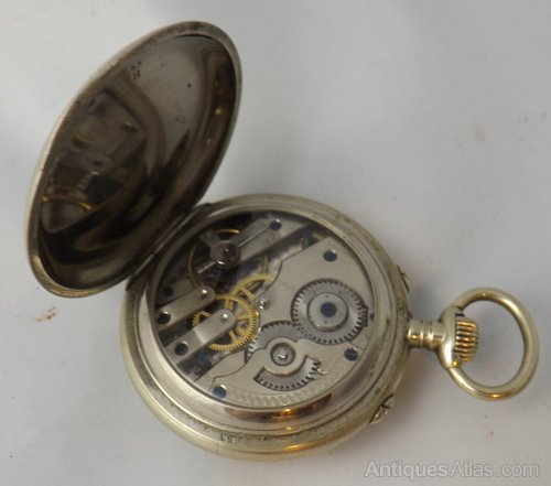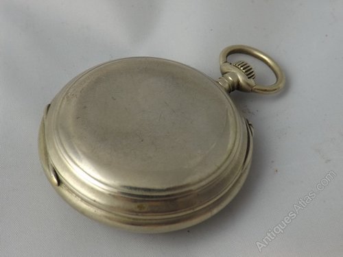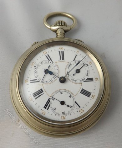 A silver multi-dial pocket watch showing seconds, days of the week and month. A glass inner cover showing the mechanism. Circa 1900.