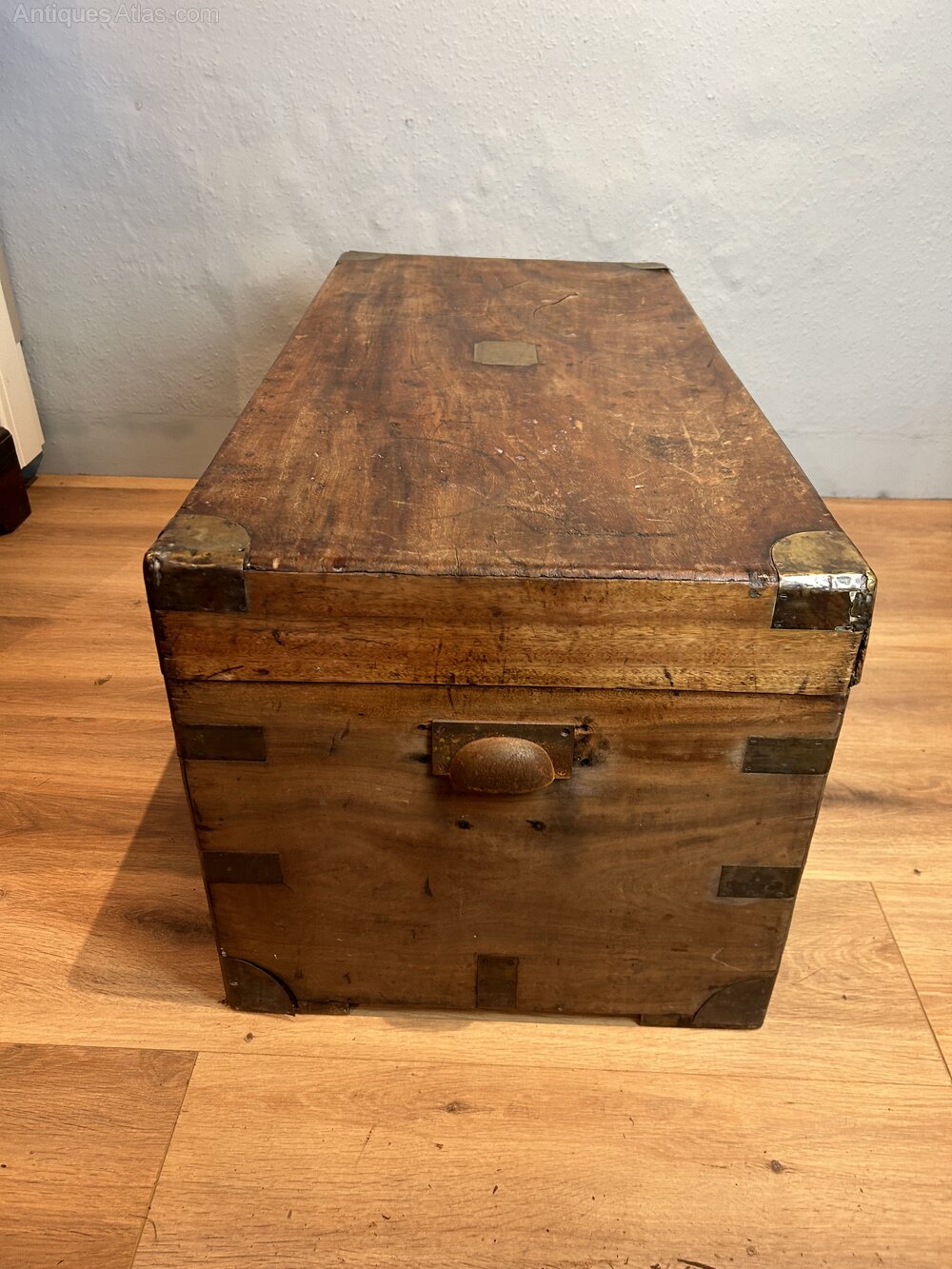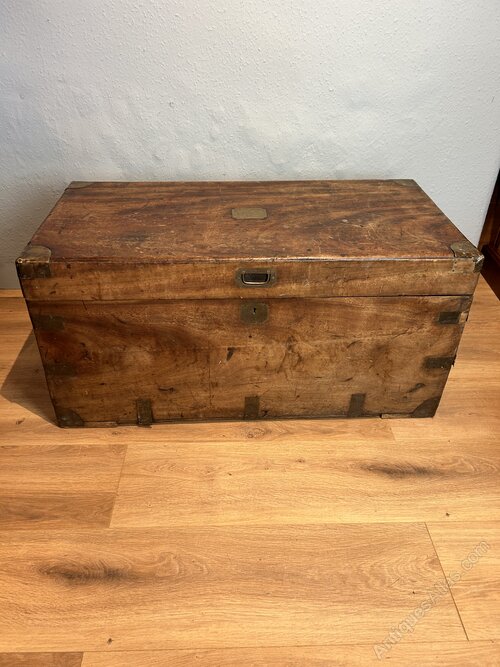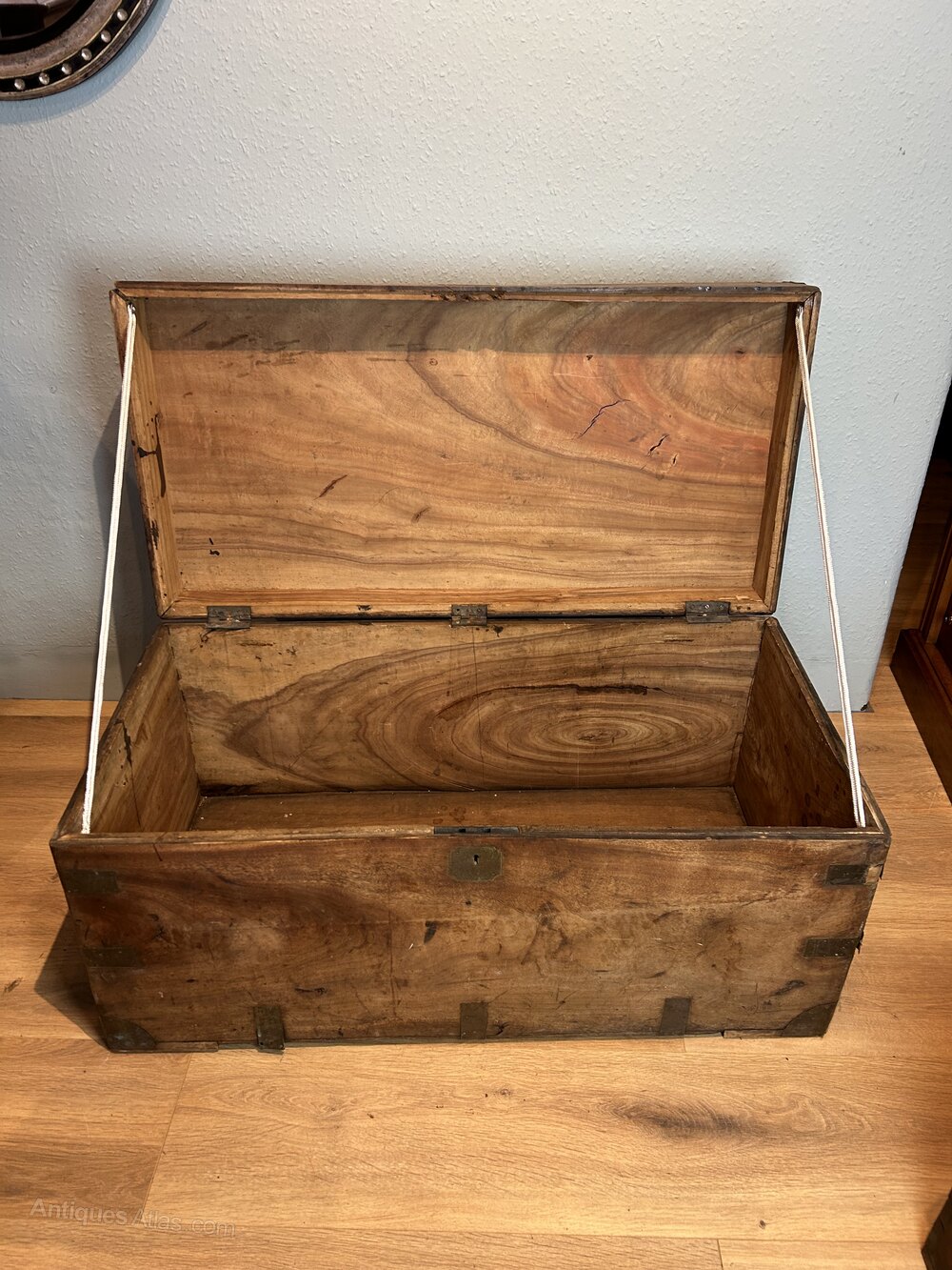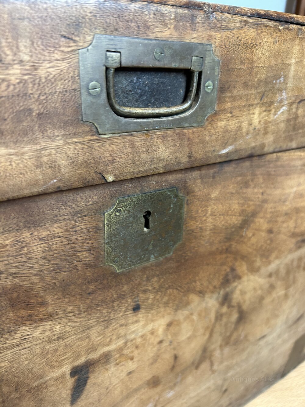 Large camphor wood campaign trunk/chest with brass fittings and carrying handles circa 1880. This large late 19th century, well figured Camphorwood chest, has a richly coloured patina. Retaining its original, brass bindings and carrying handles to each side. This chest would make an excellent coffee table, doubling up as a blanket chest/storage.