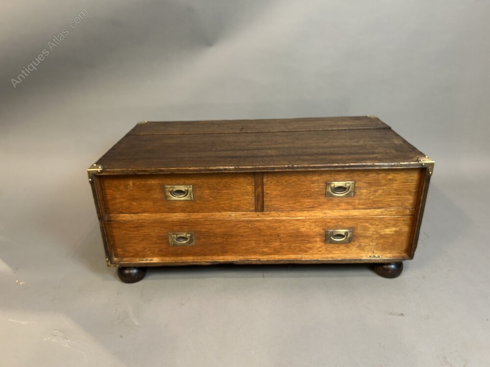 Late C19th mahogany fitted 2 short over long drawers with recessed brass handles, brass corners and side lifting handles, raised on later bun feet.