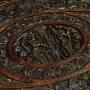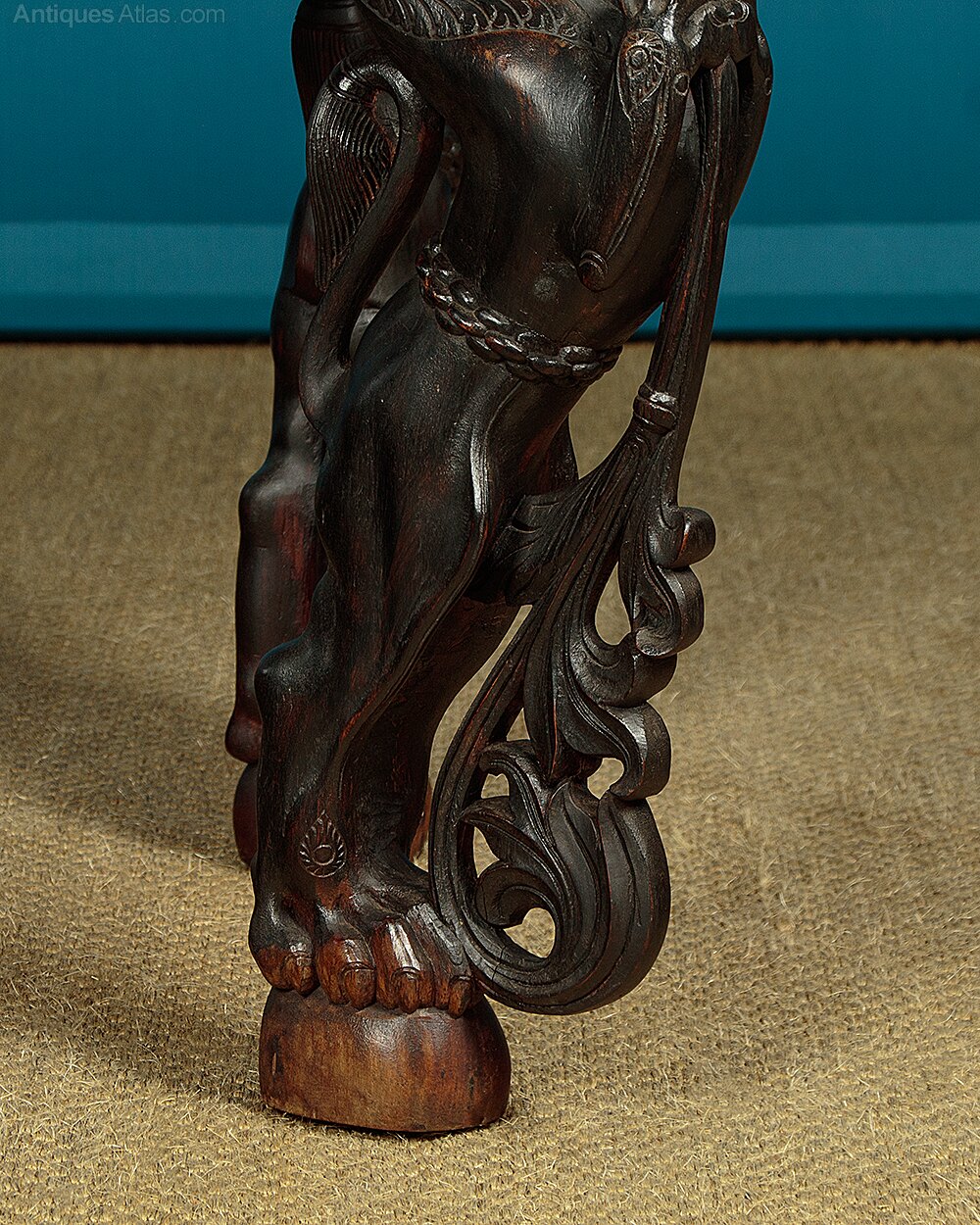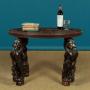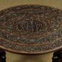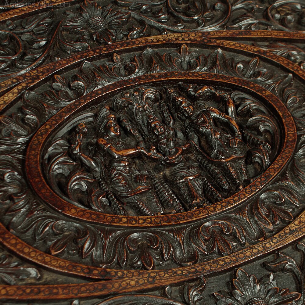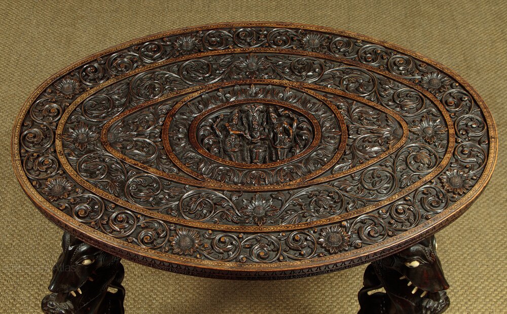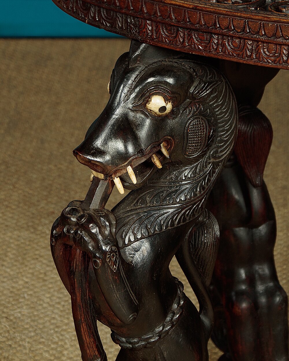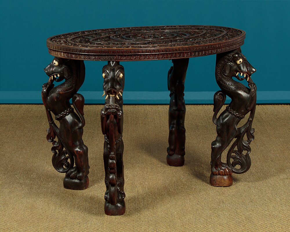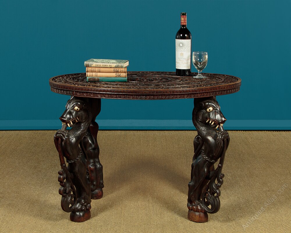 Unusual Anglo-Indian carved hardwood coffee table c.1900. 36" x 24" oval table top carved with a central image of the Hindu Trimurti of the Gods Brahma, Vishnu and Shiva surrounded by crisply carved borders of scrolling foliage and flower heads in more typically European style. Raised of four exceptional legs carved as spectacular mythical beasts with inlaid bone teeth and eyes, stood on their rear legs and gripping pierced foliage in their front paws and mouths. Note their curving tails, the chains around their waists and the carved decoration. Missing a few of the teeth, otherwise excellent condition, cleaned and waxed in our workshops.