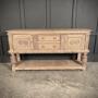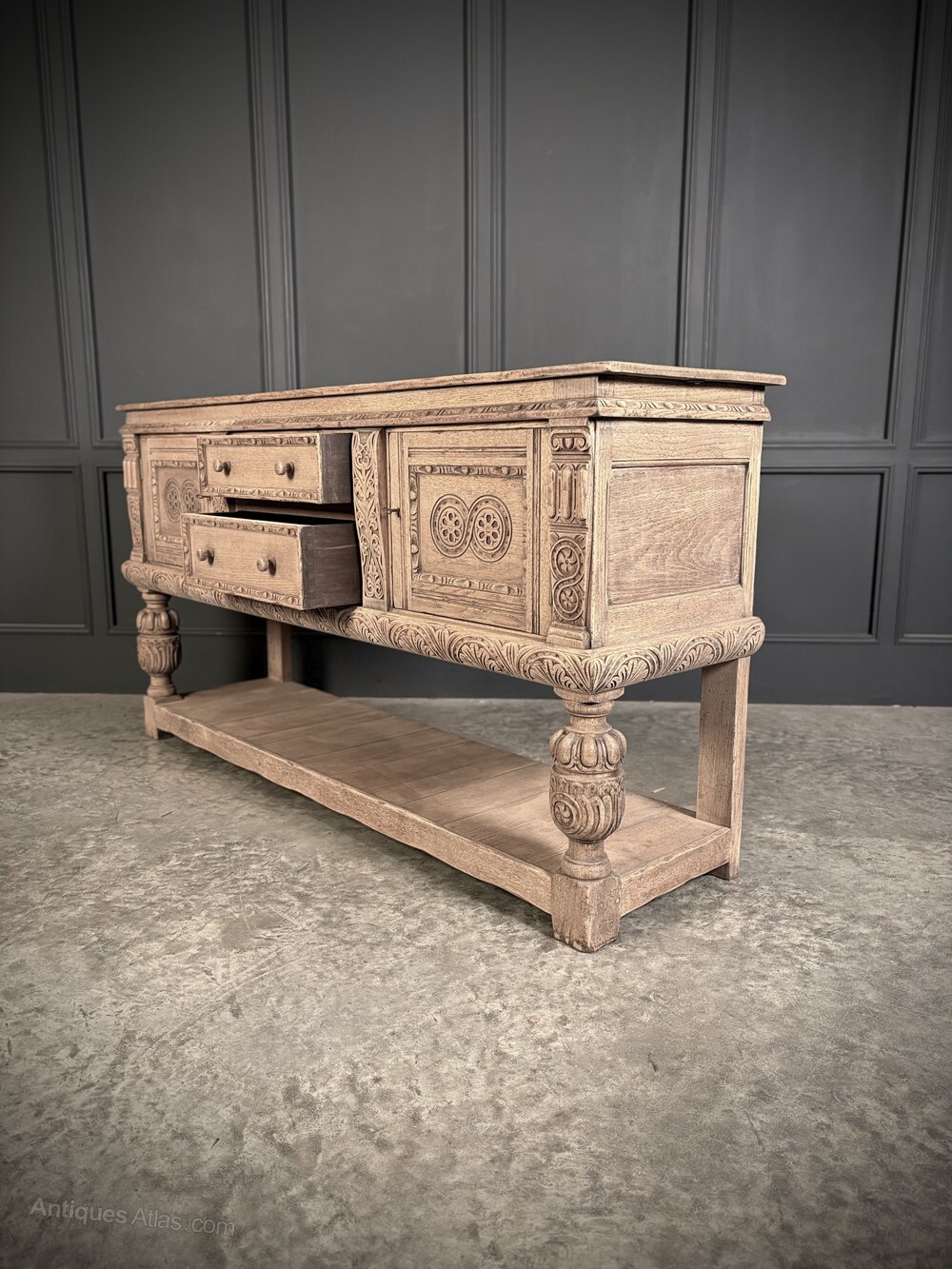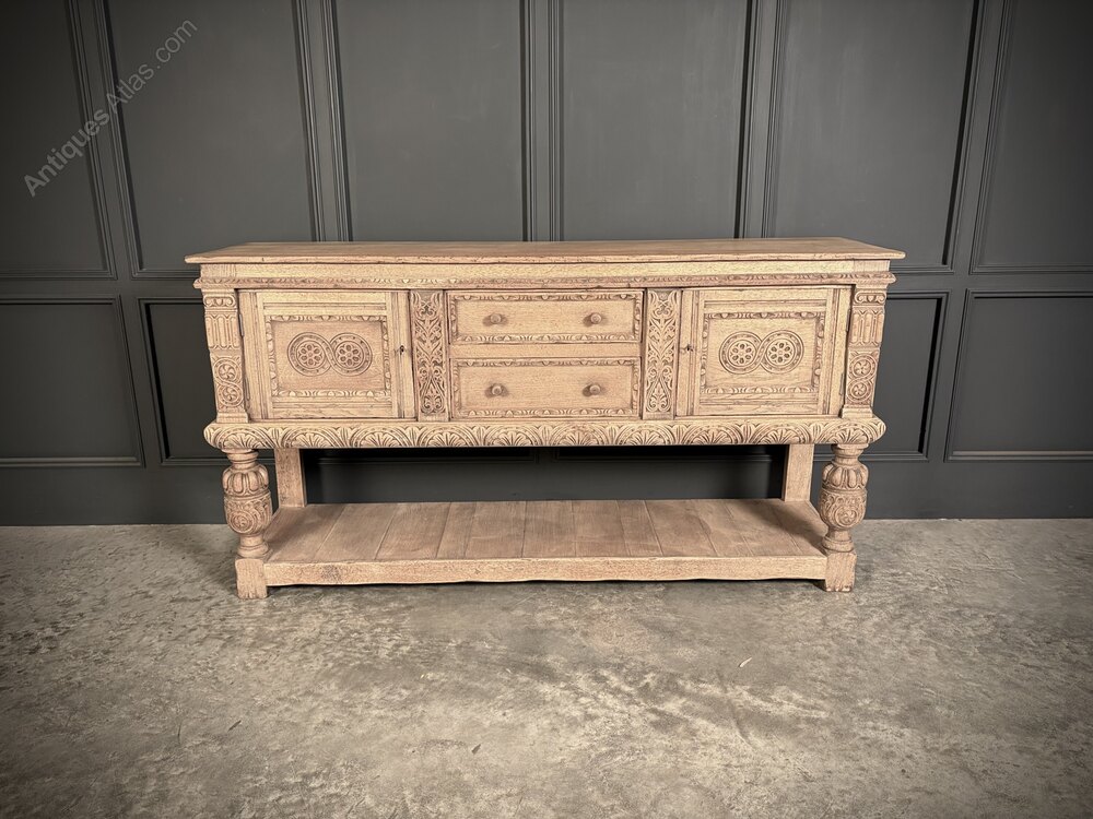 A beautifully carved bleached oak sideboard, circa 1920, featuring rich hand-tooled detailing throughout.