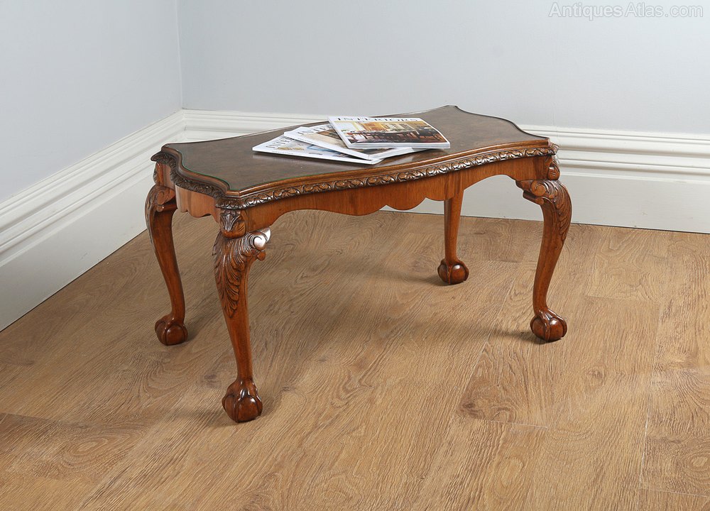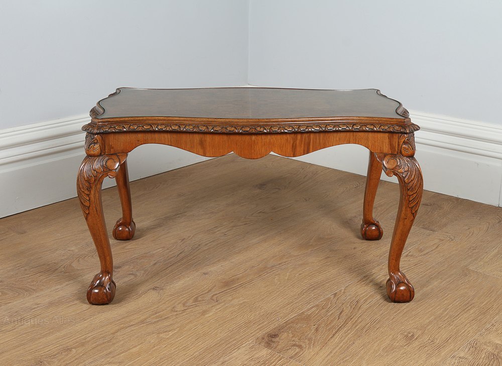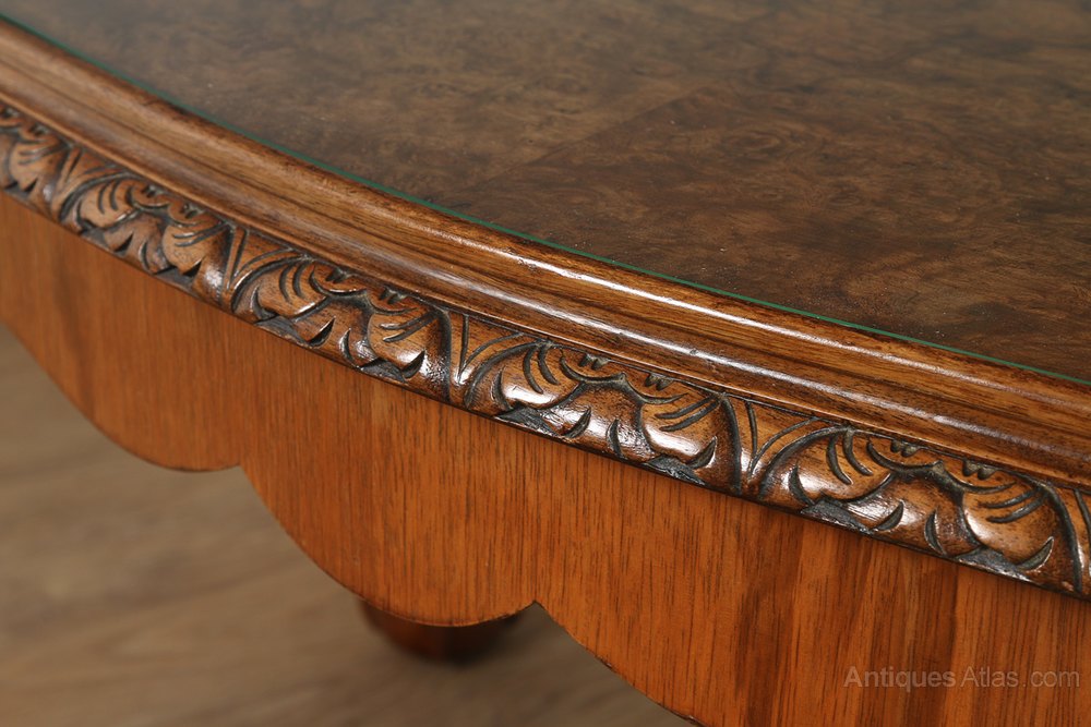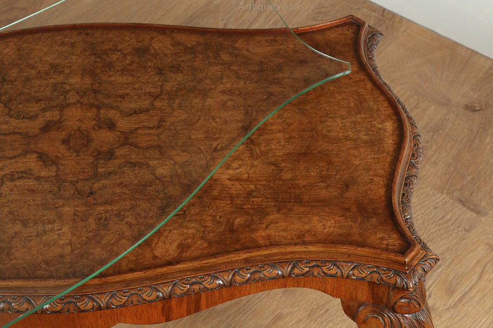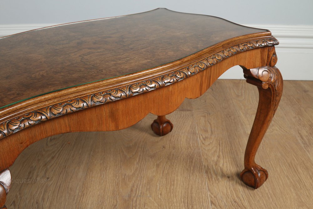 Condition This coffee table is in excellent original condition. There is an excellent colour and patination to the timber. The table is constructed of solid walnut with a stunning burr walnut veneer top. The floral carving to the moulding and frieze is complete and also in excellent condition. The removable shaped glass top is also in excellent condition and is free of any damage, scratches or chips. As it boasts the original polish, it has a fantastic colour and patination this can only be achieved through age and years of care and cleaning it has received. This item is solid in joint (does not wobble) and ready to use.