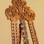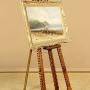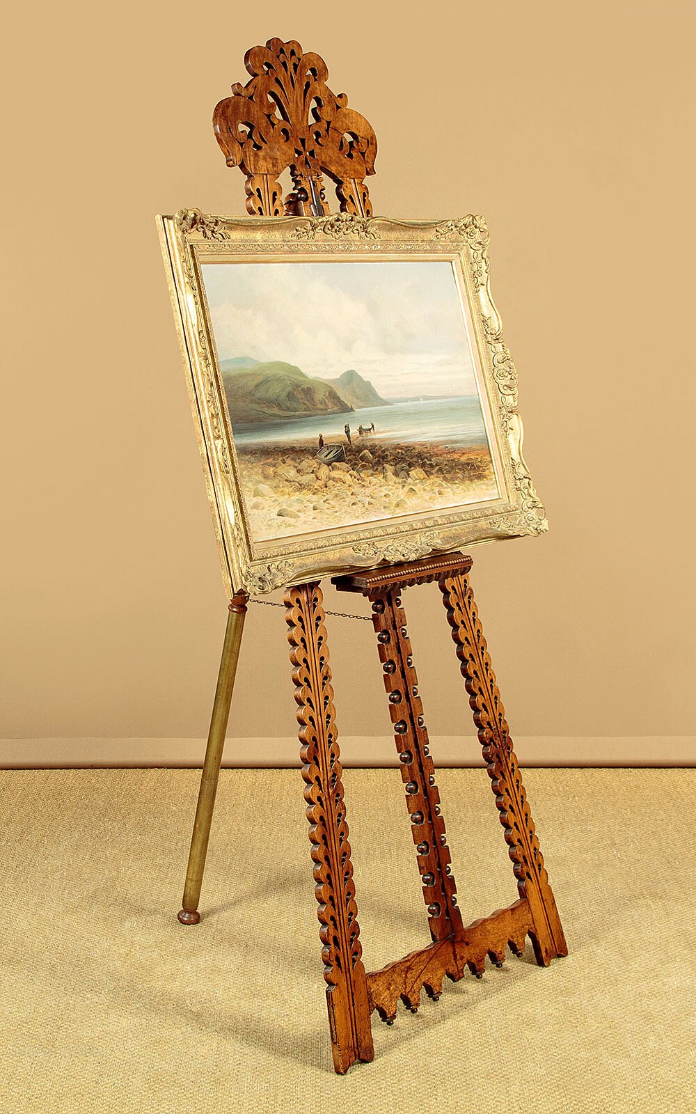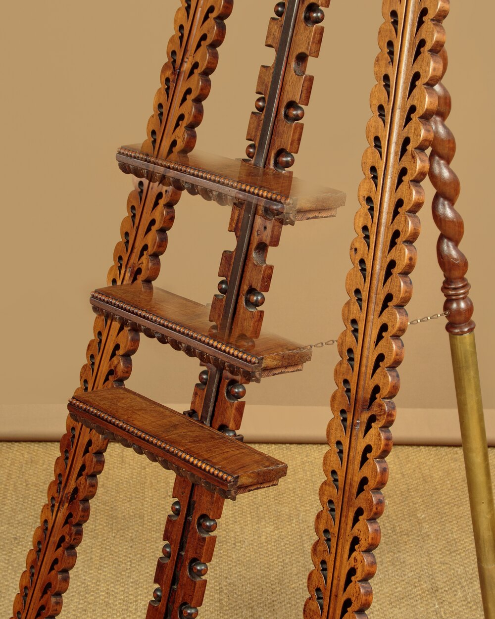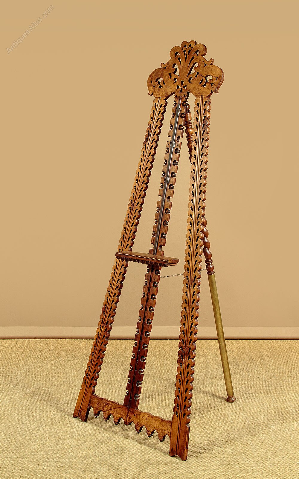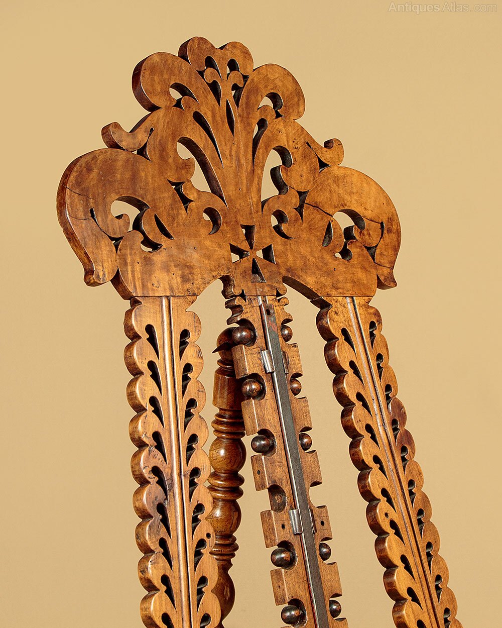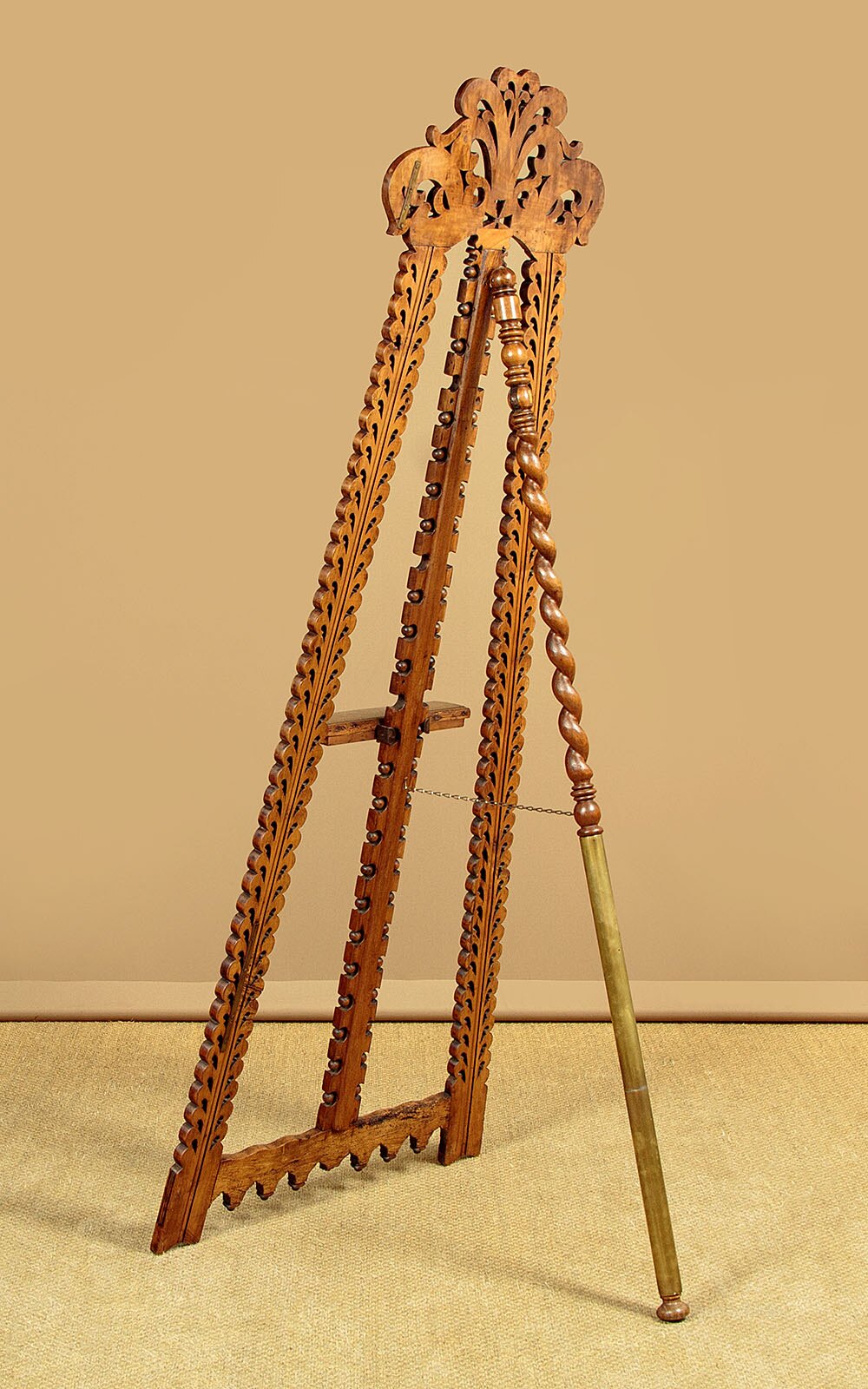 Unusual French carved cherrywood display easel c.1860. Cherrywood A frame with adjustable ledge to hold a large picture. Elaborately carved and pierced uprights topped with a spray of scrolling foliate forms pierced with a flared cross pattée. The ledge slides up and down on a metal stay, locking into the central ratchet with a brass bolt on the underside. Folding rear leg turned and twist carved, with the lower portion in brass with a turned wooden foot and secured with a brass chain. Some old wear but generally very good condition. Restored cleaned and waxed in our workshops.