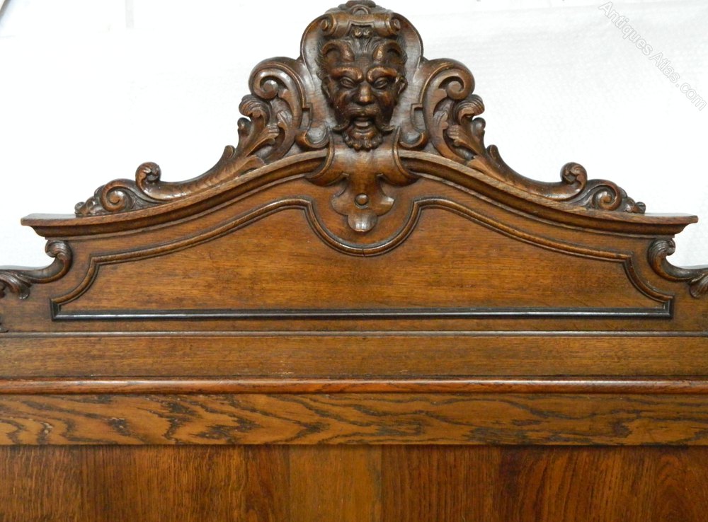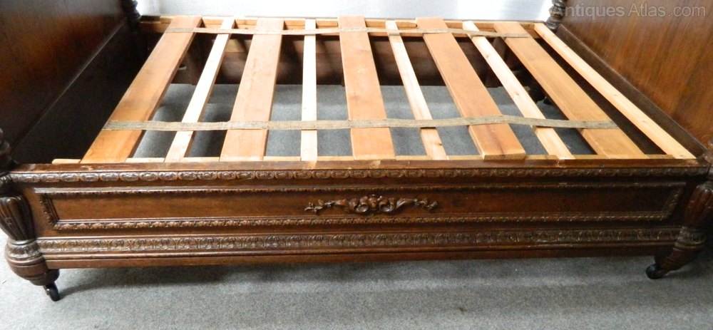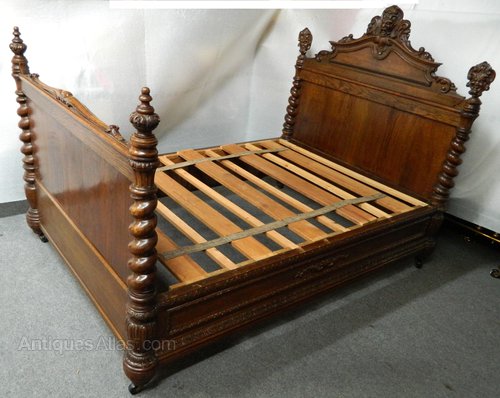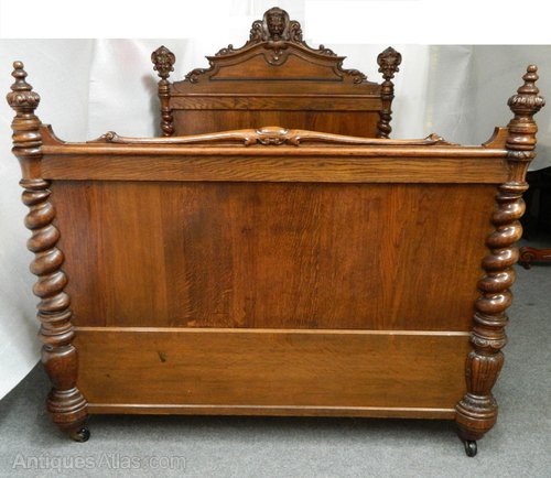 the headboard with fabulous carved masks and barley twist columns, one decorative carved side rail and one plain wood side rail (typical of french design), the footboard with carved barley twist columns, fitted with castors for ease of movement.