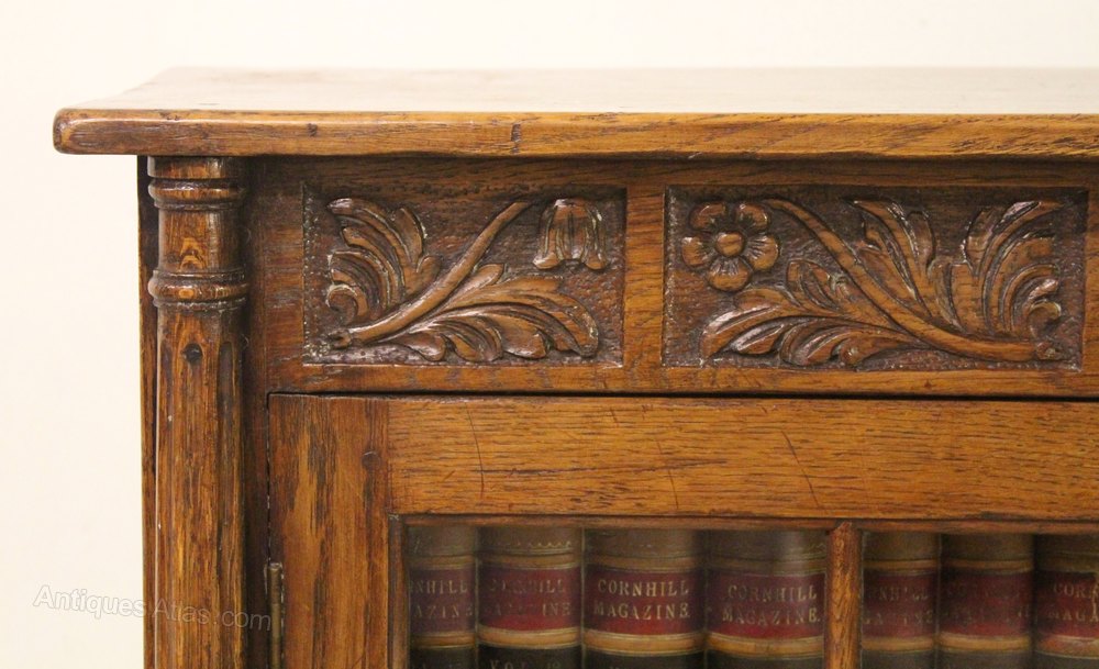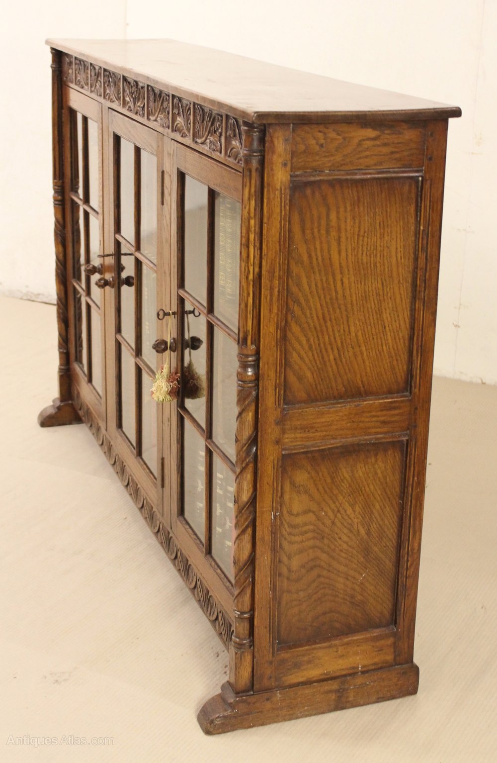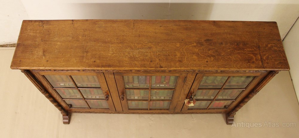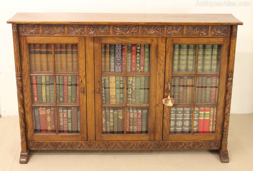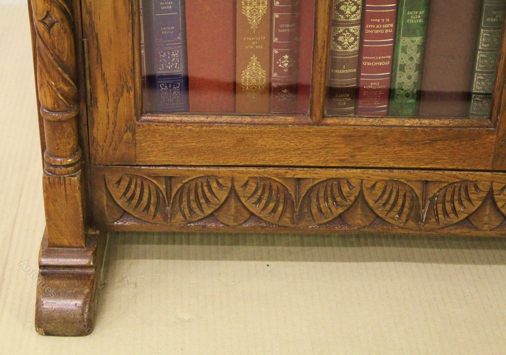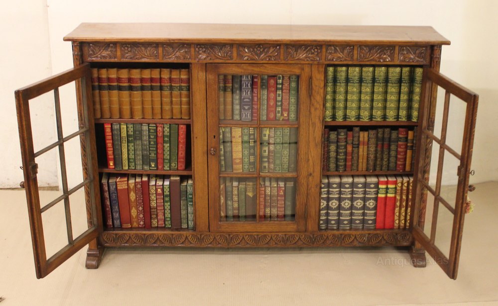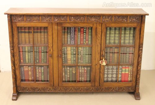 A lovely early 20th century oak glazed bookcase with carved decorations. Very well made in solid English oak, now with a good mellow colour and patina and with 3 opening glazed doors. Each door is lockable (key supplied) and opens to access shelved interiors. This bookcase provides ample storage capacity for your books. The doors are flanked by fluted and turned columns to the sides and decorative carved panels above and below. The two sides are of fielded panel construction. It is offered for sale in excellent original condition, ready to go straight into the home.