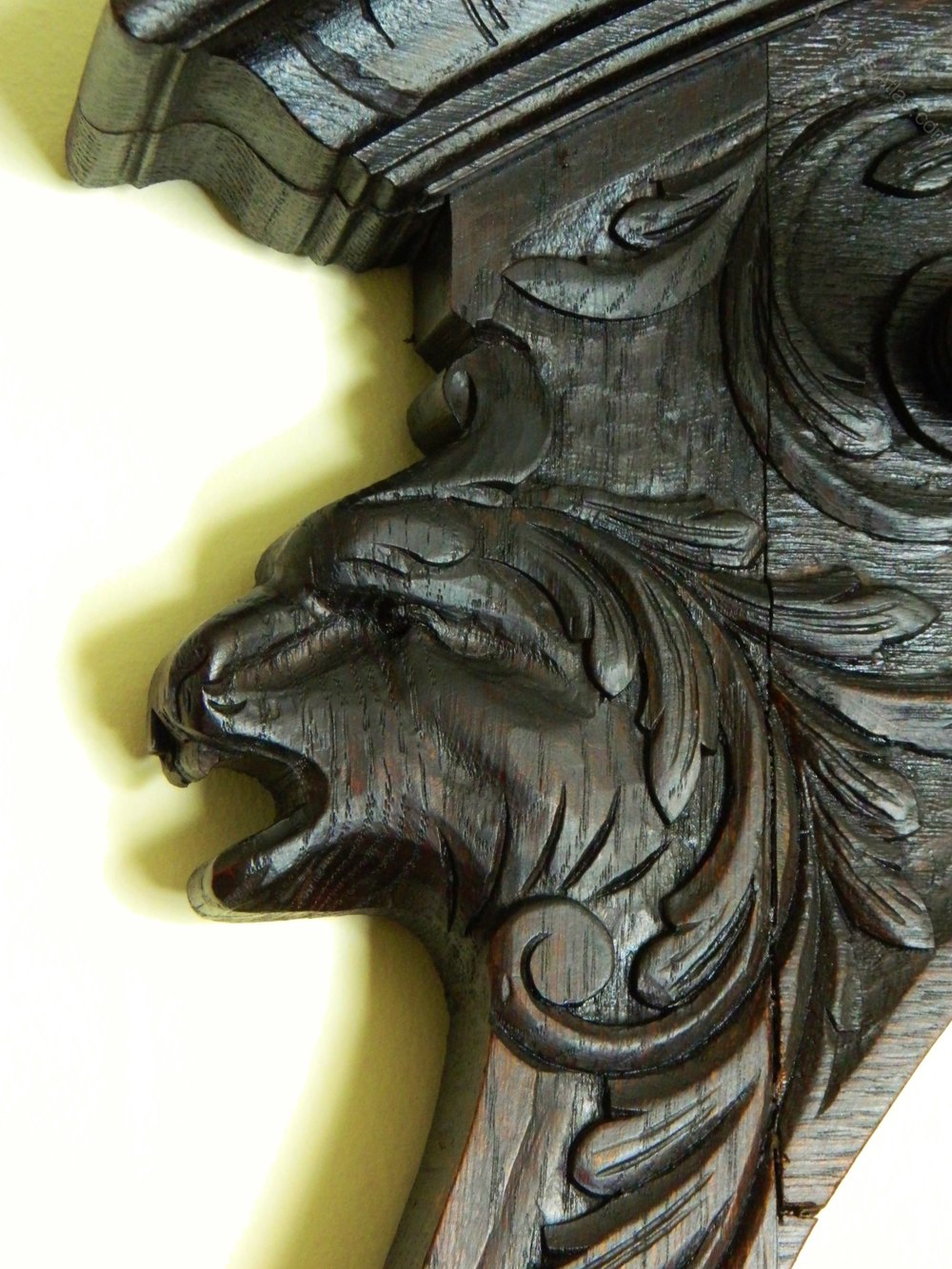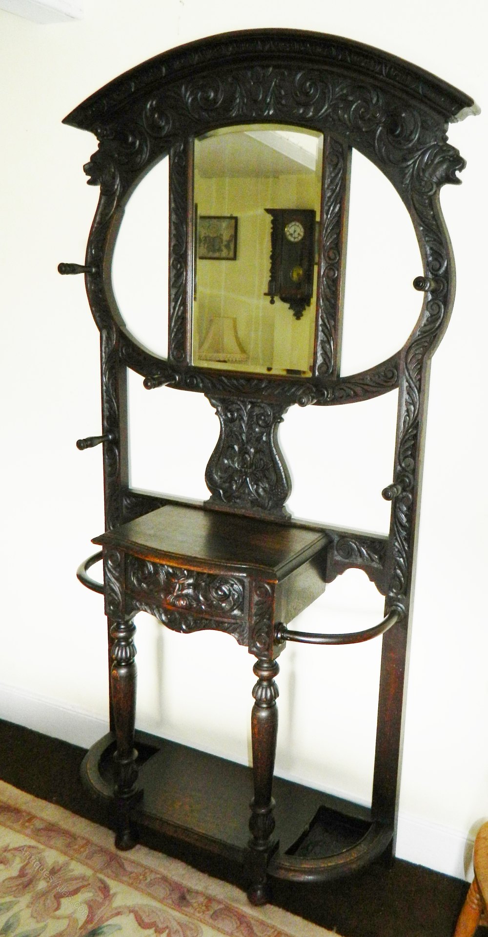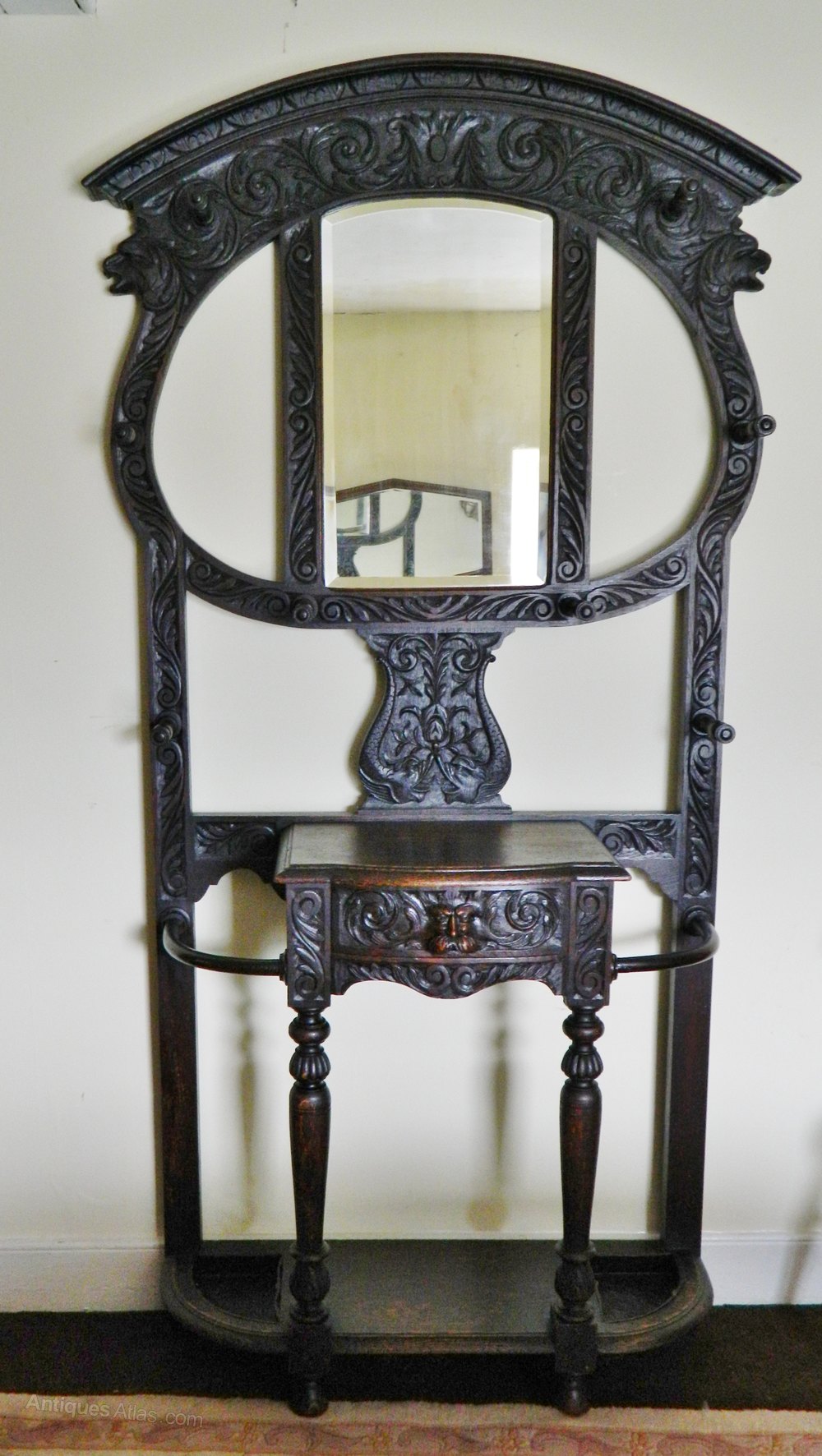 Fabulous oak hallstand , profusely carved all over with lion style masks, fish and the drawer handle with Green Man mask, bevel edge mirror, eight turned hat / coat pegs, curved bentwood stick / umbrella stands to the sides and lovely carved and turned column supports.