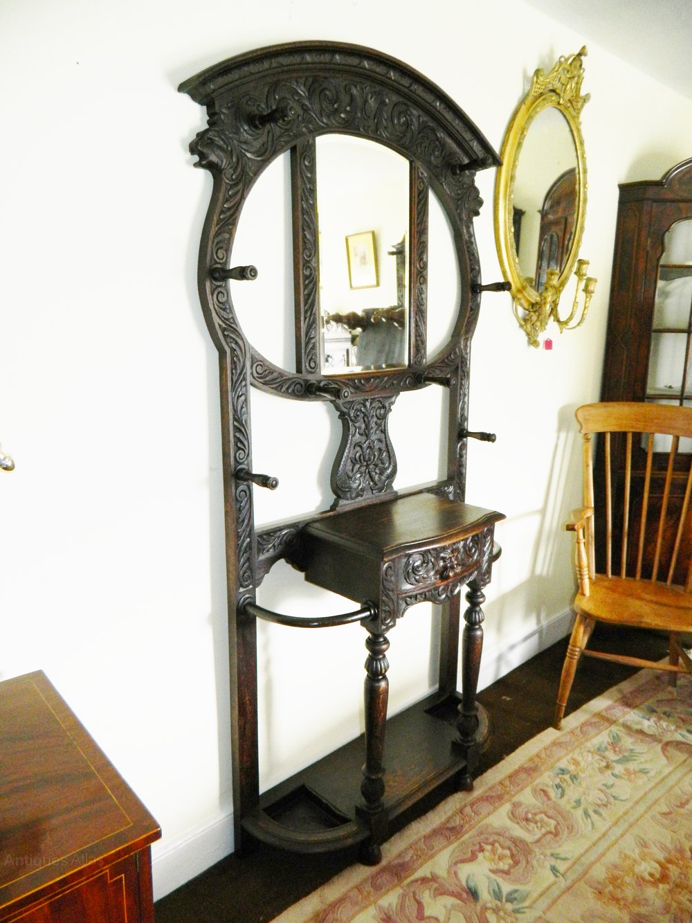 with normal marks / scuffs etc commensurate with age and use, overall this wonderfully decorative and eye catching hall stand is in good sound condition.