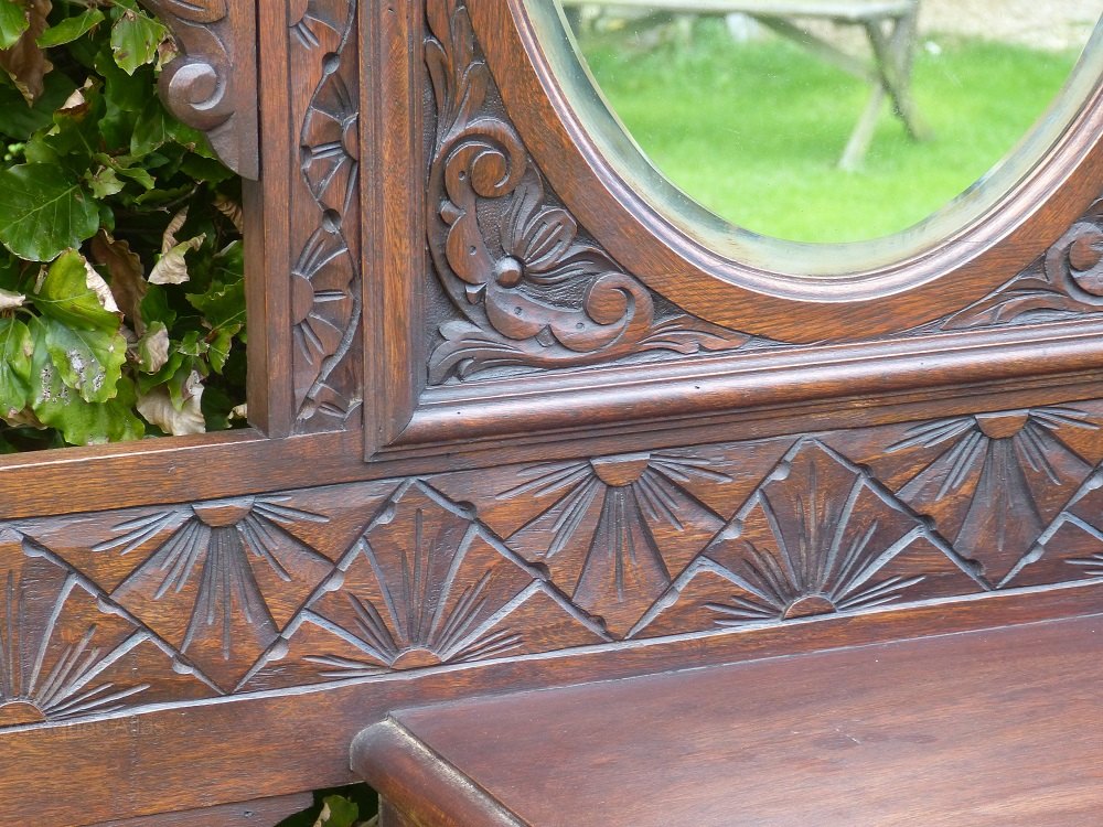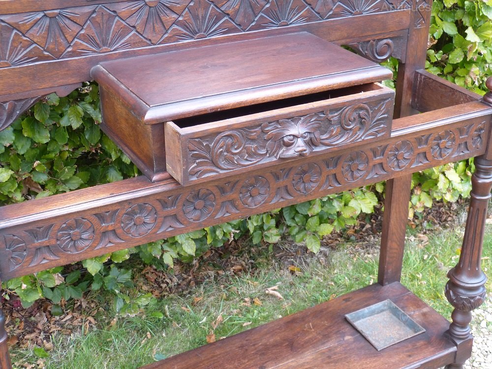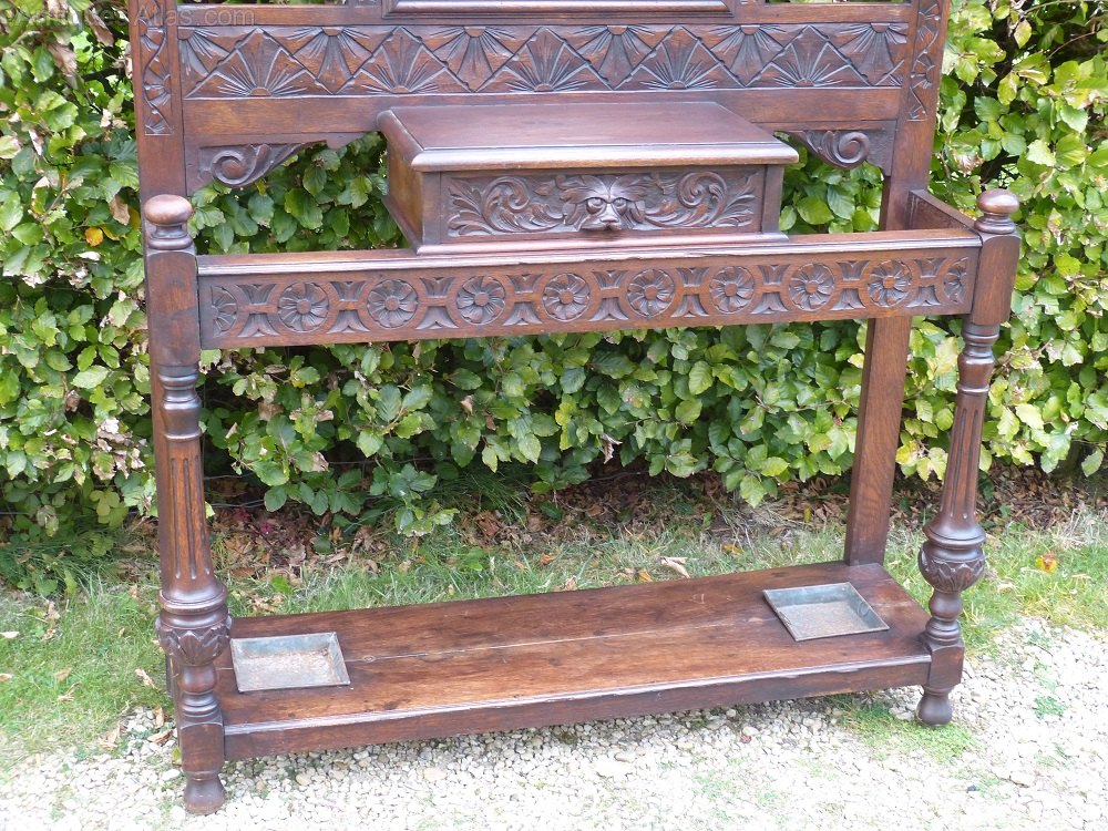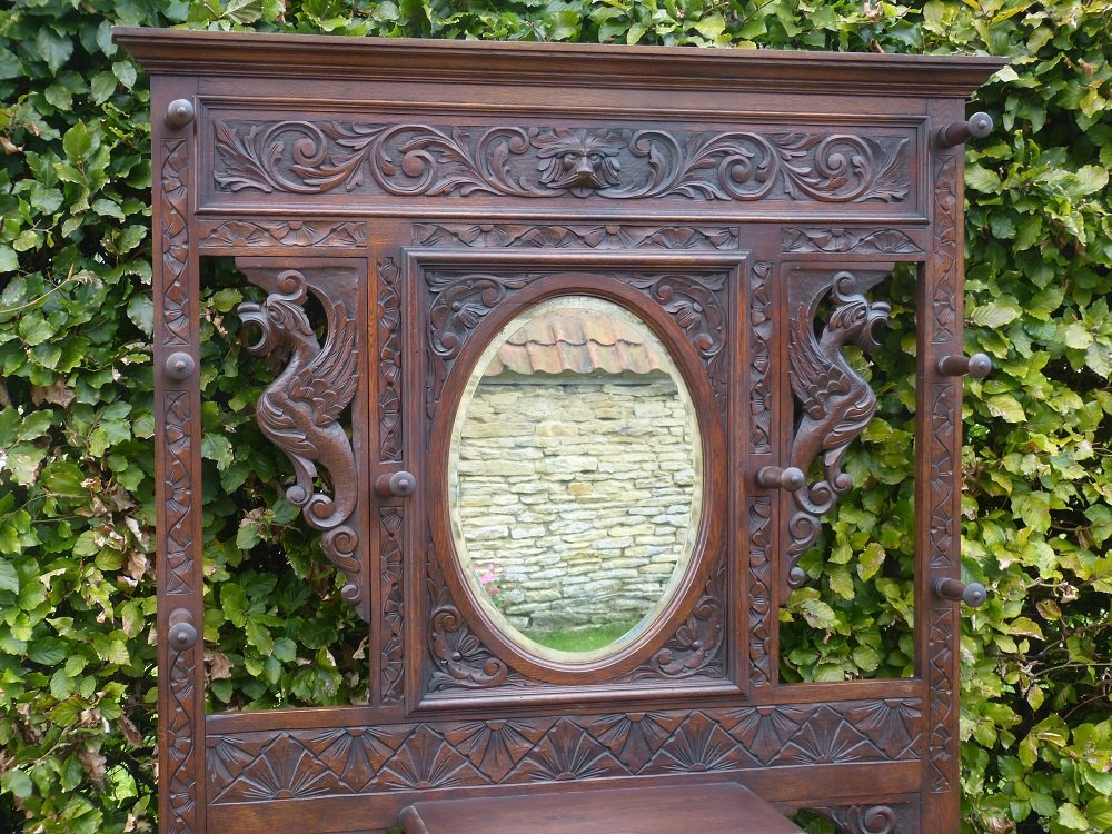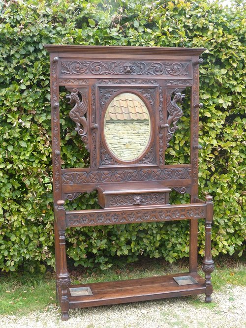 An English Victorian Gothic revival,heavily carved, oak hall stand fitted with mirror and glove drawer.Circa 1890