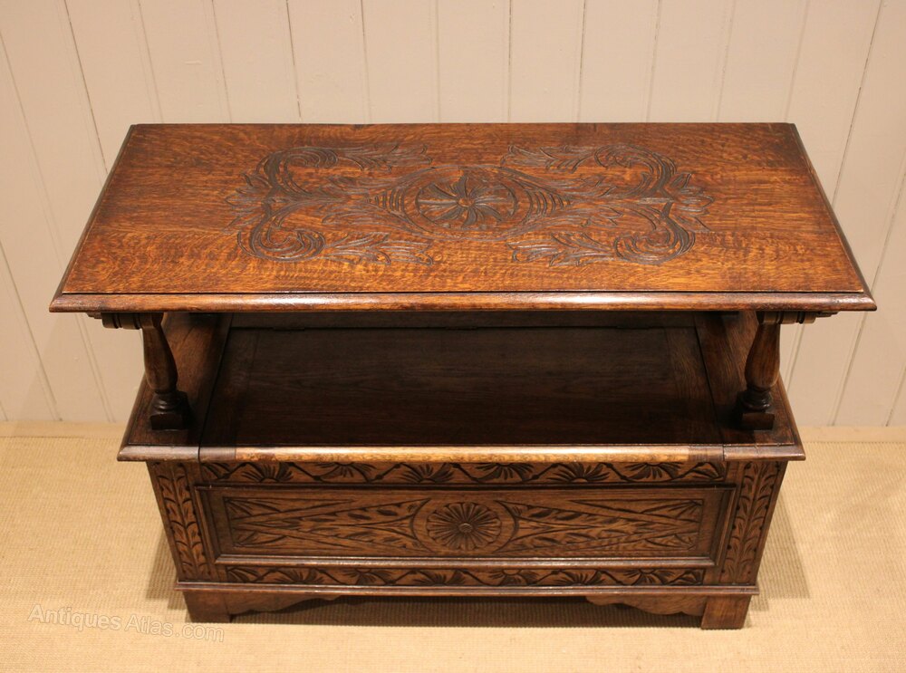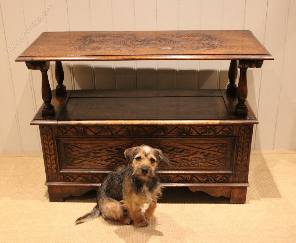 Solid oak monks bench having a carved panelled front, back and top with a lift up seat folding into a table with turned supports .The height when closed is 75 cm