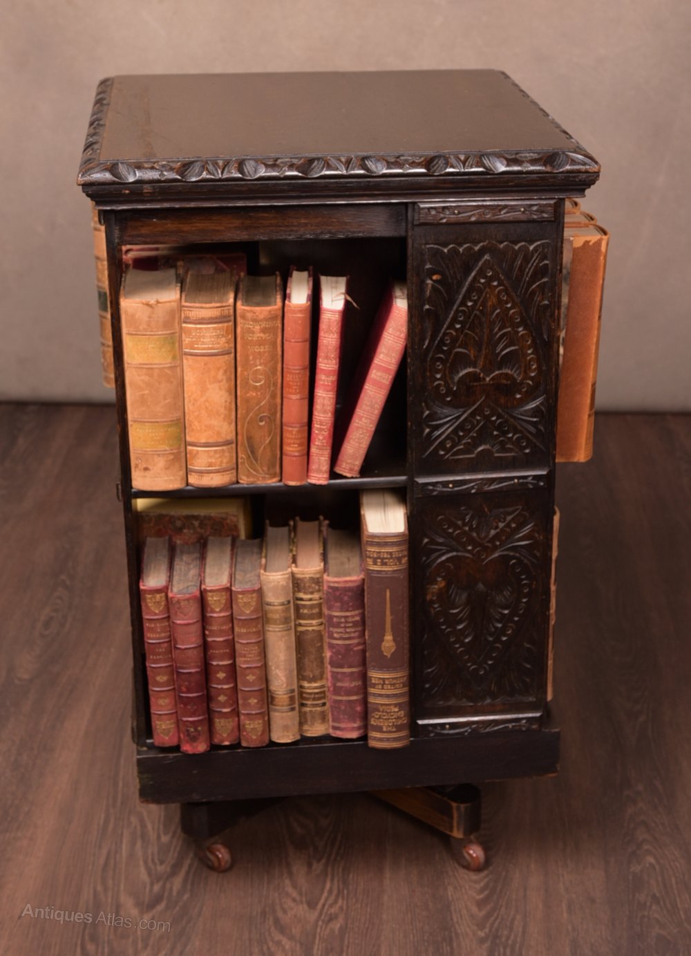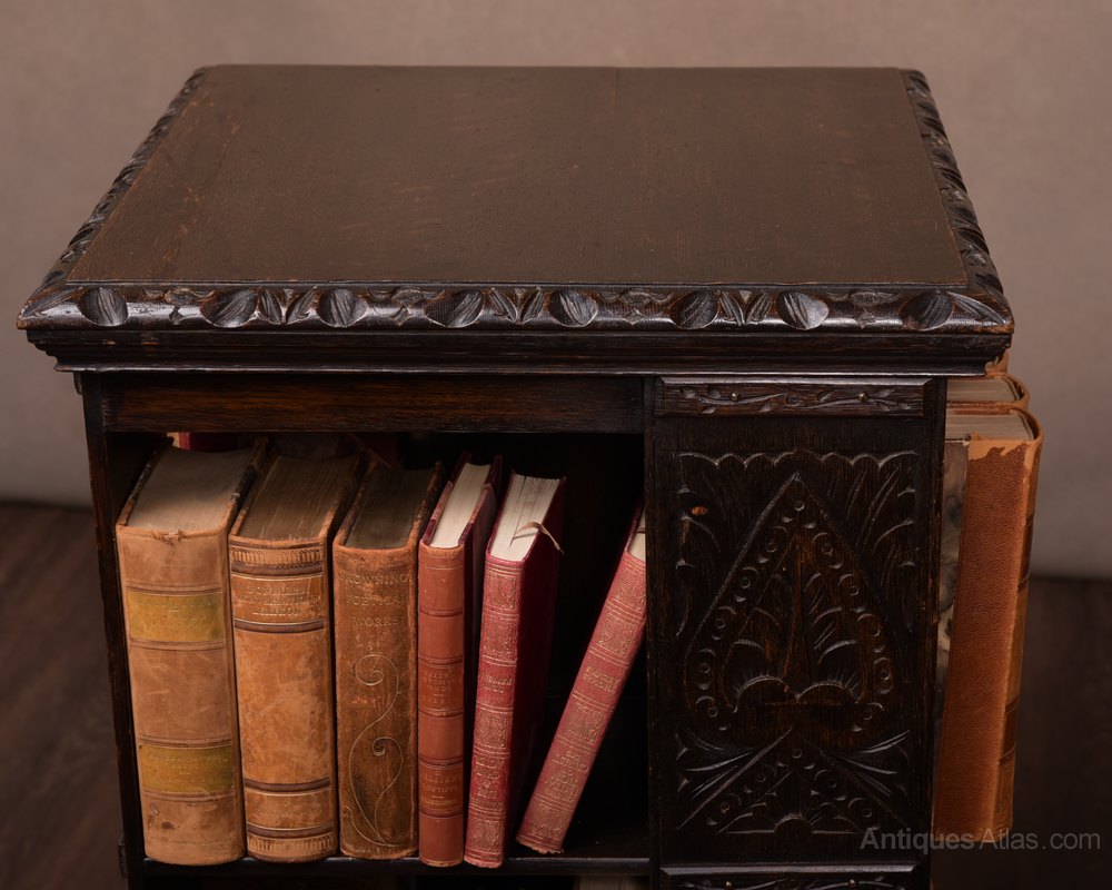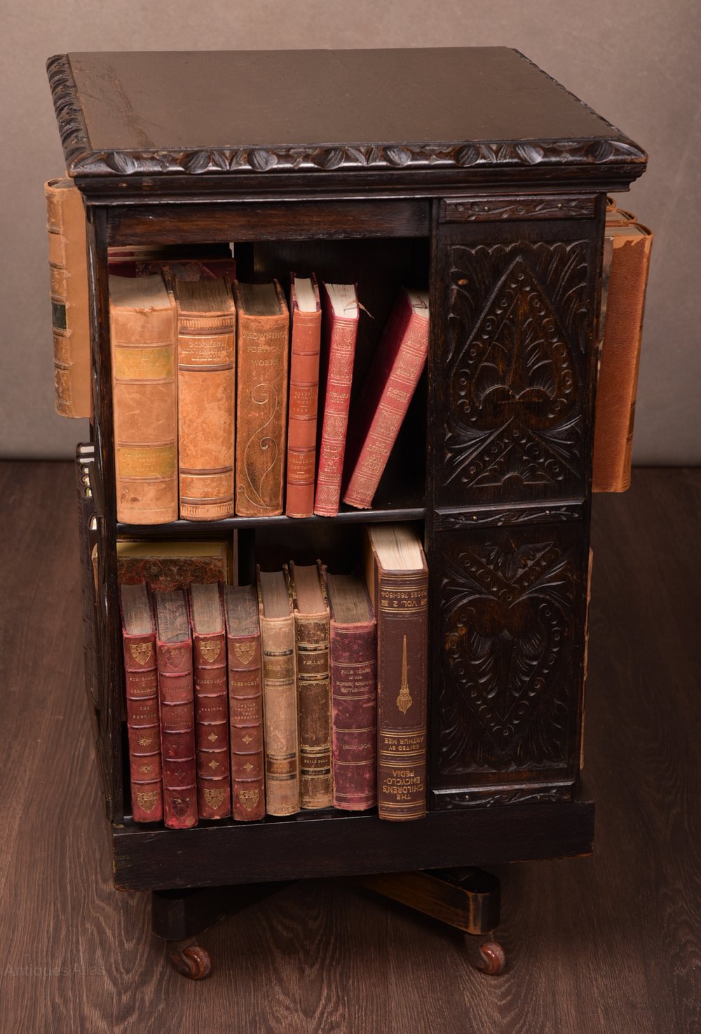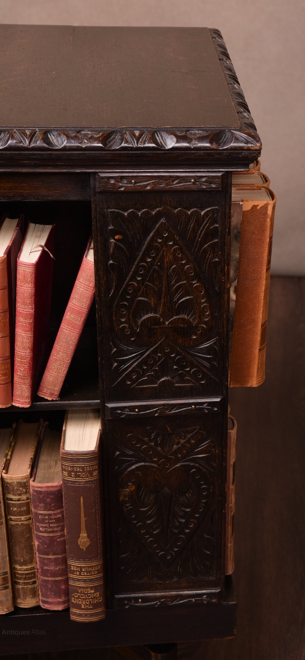 Edwardian revolving bookcase made from solid oak with crisp carving to the top edge and side panels raised on castors