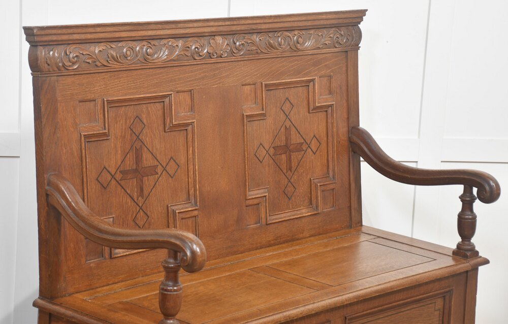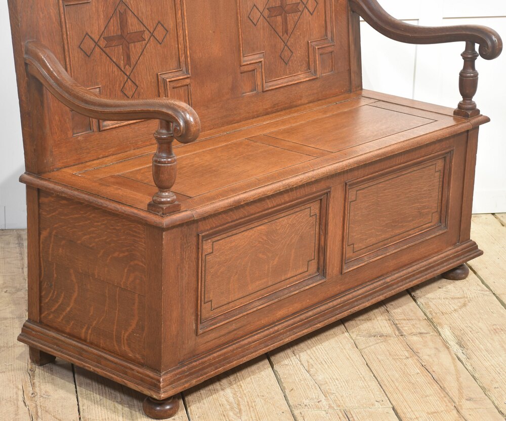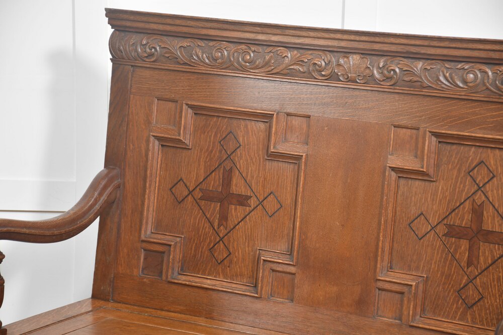 A fine quality antique oak settle, crafted with traditional detail and solid construction. The high backrest is decorated with deep panel mouldings and striking inlaid geometric motifs, framed by a beautifully carved top rail with scrolling foliage and a central shell motif.