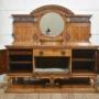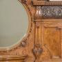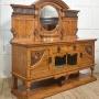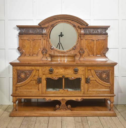 This outstanding late-Victorian sideboard is meticulously crafted in richly figured pollard oak, prized for its complex swirling grain and dramatic tonal variation. The piece presents a grand architectural profile, crowned by a large circular bevelled mirror set within a moulded arched pediment. Flanking the mirror are raised panels embellished with deeply carved foliate and scroll motifs, all rendered with exceptional precision.