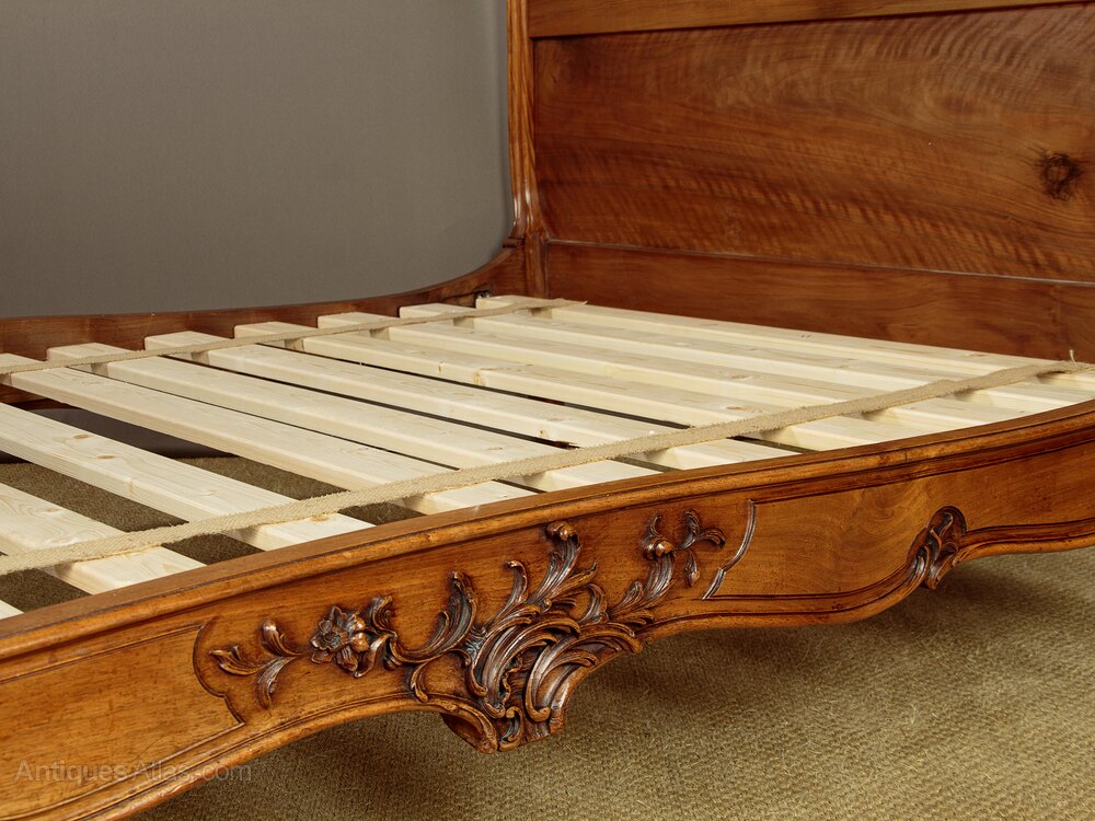 Beautifully carved French walnut bed c.1900. To take a 4' wide large single mattress. Superb shapely moulded head and foot boards with a profusion of exceptionally well carved floral and scrolling acanthus detail which is continued on the sides and feet. Maker's badge for J.H Bugey of Grenoble to the headboard. Slatted wooden bed base and a clean mattress (46" wide) supplied. Excellent colour and condition, cleaned and waxed in our workshops.