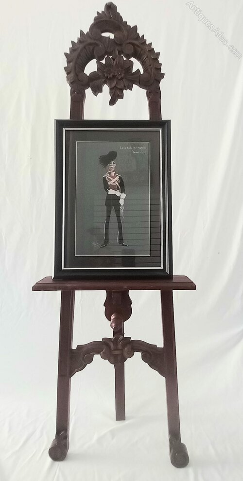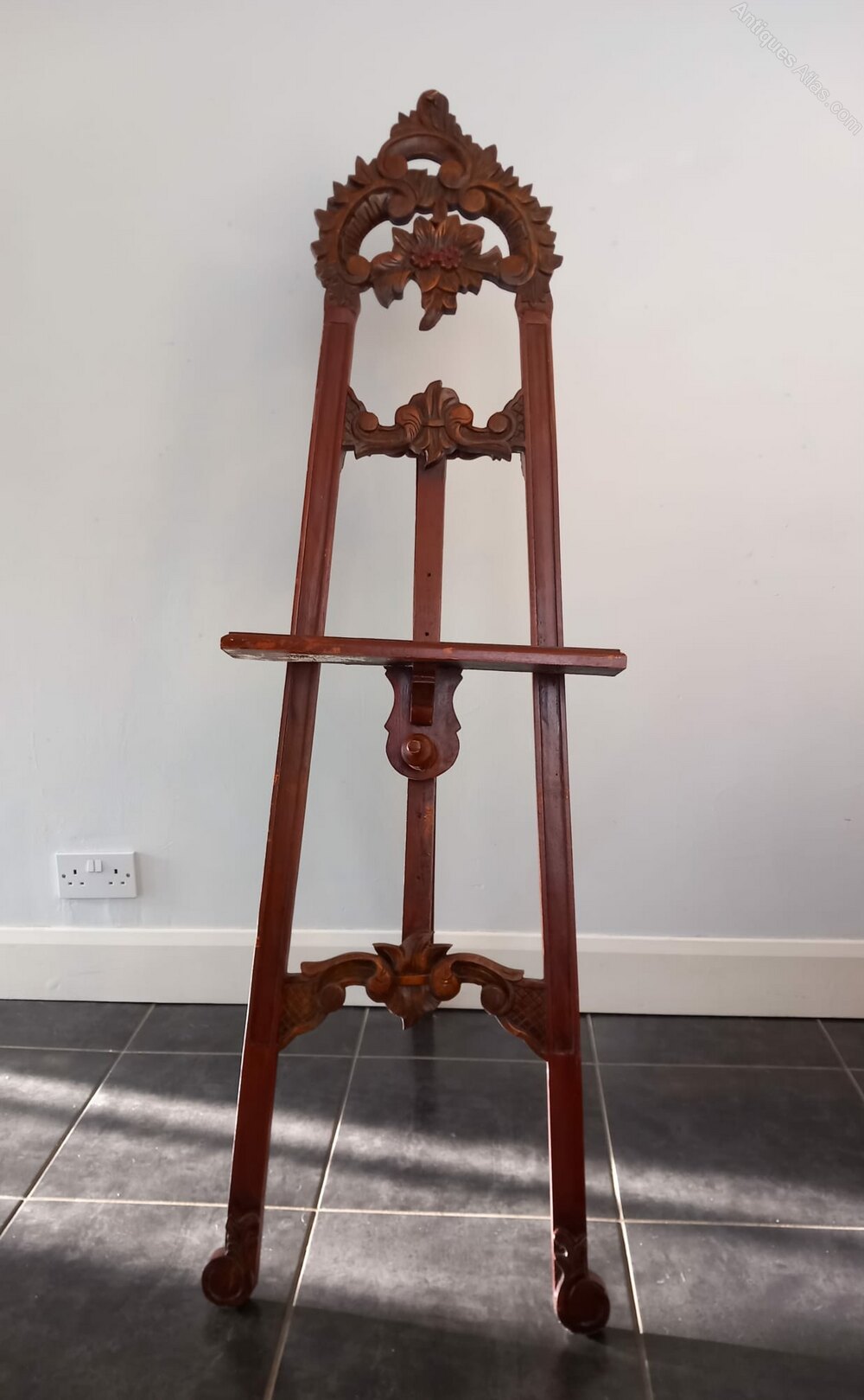Late Victorian or early 20th rococo style carved mahogany display easel. In very good condition with signs of age and use. Approximately 5 feet tall 19inches wide at the feet and 15 inches deep when open .Folds away flat .