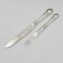 The knife measure 28cm (11") long and 3cm (1 3/16") wide and the fork measures 21.5 (8 1/2") long and 2.5cm (1") wide. They weigh 161g.