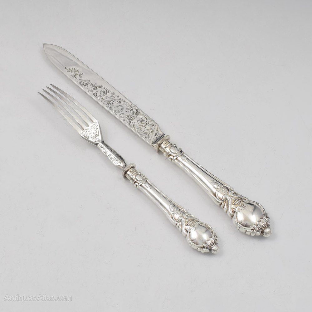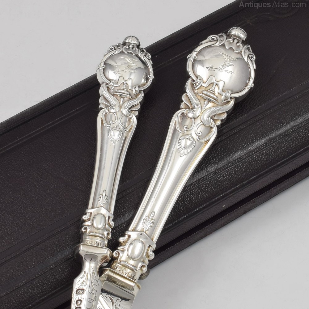 An attractive early Victorian cake serving set in original fitted velvet and silk lined leather case with highly decorative and unusual sterling silver handles and silver plated blade and fork with machine engraved decoration to both sides of scrolling vines. The handle terminals with a crest of an armoured arm holding an arrow. The handles with hallmarks for Birmingham 1852 and maker initials for John Gammage. The leather case has attractive embossed decoration to the cover.