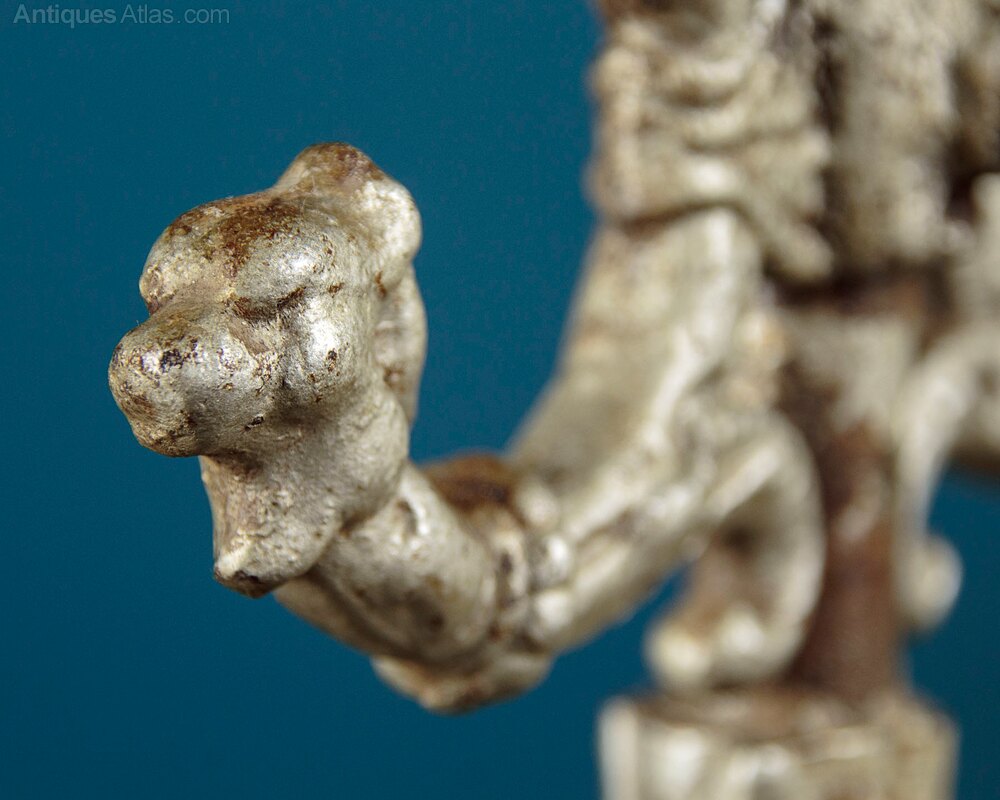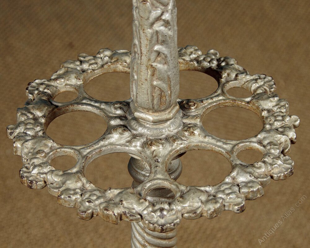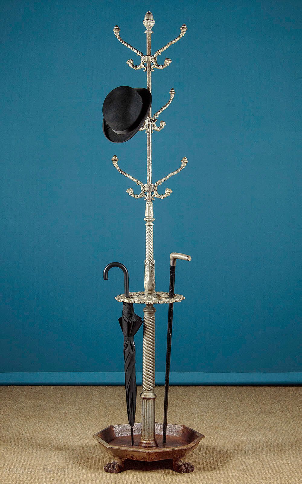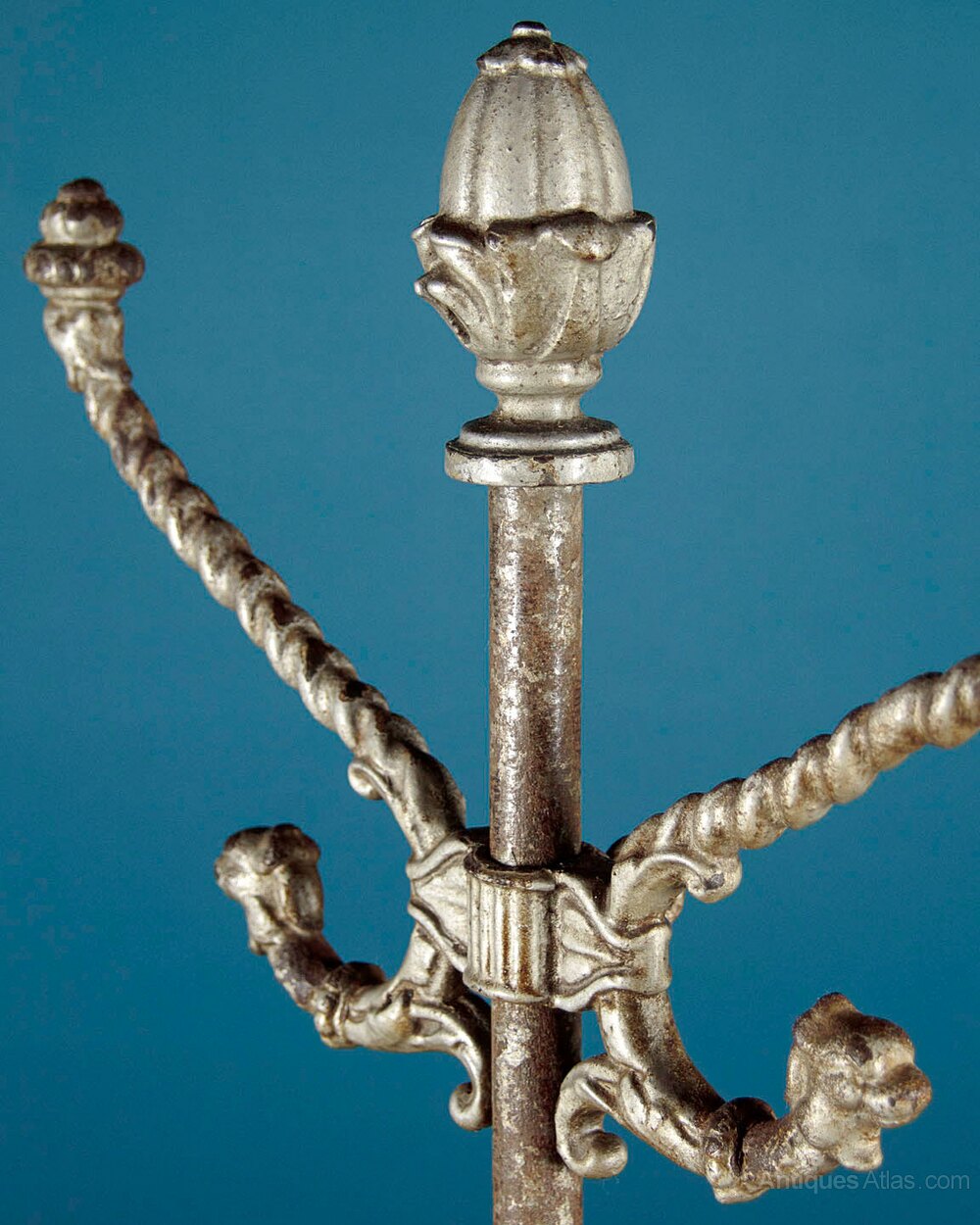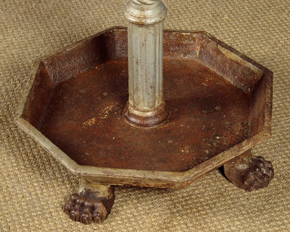 Splendid late 19th.c. cast iron hallstand c.1890. Three pairs of large double hooks for hats and coats etc over a holder for walking canes and umbrellas. Arranged on a central column cast with twist and and acanthus leaf detail over an octagonal drip tray with four large paw feet. Unusually the position of the hooks is adjustable, locking into place with a screw at the rear. Note also the large finial at the top of the column and lions heads at the ends of the hooks. Good condition with later overpainting. Cleaned and waxed in our workshops.