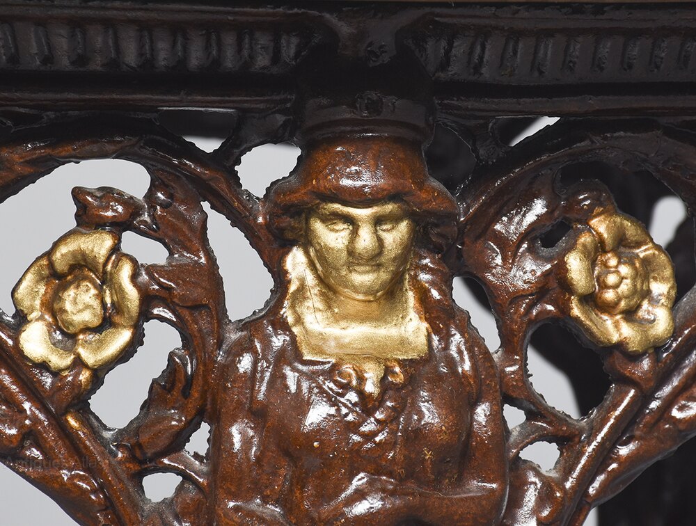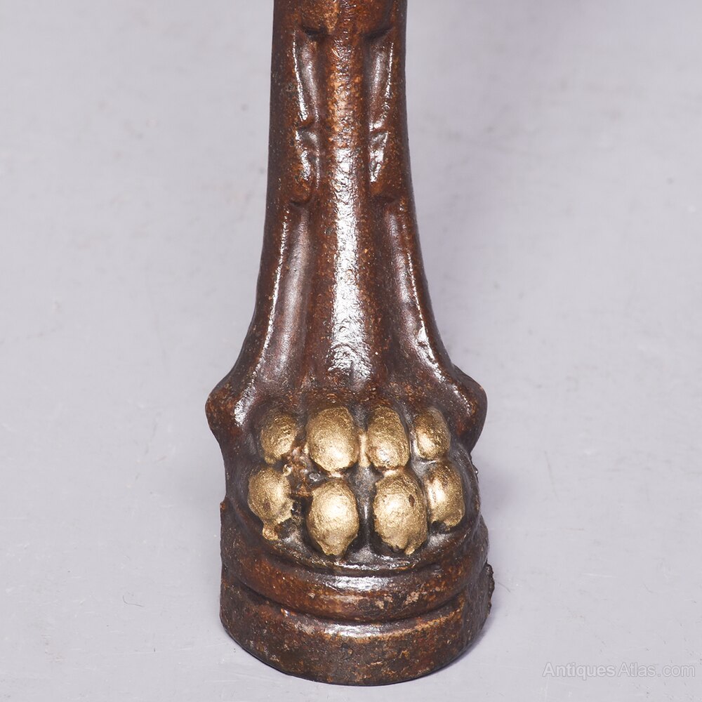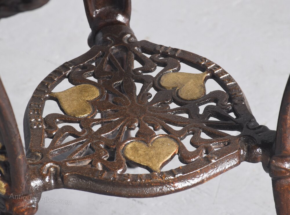 Circa 1880. A Victorian cast iron Britannia pub table. The solid mahogany top with elegant moulded edge, sitting on a classic painted cast and pierced iron base. Each of the three legs with Britannia on the facing, with pierced and gilded sections at each side, the legs are intersected by an elegant pierced and painted shelf with the makers name cast into the shelf. Finishing on a paw foot with further mouldings beneath. In excellent condition.