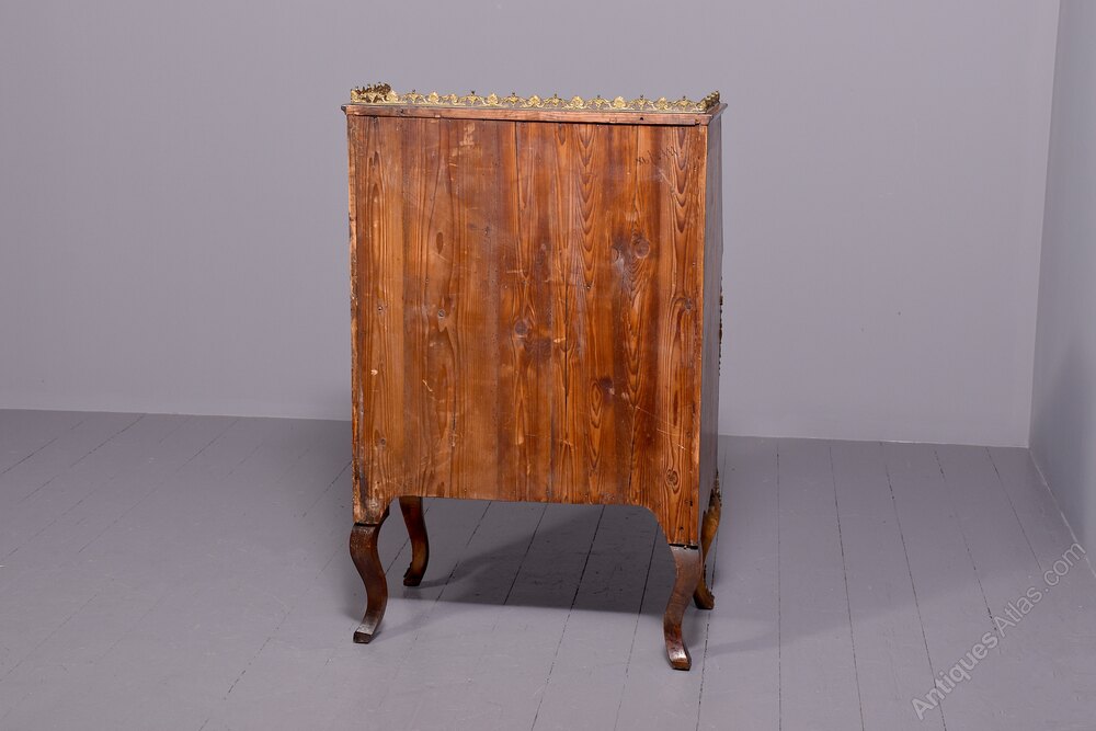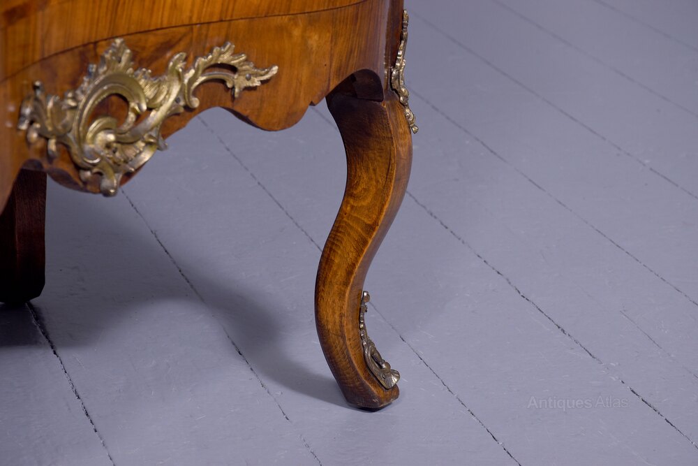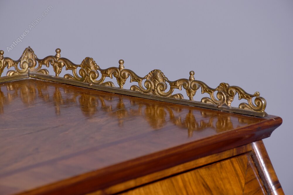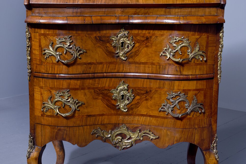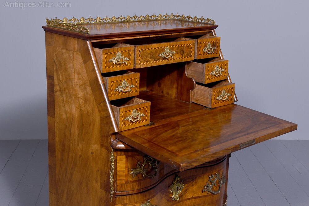 Circa 1870. Attractive French inlaid walnut ladies writing bureau. The top with an inlaid star, crossbanding and an ormolu (gilded brass) gallery above the parquetry inlaid flap with a decorative escutcheon, opening to an elaborate interior with stepped inlaid drawers with ormolu handles and chequered inlay. The serpentine-shaped base with two drawers with brass Rococo handles and elaborate escutcheons above a shaped skirt with ormolu mounts, over small cabriole supports with mounts. In excellent condition.