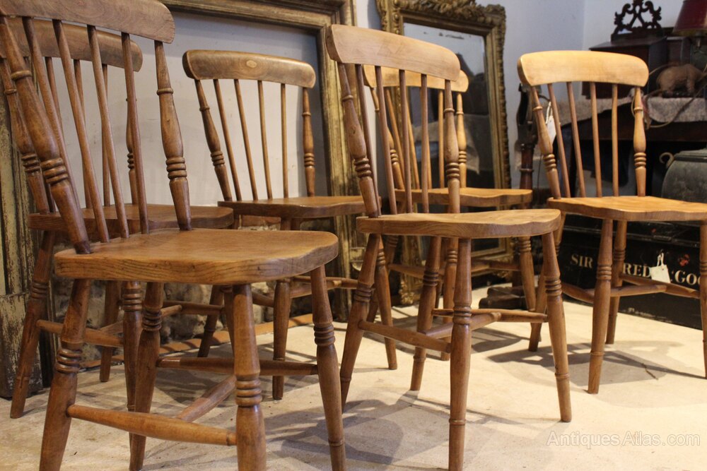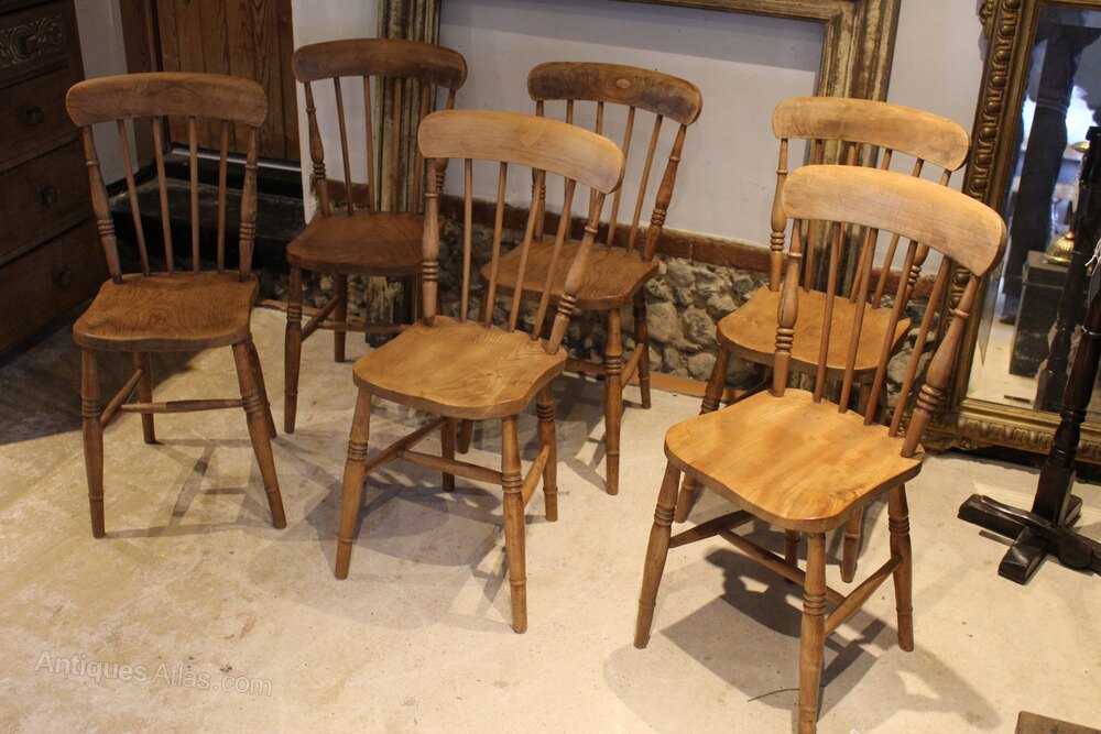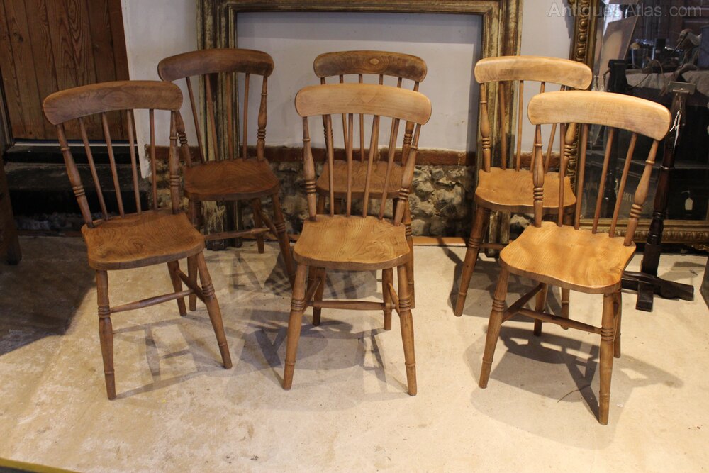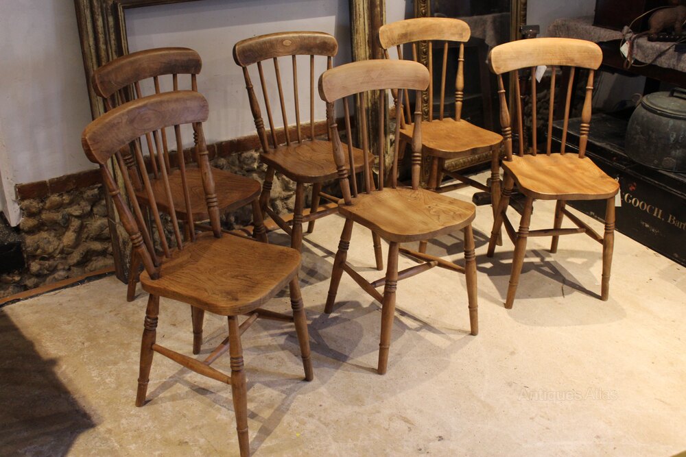 Here we have a true set of six Victorian Beech and Elm Windsor kitchen or dining chairs c1870. As you can see the chairs have a lovely mellow colour and patina. There are broad top rails and spindle backs with turned decoration of the side supports. There are thick Elm saddle seats and well turned legs below joined by an H stretcher. A wonderful period set in great retail condition ready for your home. The dimensions are approx 84 cm high 36 cm wide 40 cm deep.