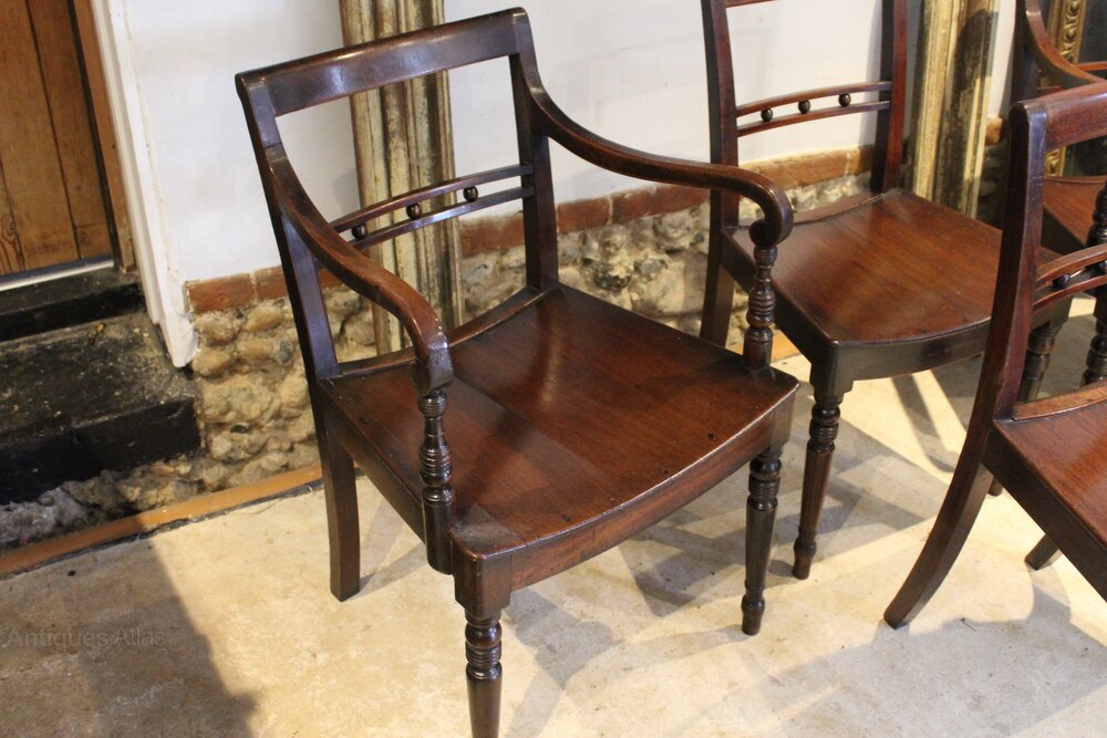 Here we have a rare true set of six George IV Suffolk ball back dining chairs c1820. As you can see the chairs have great colour and patina. There are typical bar top rails housed in side supports with a pair of rails in the back housing the famous Suffolk turned wooden balls. There are crook shaped arms to the carvers of which there are two and dished seats. The front legs are beautifully turned and there are swept squared and tapered rear legs. The dimensions are approx 80 cm high 47 cm wide 50 cm deep.