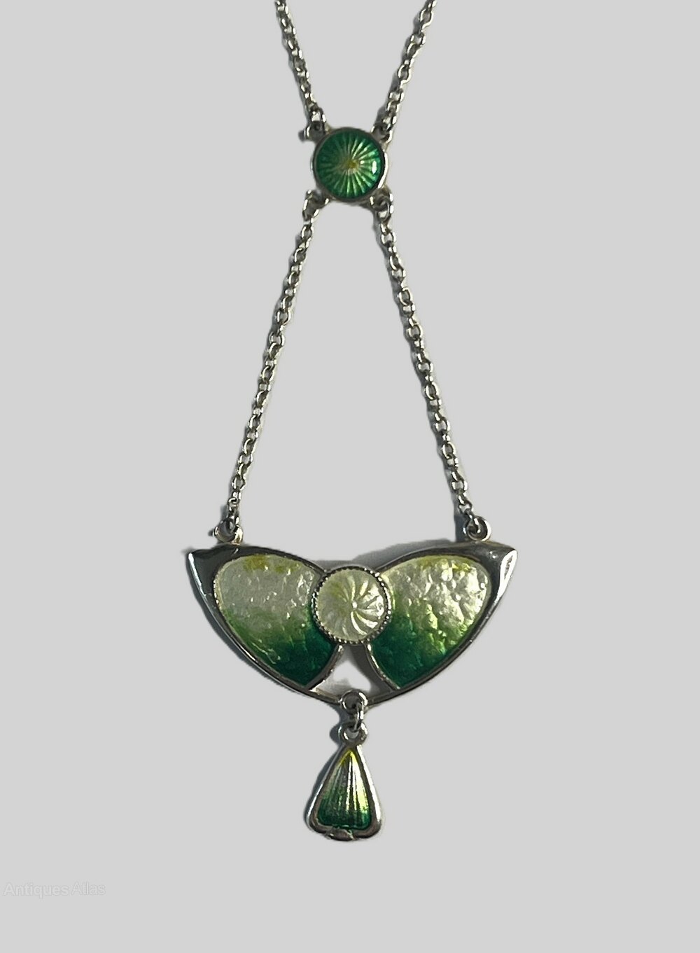A stunning Sterling silver Charles Horner necklace hallmarked for Chester 1913. The green and white enamel is in excellent condition. The original 41 cm silver chain is also perfect condition. The necklace has recently been professionally cleaned and polished.