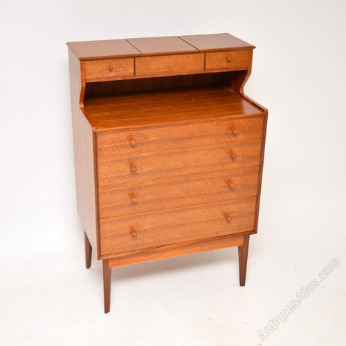 A superb vintage chest of drawers / vanity dressing table in walnut. This was made by Alfred Cox, it was made in England and dates from the 1960’s.