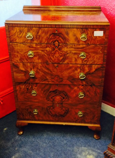 Queen Anne Style Burr Walnut 5 Drawer Chest Circa