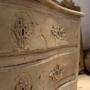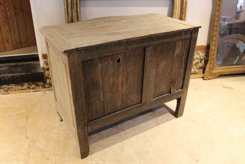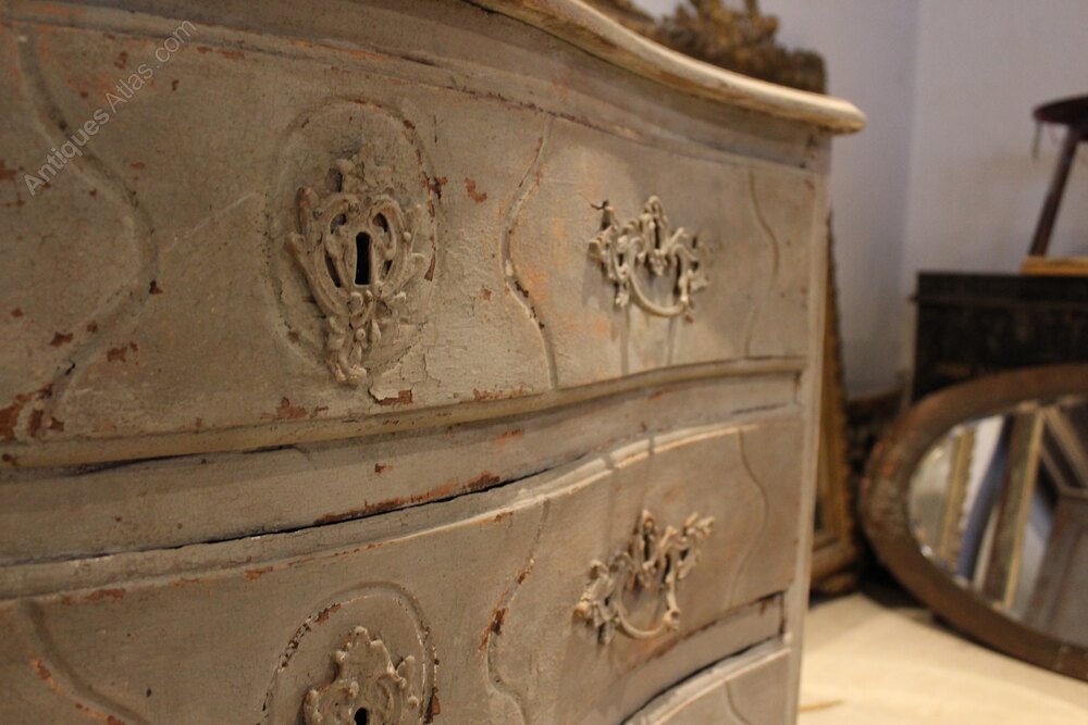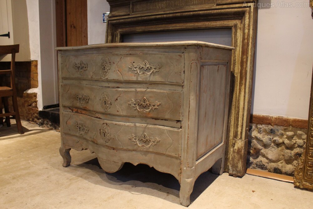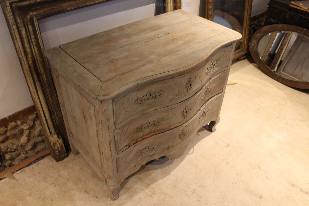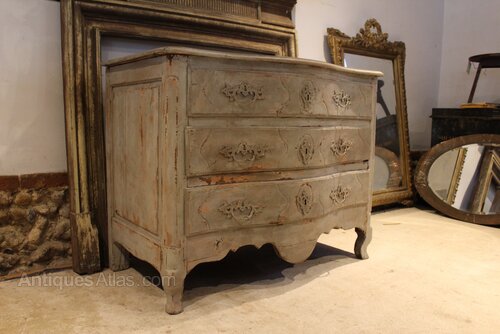 Here we have a wonderful French chest of drawers or commode c1750. As you can see the chest has super colour and patina. The chest is light Grey almost weathered sand stone in colour. There is a plank top with borders and a serpentine shape. The serprentine shape continues to the drawers which have well carved fronts and original handles. The drawers are all Oak lined and have hand cut dovetail joints. All drawers run smooth and the whole sits on cabriole legs. A super period chest with lovely interiors design qualities in excellent retail condition ready for your home. The dimensions are approx 108 cm wide 62 cm deep 82 cm high.
