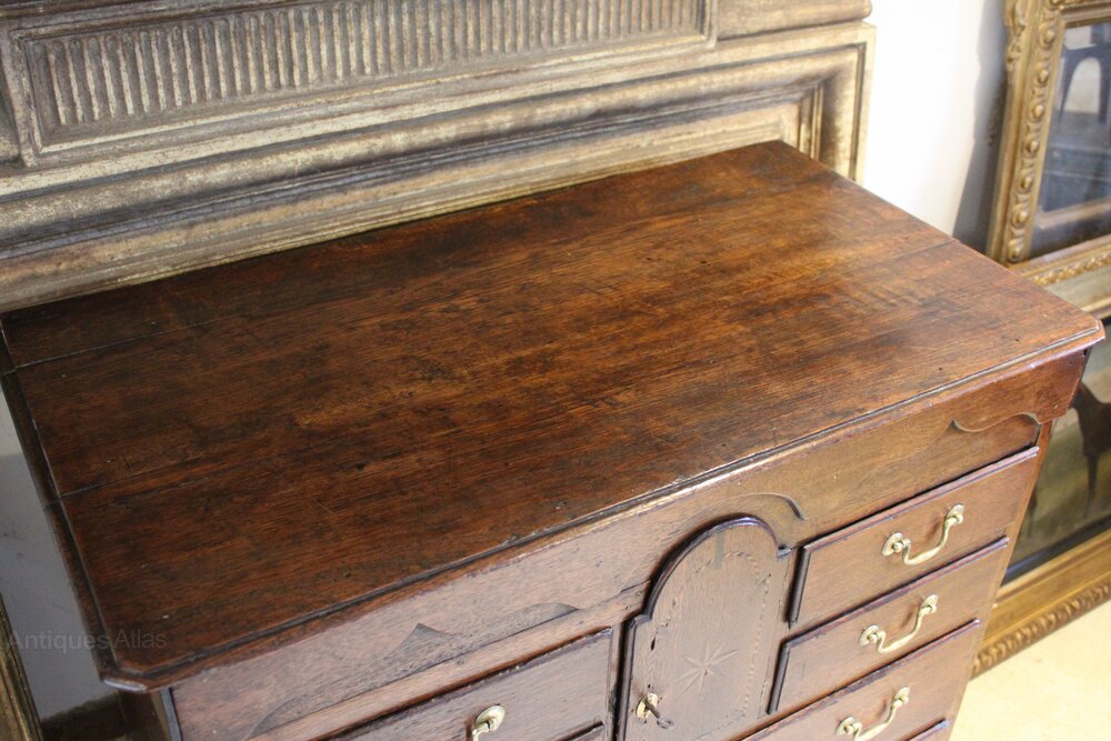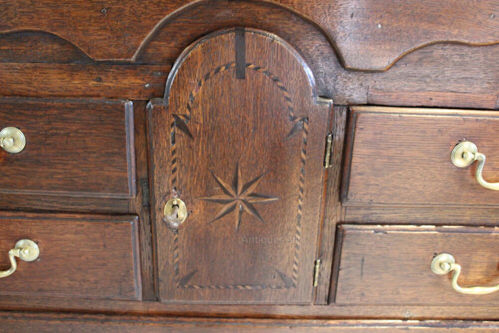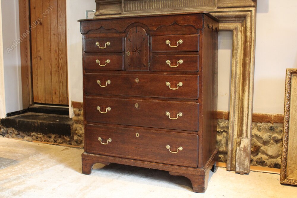 Here we have a very rare George III Oak Norfolk chest of drawers c1780. As you can see the chest has great colour and patina. There is a two plank Oak top with canted corners and a thumb moulded edge. There are seven drawers and a small cupboard in a typical Norfolk chest configuration. The drawers have hand cut dovetail joints and thumb mouldings to the edge. There are original blue Georgian paper lined drawers and beautiful brass swan neck handles. The central cupboard has a fantastic inlaid starburst and and chequered string inlay in Holly and Ebony. There is a shaped frieze below the top again typical of the location and period of this chest and as you would expect the whole sits on bracket feet. A super period chest in great retail condition ready for your home. The dimensions are approx 93 cm wide 47 cm deep 105 cm high.