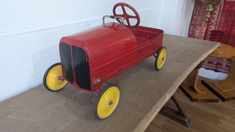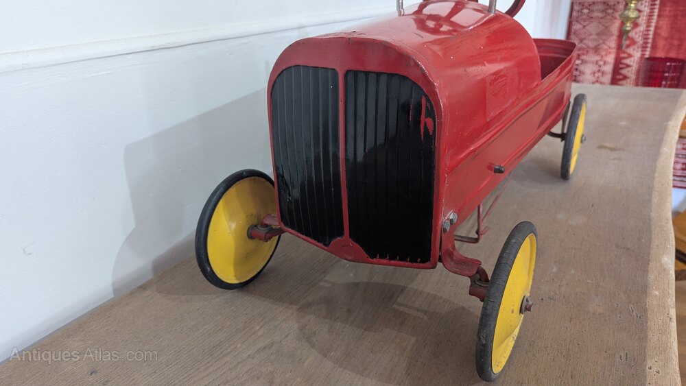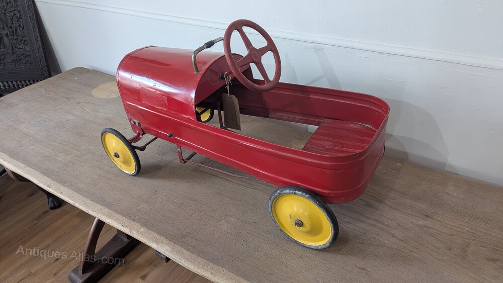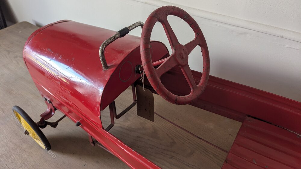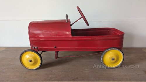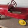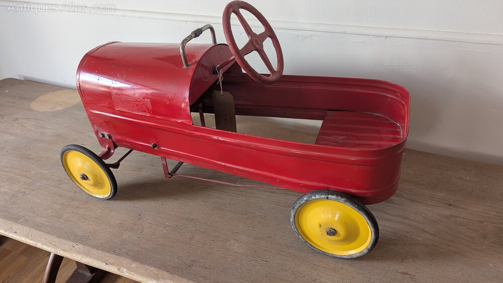 A painted 1950's steel peddle car in working condition measuring 76 cm x 36 x 45 in good used condition.
