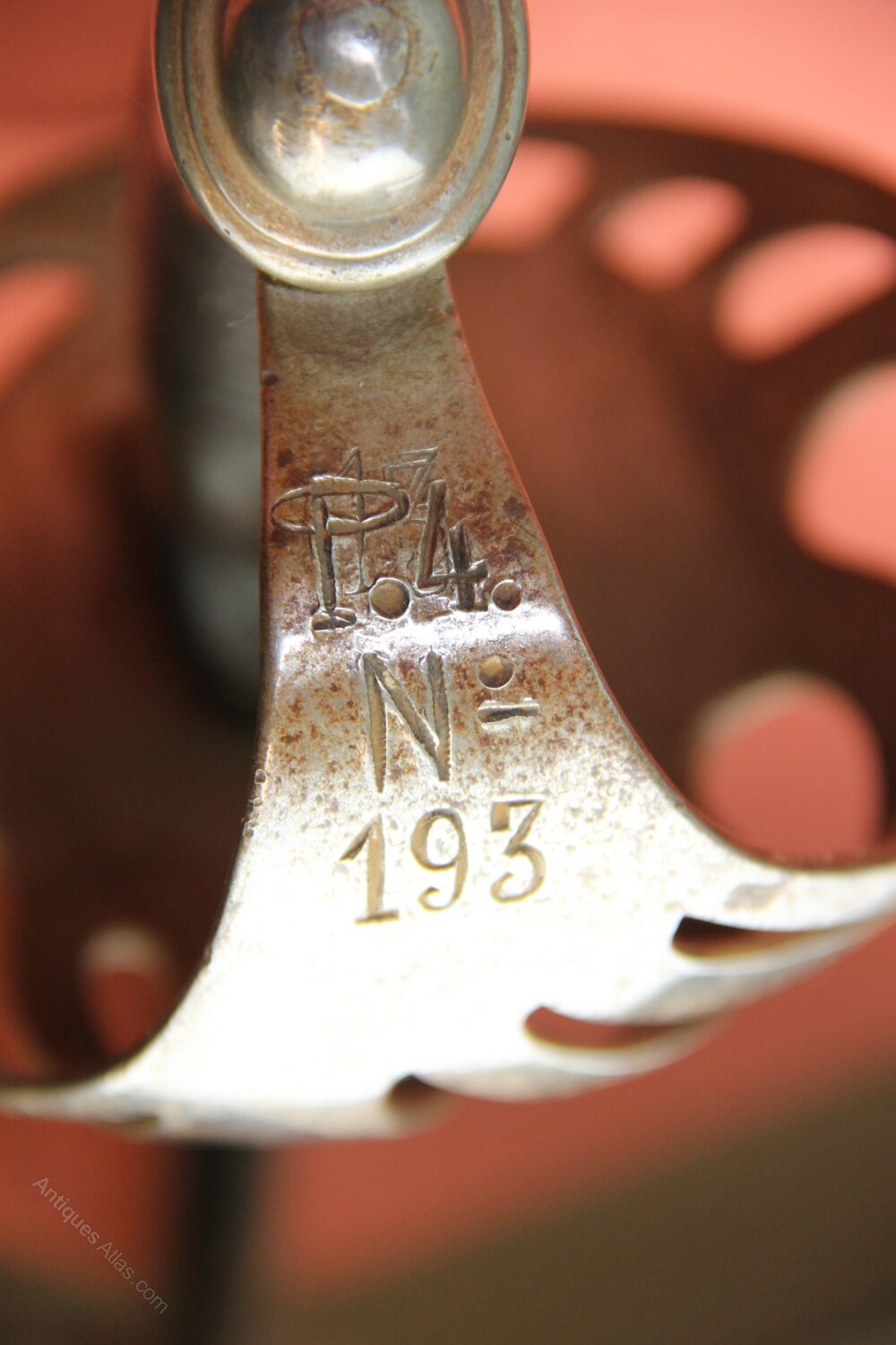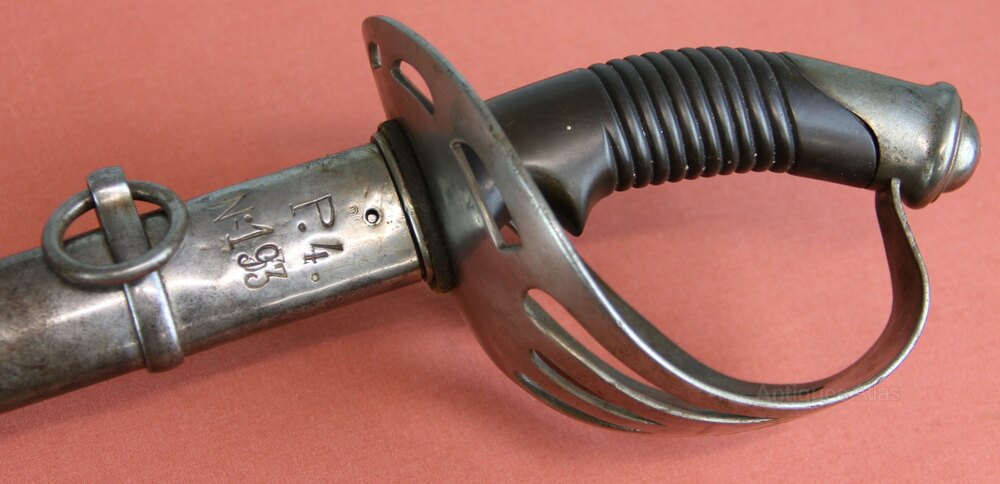 Chilean French made cavalry sword in its original steel scabbard. Pierced bowl guard with ribbed bakerite grip. Guard stamped P4 no. 193. Has a grooved, single edged curved blade. Has a French manufacturers inscription on the spine of the blade. Scabbard also stamped P4 no. 193. In generally good condition with slight denting to the bottom of the scabbard. Blade in very good condition but side curvature to the end of the blade.