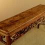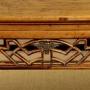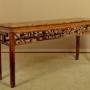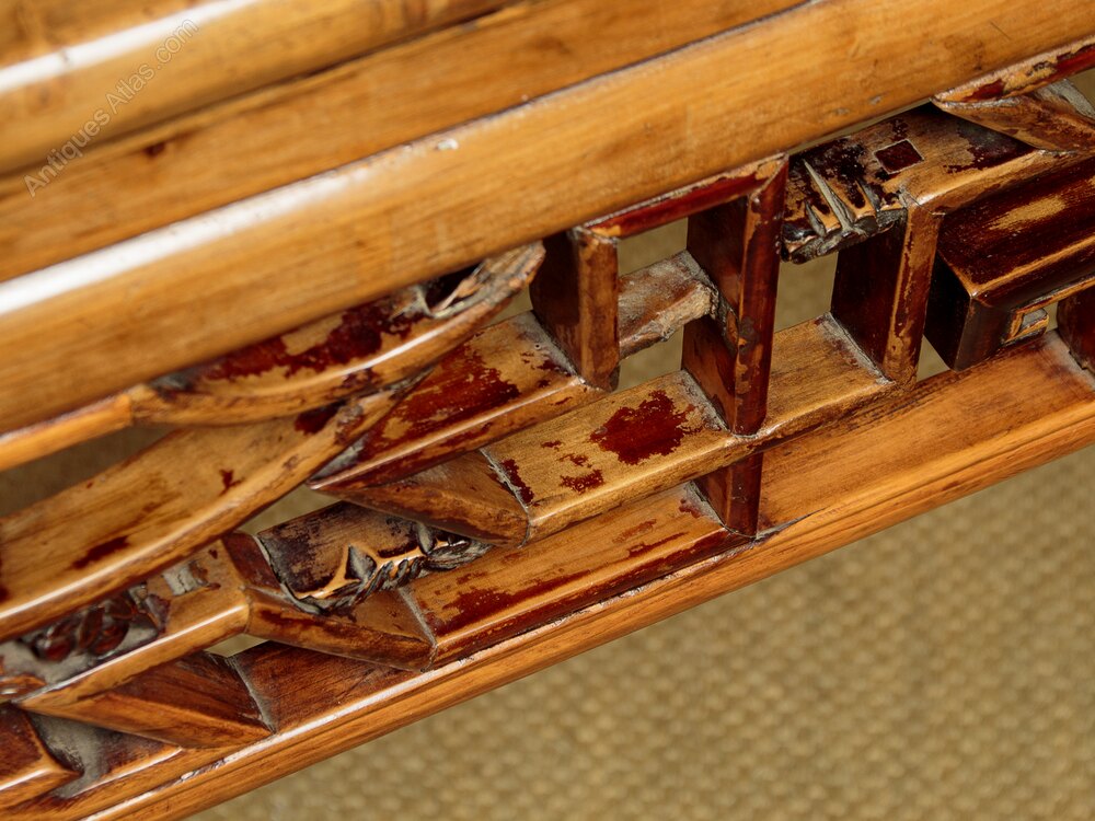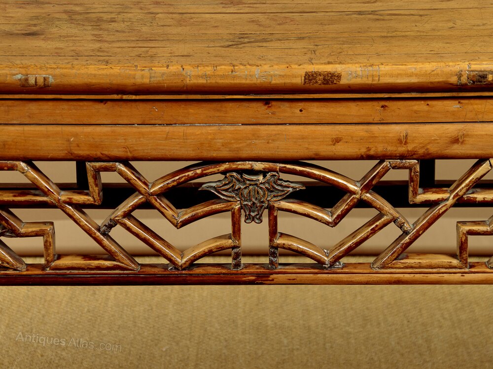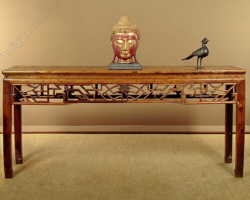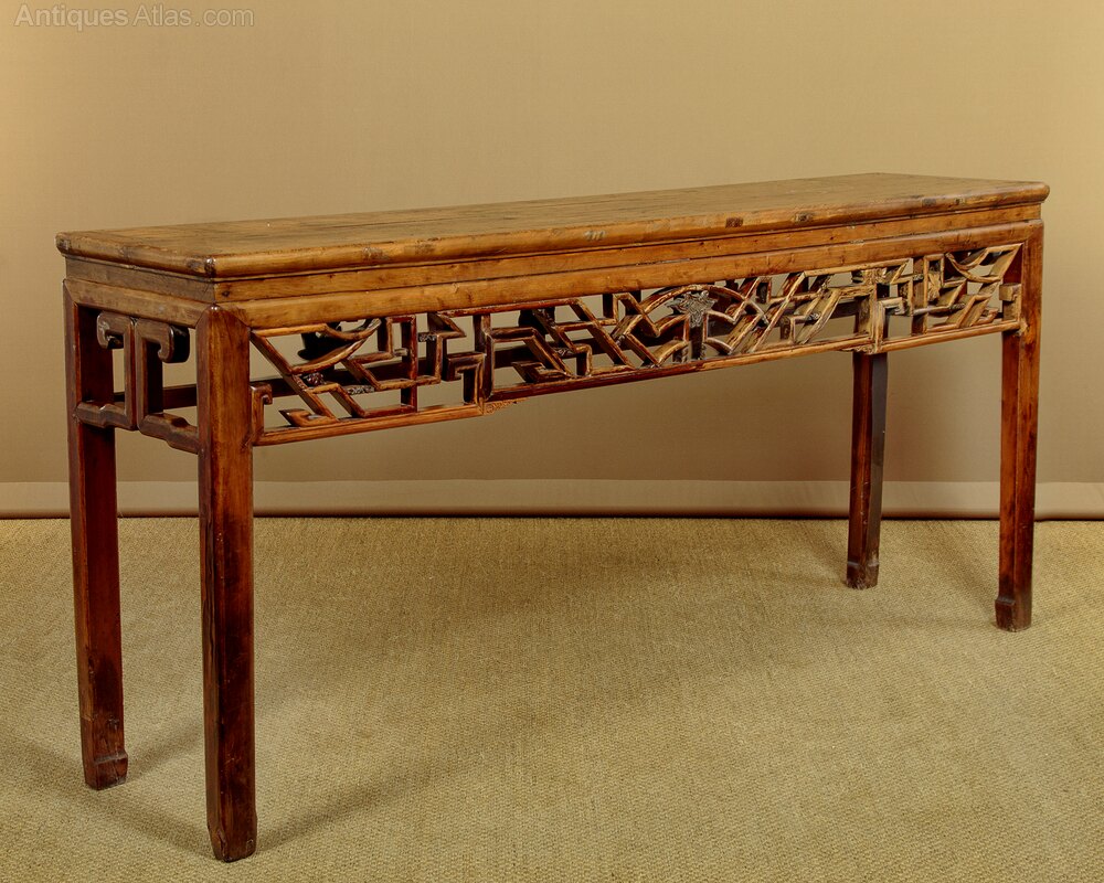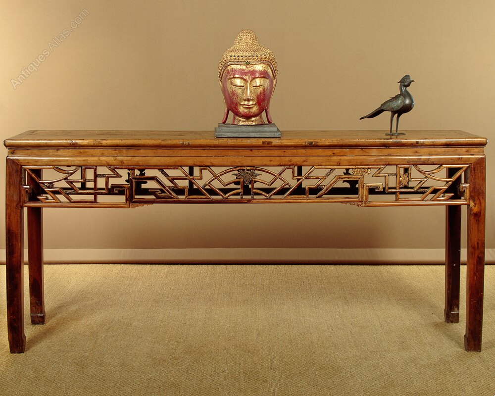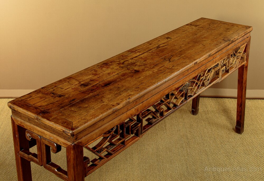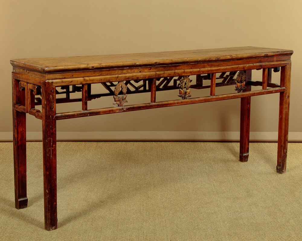 Long slim Chinese altar table or console c.1900. Traditional cleated construction in cherry wood or similar. 73½" x 17" top over a moulded frame and a superb decorative apron to the front. Featuring an elaborate symmetrical trellis with various carved elements and a bat motif (symbol of good fortune) at the centre. Shaped detail to the frame at the sides and carved leaves alternative with straight staves at rear. Raised on straight legs with a slight shape to feet. Presented as found, some wear but solid and sturdy, in good condition with traces of the original red painted finish.