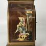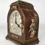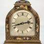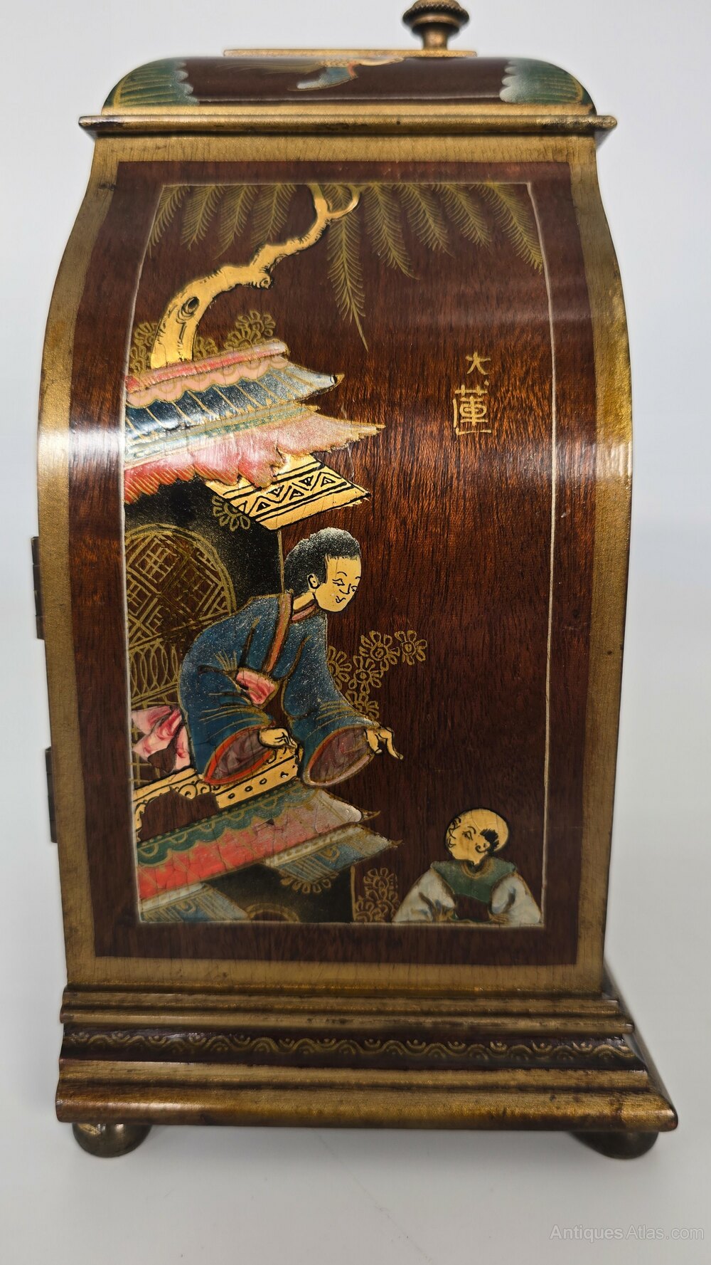 The case of this beautiful small clock is lovely. It is veneered in mahogany and decorated with hand painted, brightly coloured, raised lacquer panels with people, landscapes and birds all within hand painted gilt boarders which decorate the front top and sides.