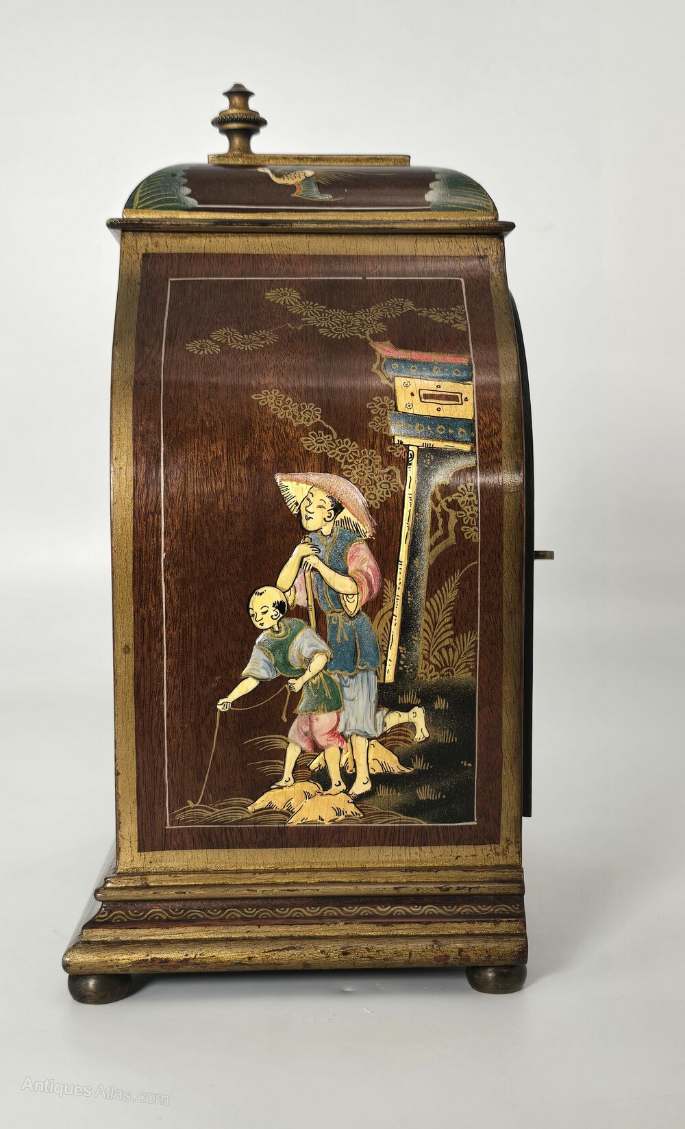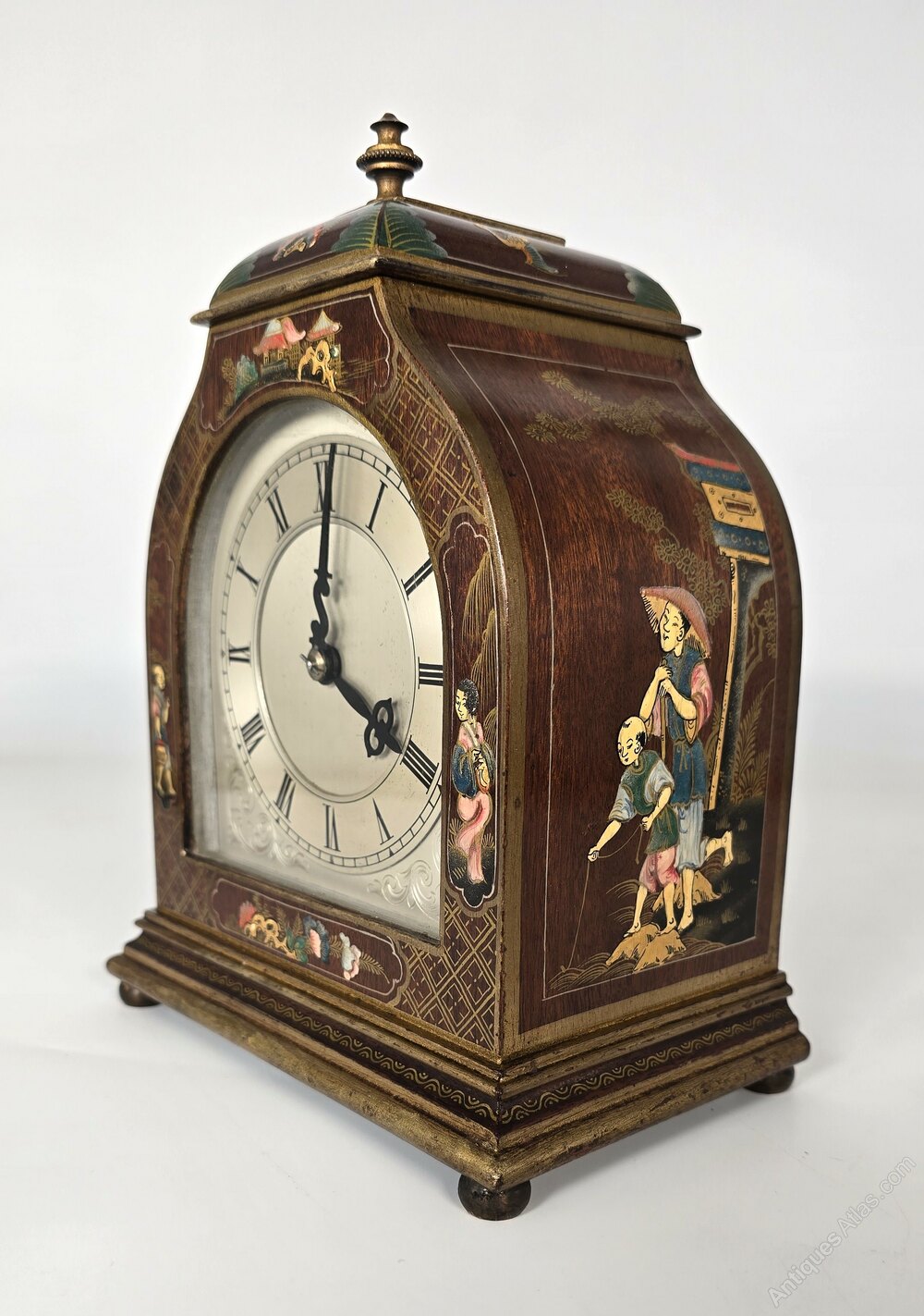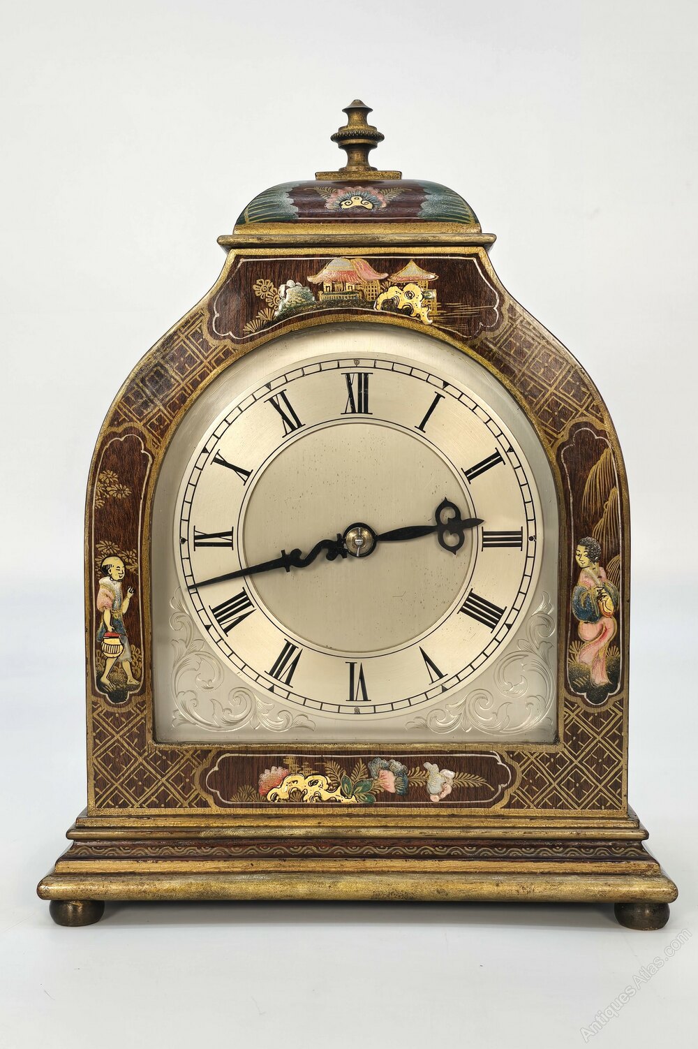 The clock stands on four brass bun feet, and the pediment of the clock is finished with an ornate gilt brass beaded finial.