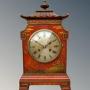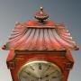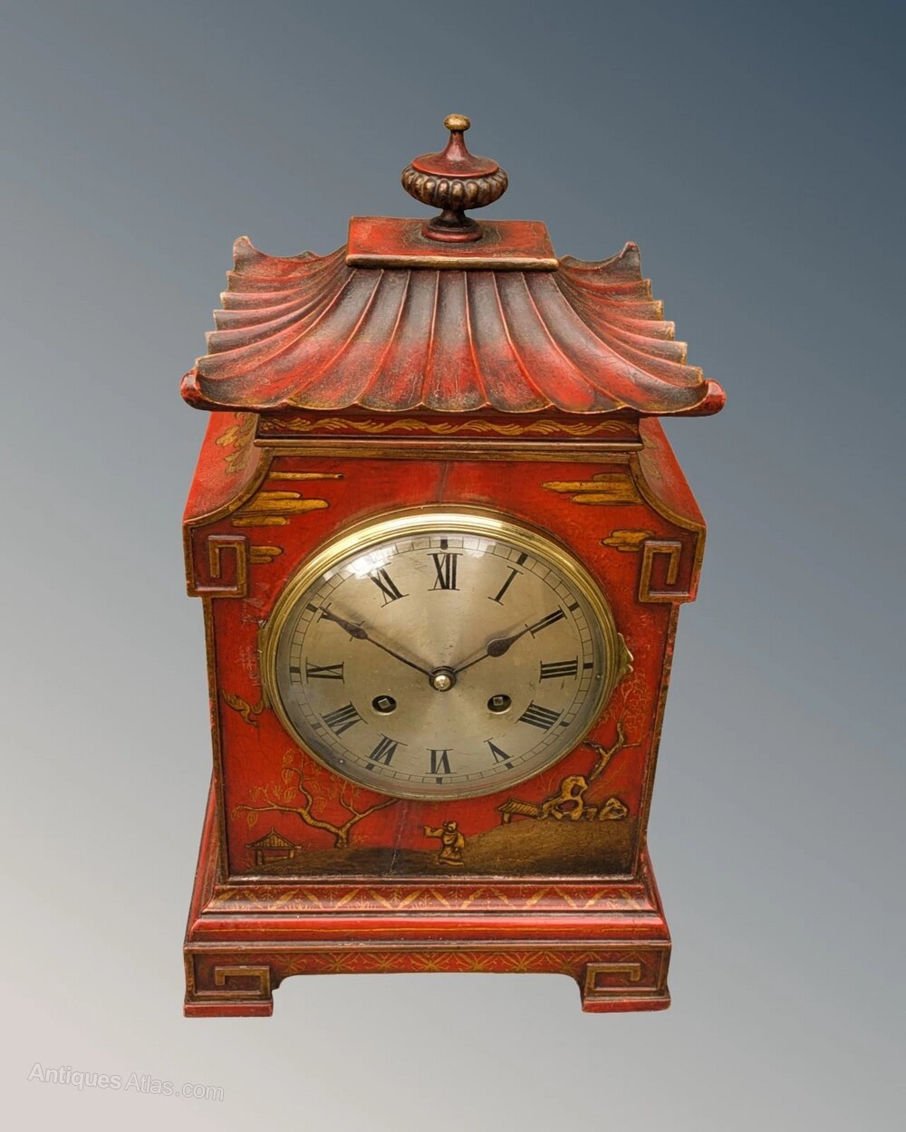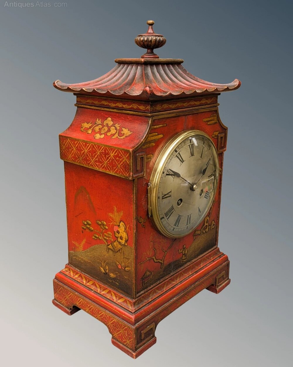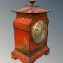 This is a beautiful Chinese chinoiserie mantel clock in super order dating from the late 19th Century. The case is in a striking, warm scarlet colour with hand gilded chinoiserie scenes depicting traditional Chinese landscape. The base has bracket feet of typical Chinese design and the excellent pagoda top has a large central finial. The clock has a silvered dial with Roman numerals and winds on a key running for eight days striking on a gong on the hour and half hour.
