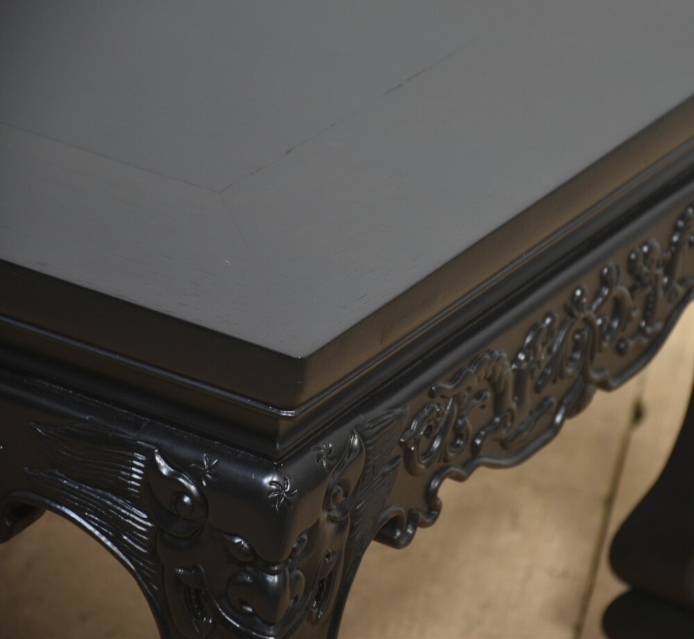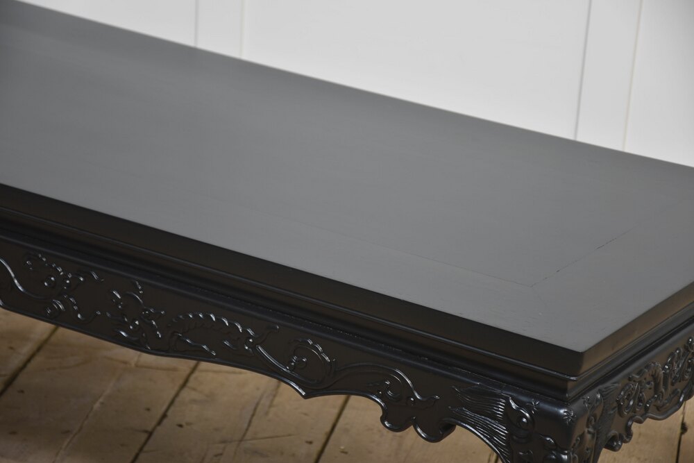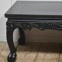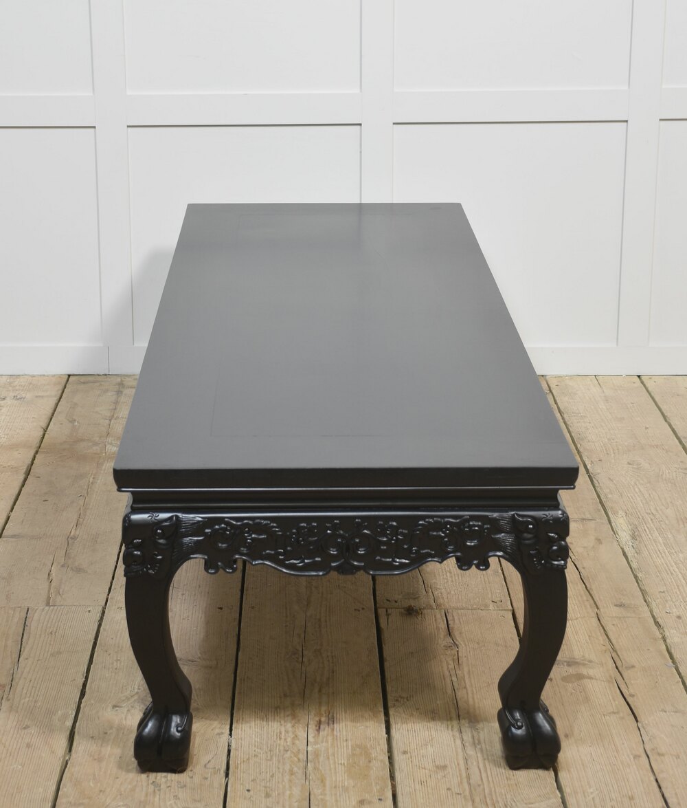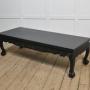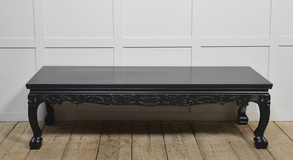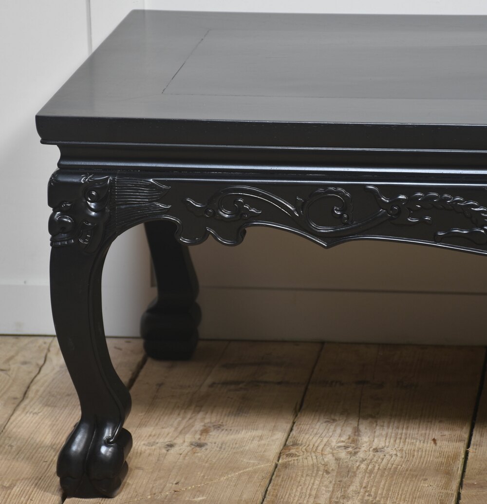 Chinese hardwood low coffee table, of rectangular form with shaped frieze, raised on cabriole legs terminating in claw and ball feet.