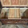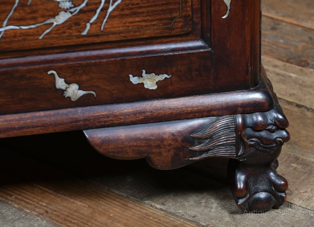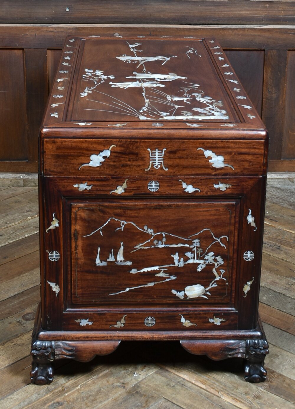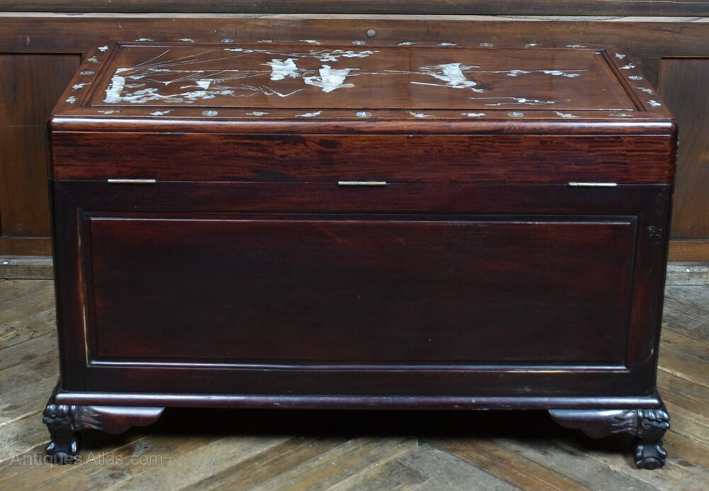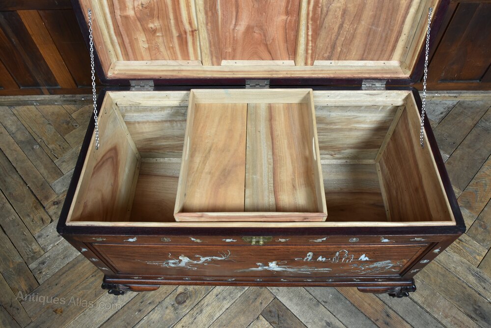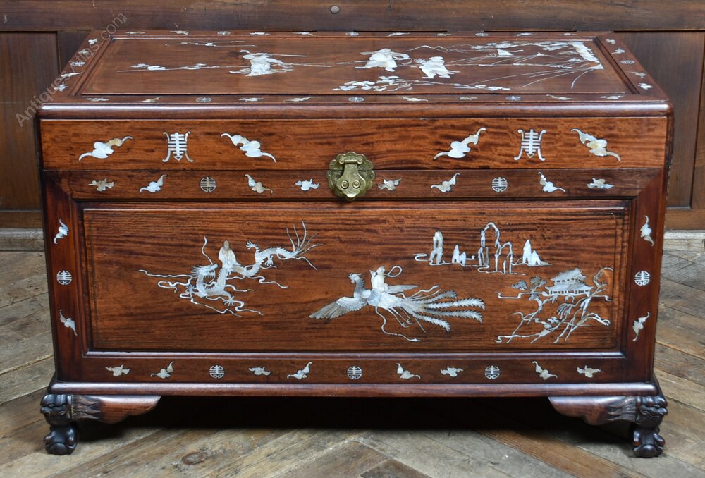 A finely crafted Chinese hardwood blanket box, richly lined with aromatic camphor wood. The interior is clean and retains its original removable tray. The exterior is adorned with intricate mother-of-pearl inlays depicting traditional symbols of good fortune — from mythical creatures to auspicious birds and bat motifs — all executed with remarkable delicacy. Raised on carved feet and fitted with a brass latch, it is a striking and functional piece that beautifully unites artistry, symbolism, and practical storage.