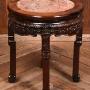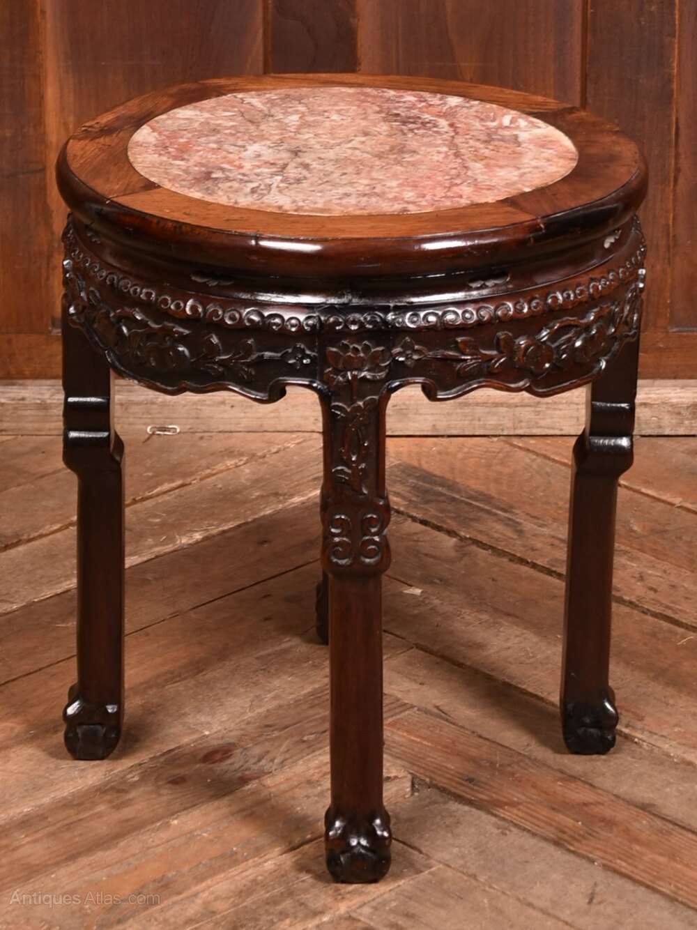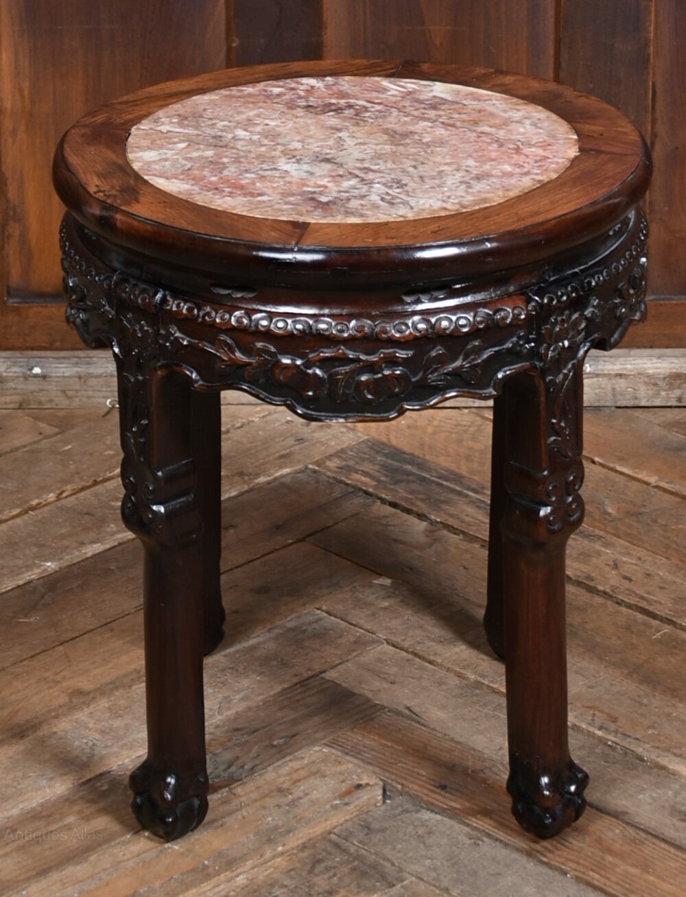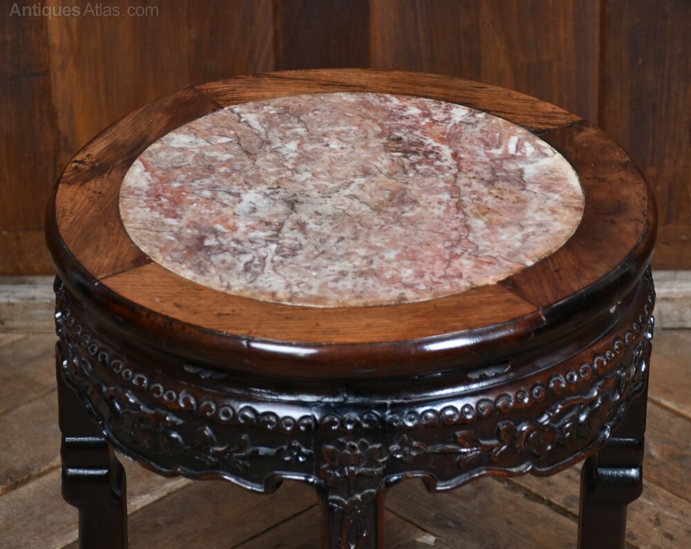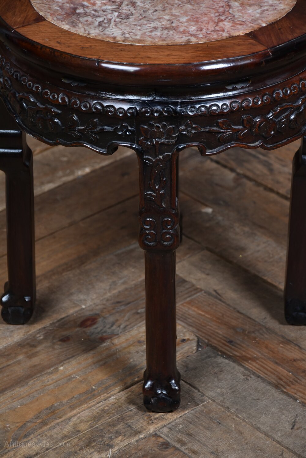 A superb-quality 19th Century Chinese plant stand or lamp table, presented in good antique condition. The circular top is inset with variegated pink marble, framed by a beautifully carved apron with flowing contours. Raised on four square legs, each intricately carved and terminating in classic claw and ball feet. As with all antiques, minor imperfections speak to its age, but this is a solid, richly coloured piece—skilfully crafted and visually striking in any setting.
