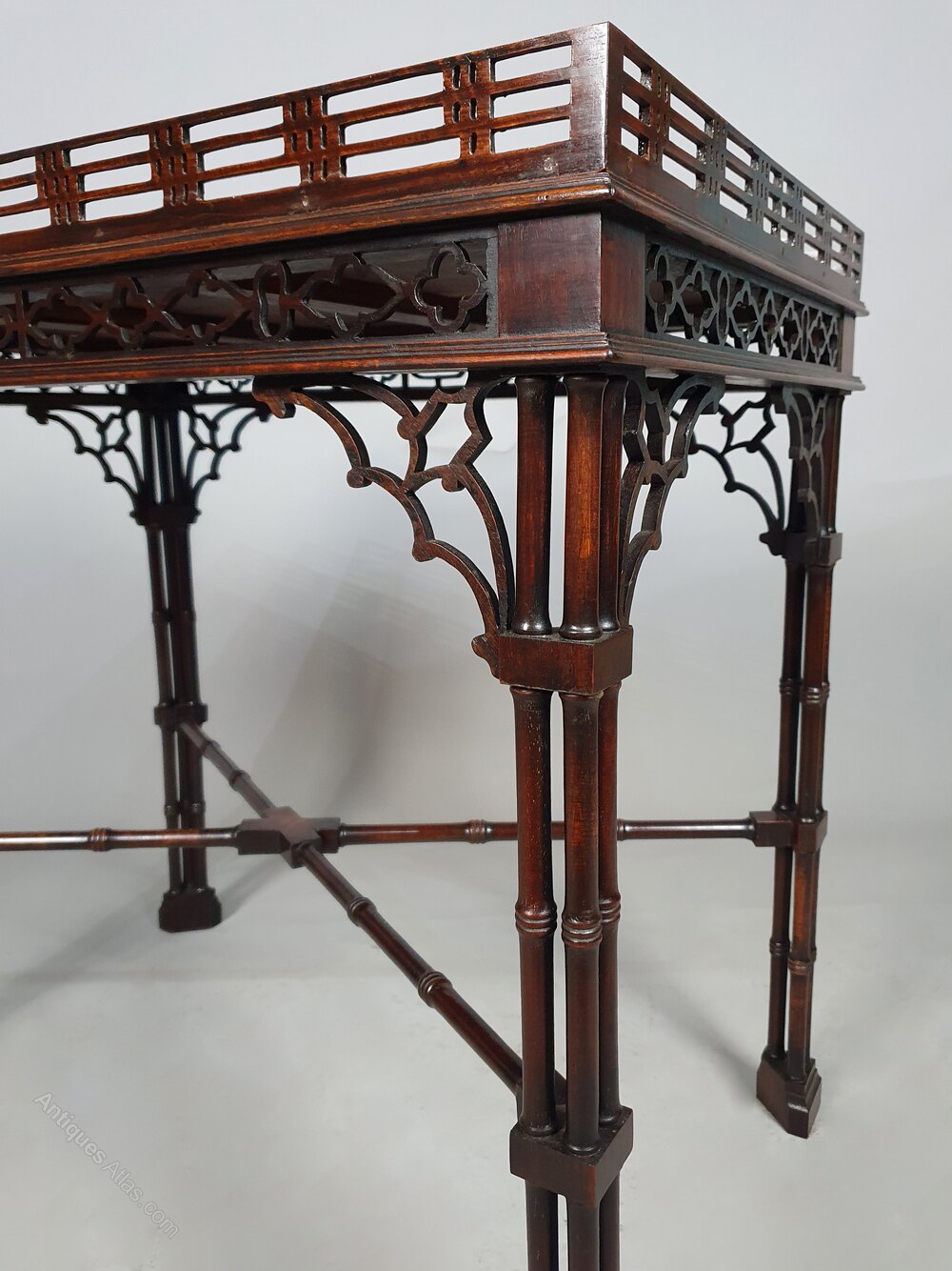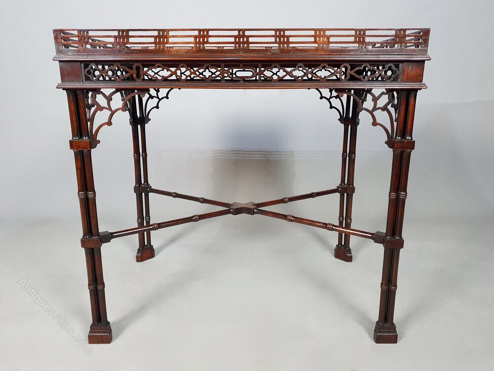 The hand carved detailing to the table is superb with a pierced fretwork gallery, a wide open fretwork carved band of Gothic motifs to the apron and intricately carved large beautiful Gothic spandrels.
