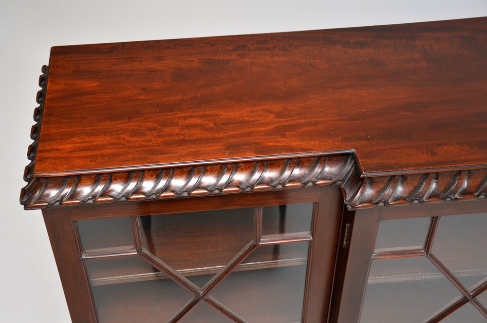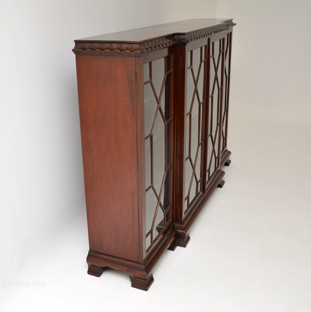 Very strong looking & practicable solid mahogany antique breakfront dwarf bookcase in the Chippendale style, dating from around the 1920’s period & in excellent condition.